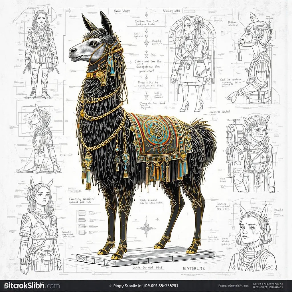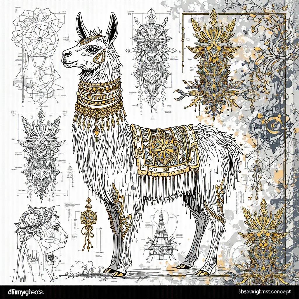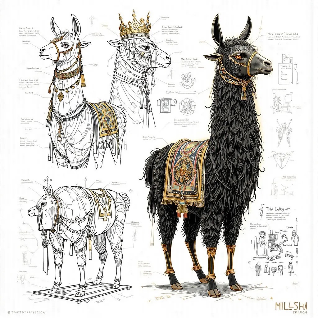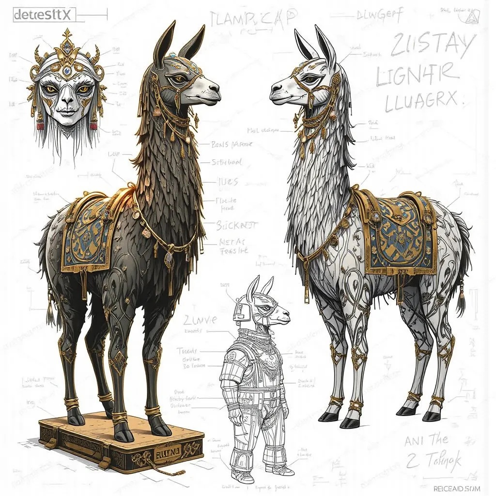 A concept sheet for a llama, detailed with front, back, and side views, including close-up sketches of facial features and accessories, annotated with design notes and labeled components, drawn in blueprint style with glowing trim in gold and base structure in black, presented on a clean white background