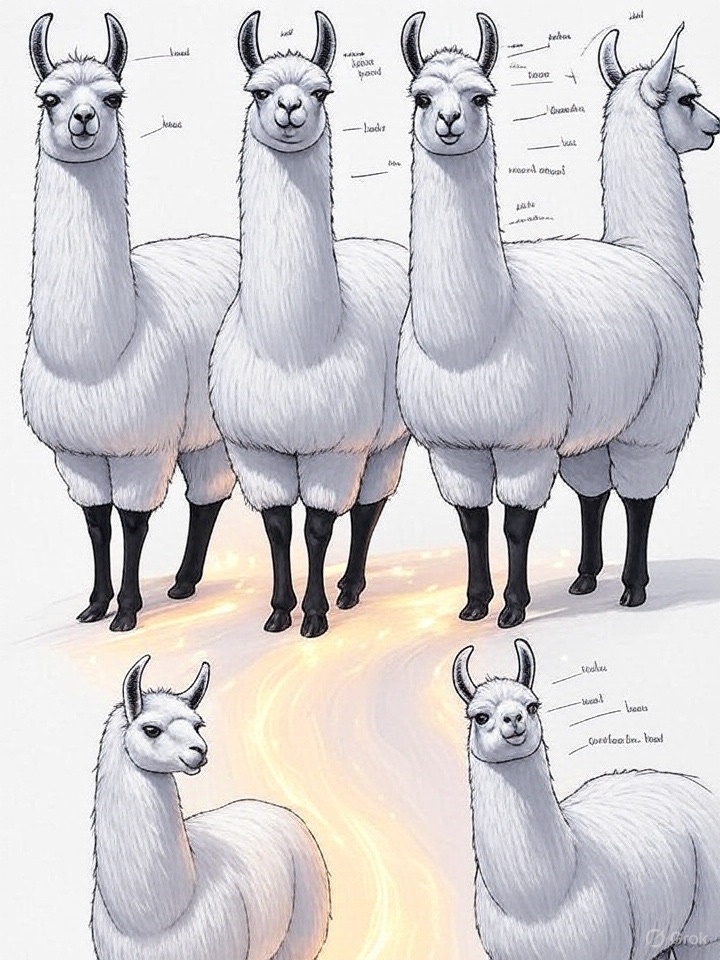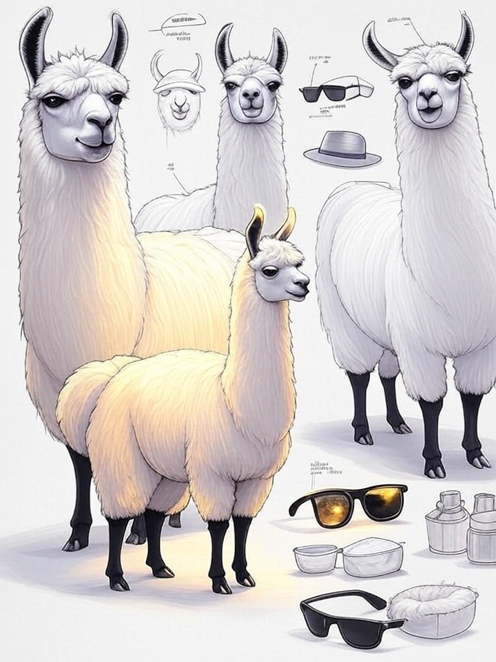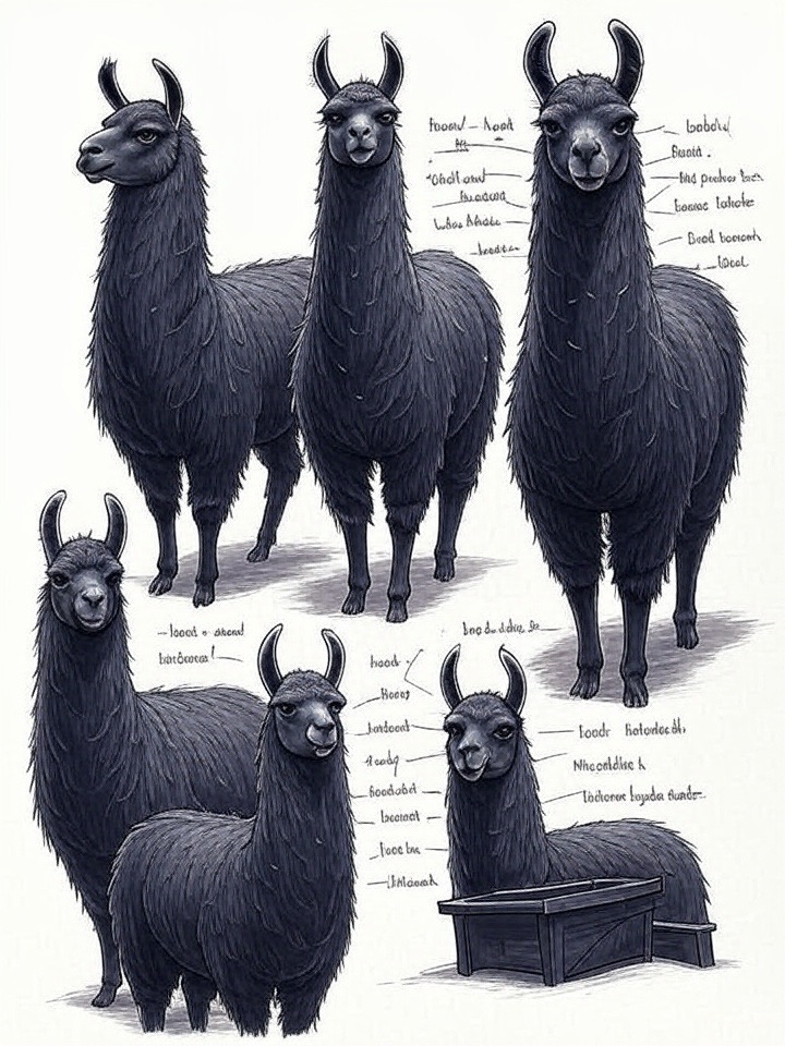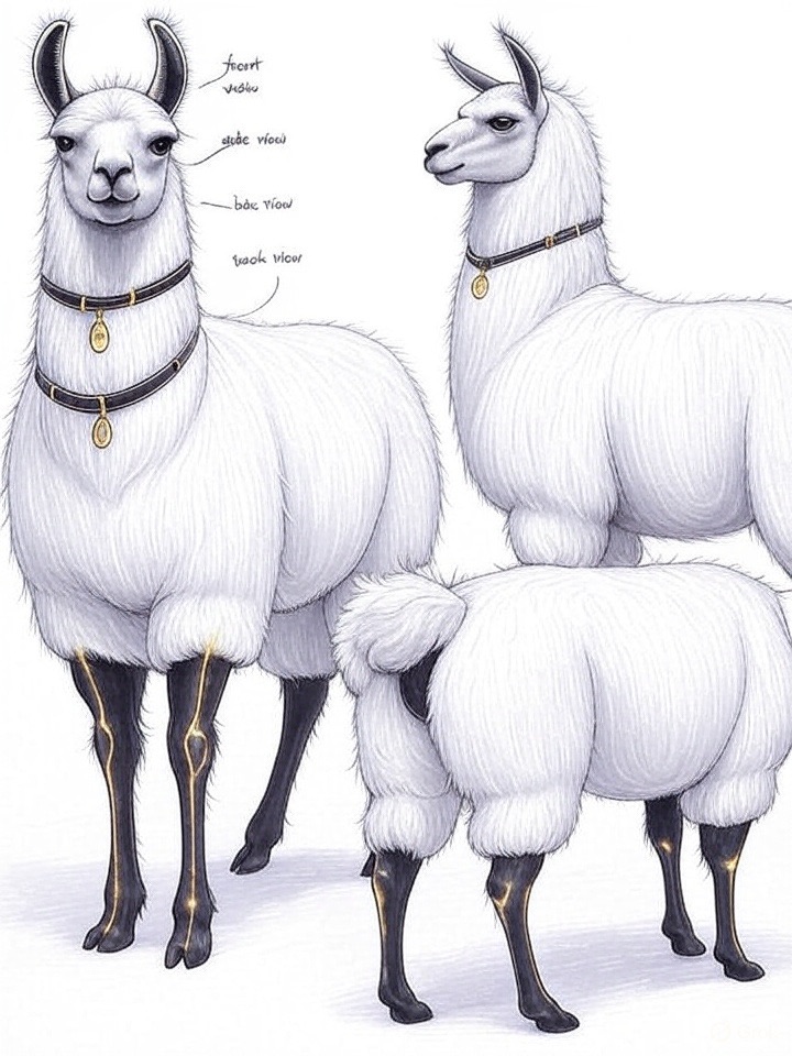 A concept sheet for a llama, detailed with front, back, and side views, including close-up sketches of facial features and accessories, annotated with design notes and labeled components, drawn in blueprint style with glowing trim in gold and base structure in black, presented on a clean white background