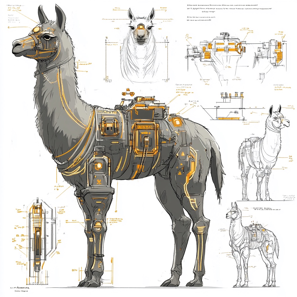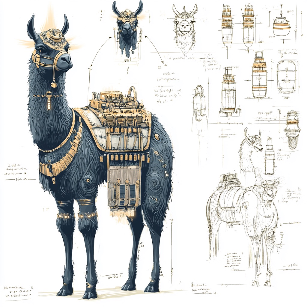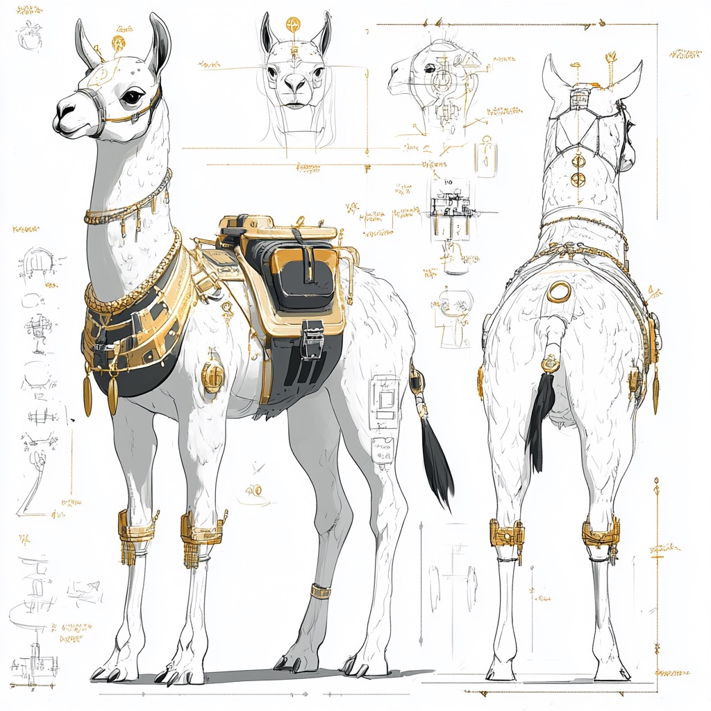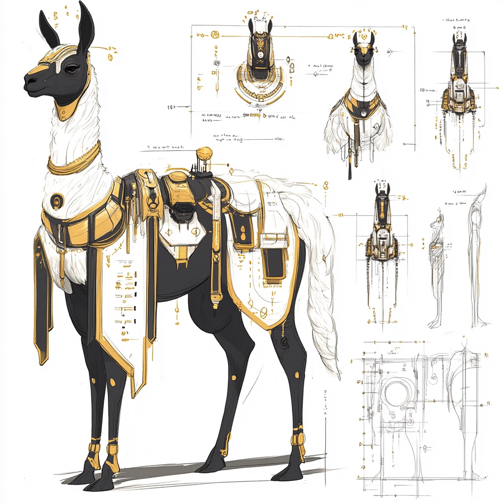 A concept sheet for a llama, detailed with front, back, and side views, including close-up sketches of facial features and accessories, annotated with design notes and labeled components, drawn in blueprint style with glowing trim in gold and base structure in black, presented on a clean white background