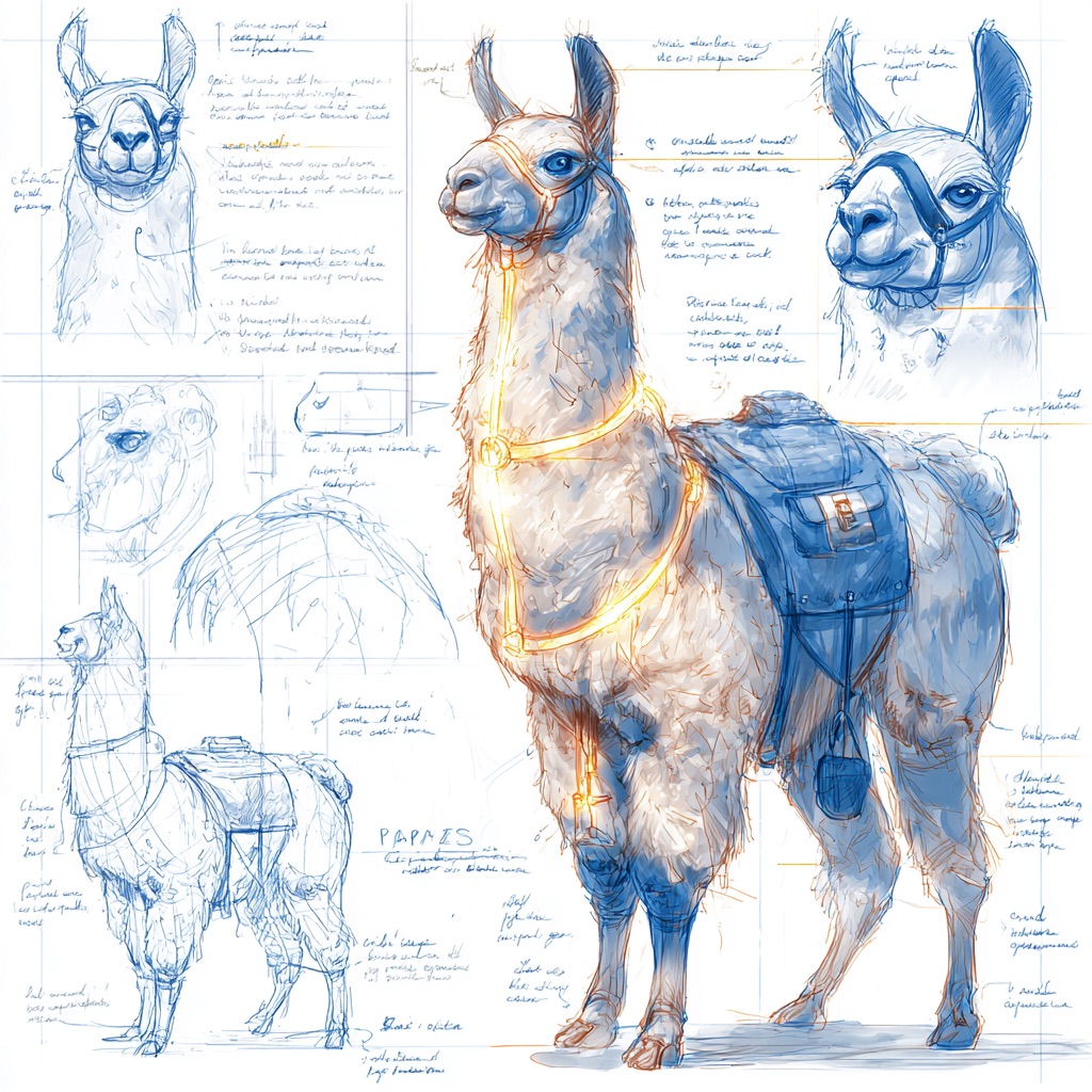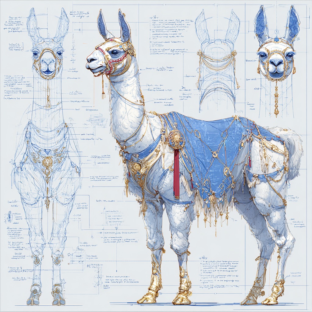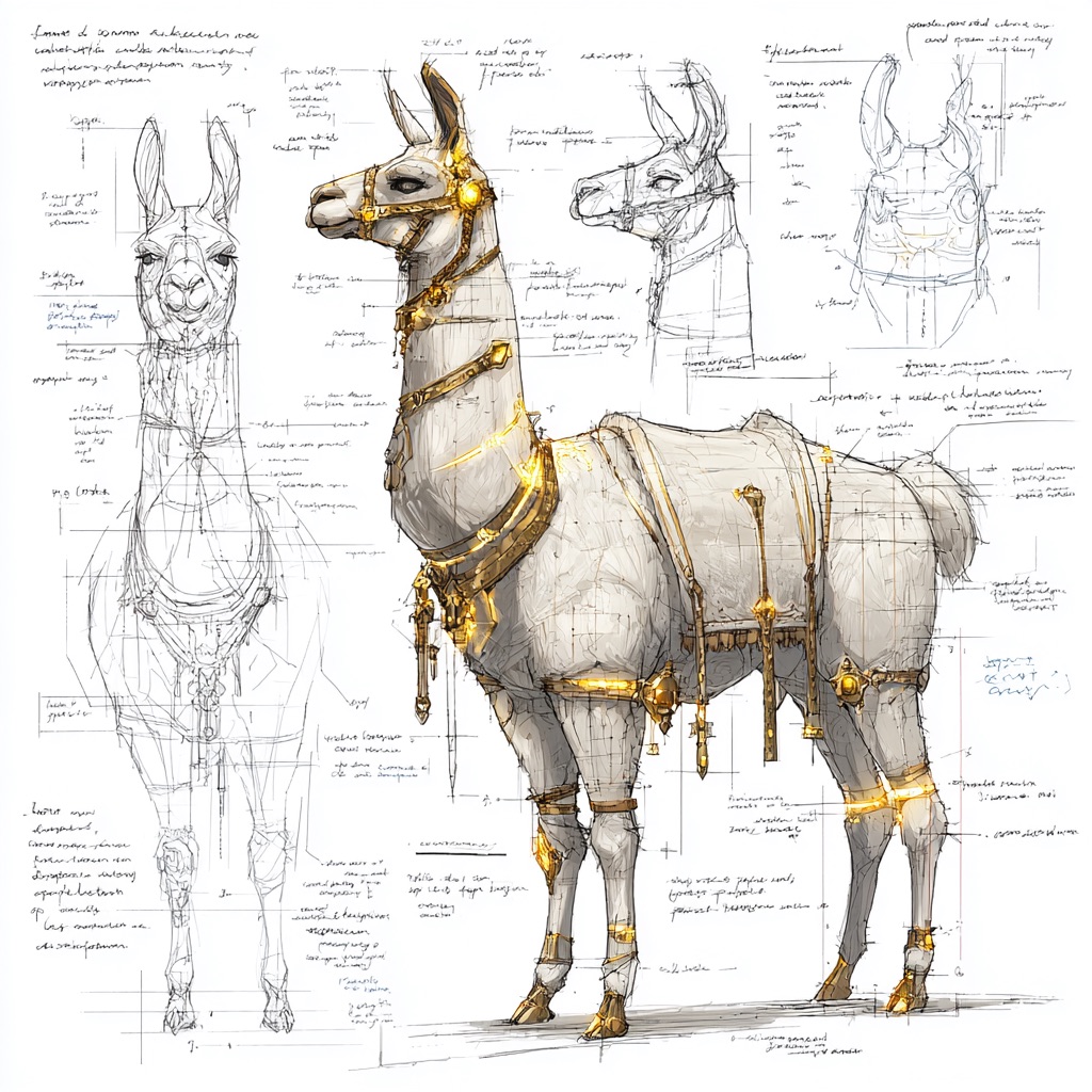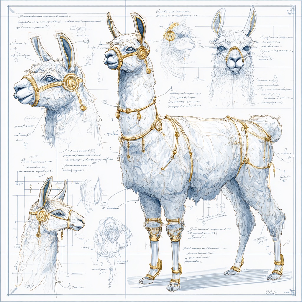 A concept sheet for a llama, detailed with front, back, and side views, including close-up sketches of facial features and accessories, annotated with design notes and labeled components, drawn in blueprint style with glowing trim in gold and base structure in black, presented on a clean white background