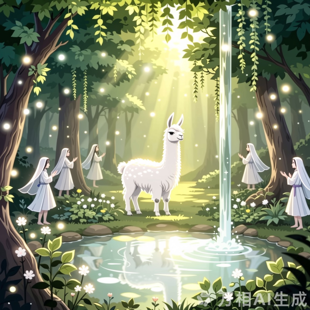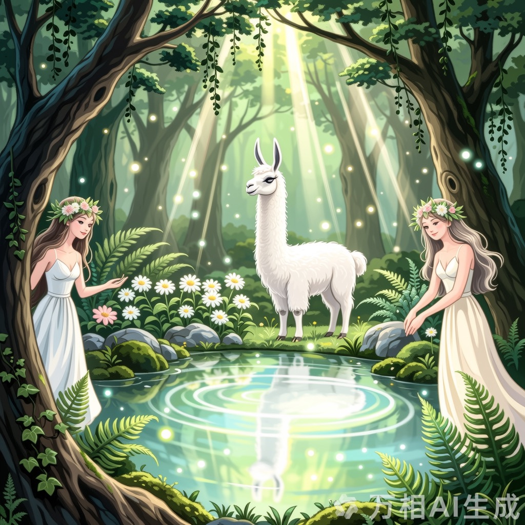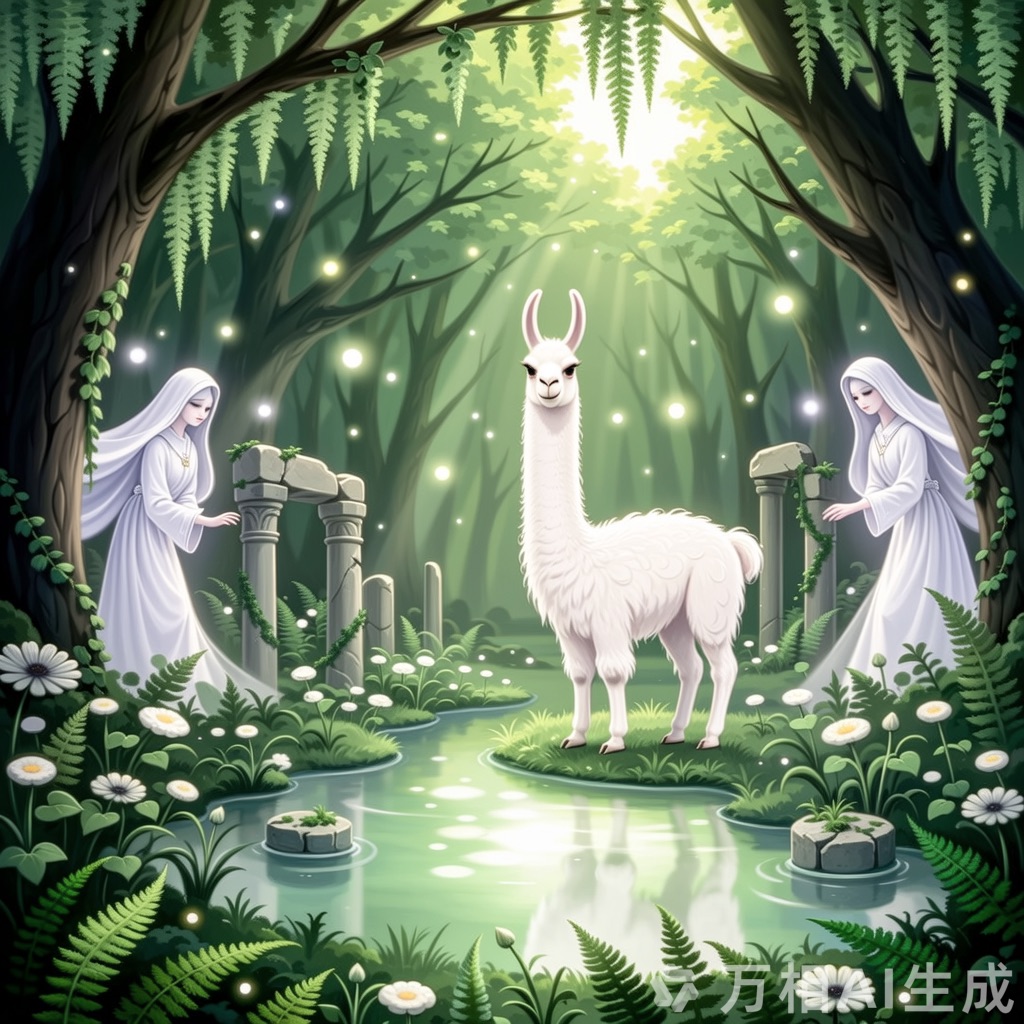 An Arcadian Grove of Divinity scene showcasing llama among lush flora, sacred springs, and elusive woodland nymphs. Infuse soft white and glowing green tones for a serene, pastoral tableau of mythic grace