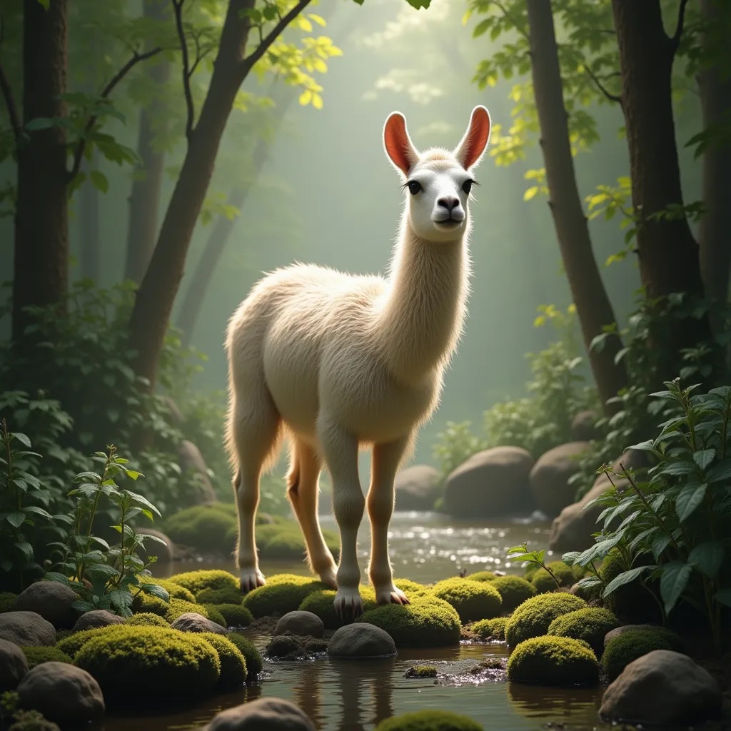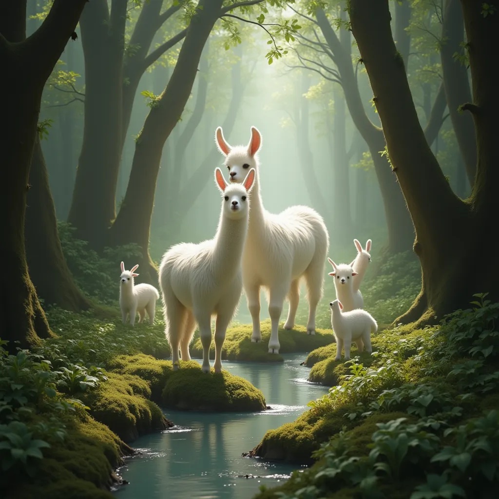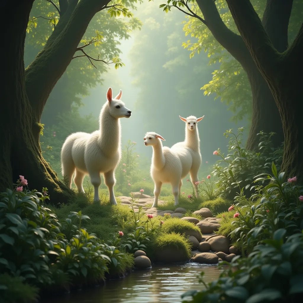 An Arcadian Grove of Divinity scene showcasing llama among lush flora, sacred springs, and elusive woodland nymphs. Infuse soft white and glowing green tones for a serene, pastoral tableau of mythic grace