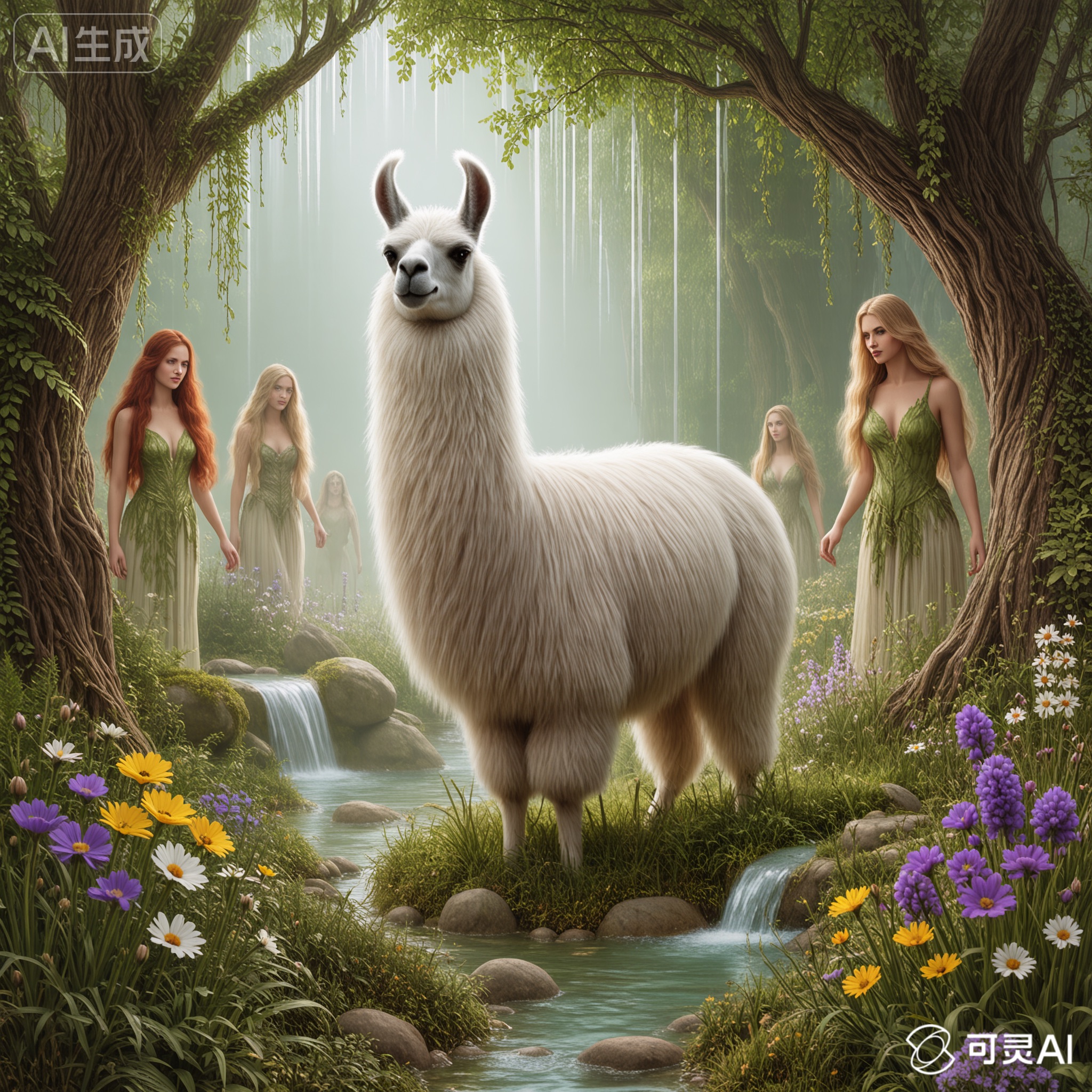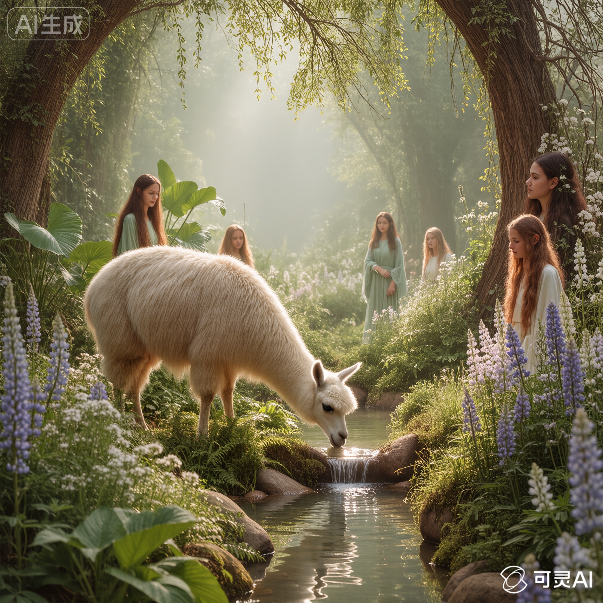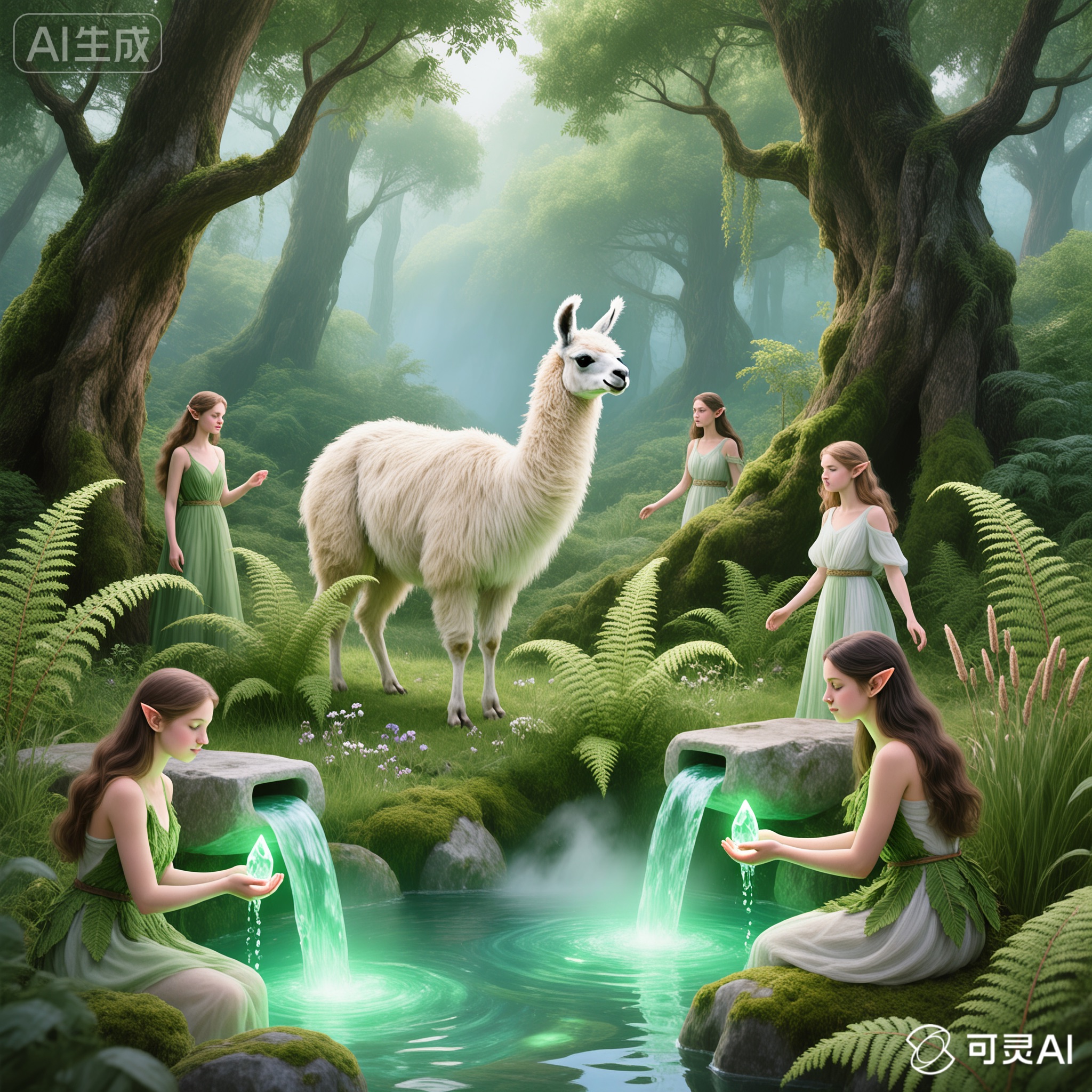 An Arcadian Grove of Divinity scene showcasing llama among lush flora, sacred springs, and elusive woodland nymphs. Infuse soft white and glowing green tones for a serene, pastoral tableau of mythic grace