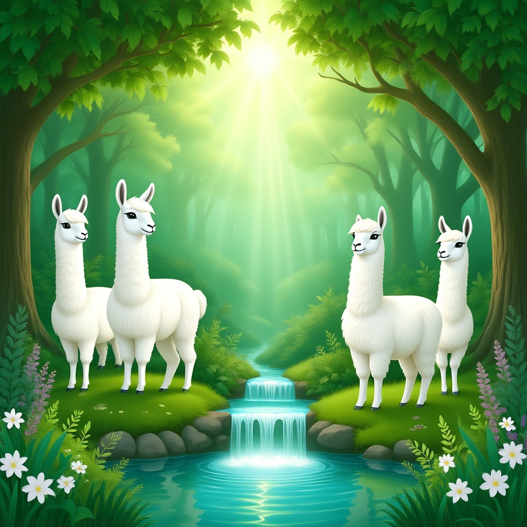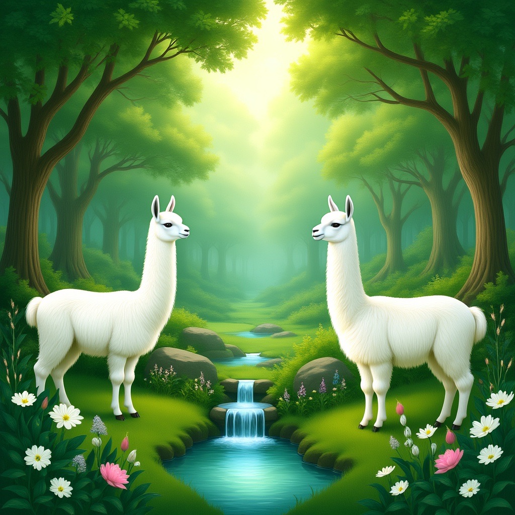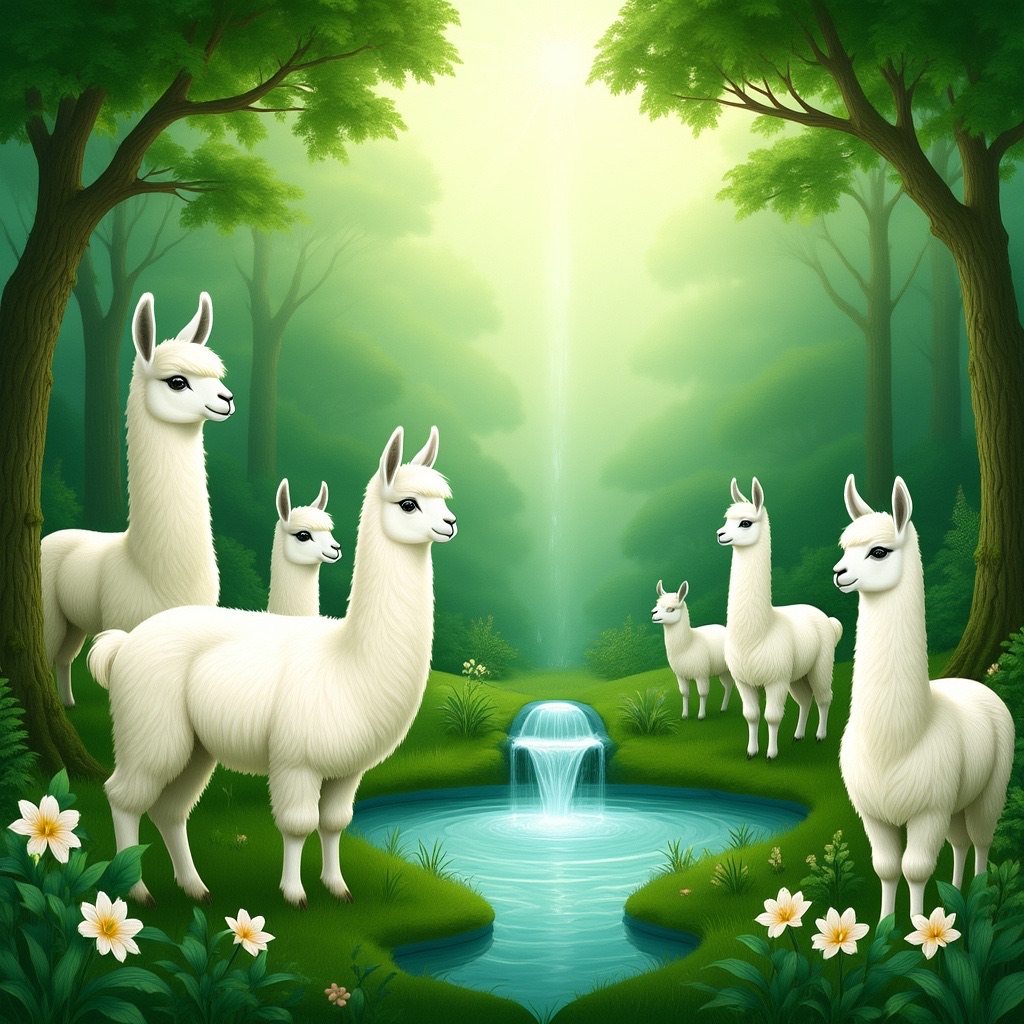 An Arcadian Grove of Divinity scene showcasing llama among lush flora, sacred springs, and elusive woodland nymphs. Infuse soft white and glowing green tones for a serene, pastoral tableau of mythic grace