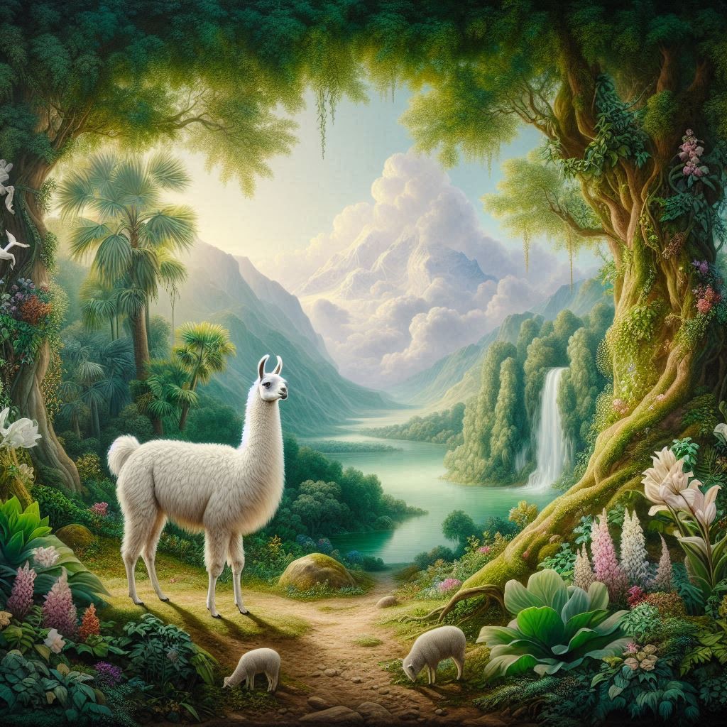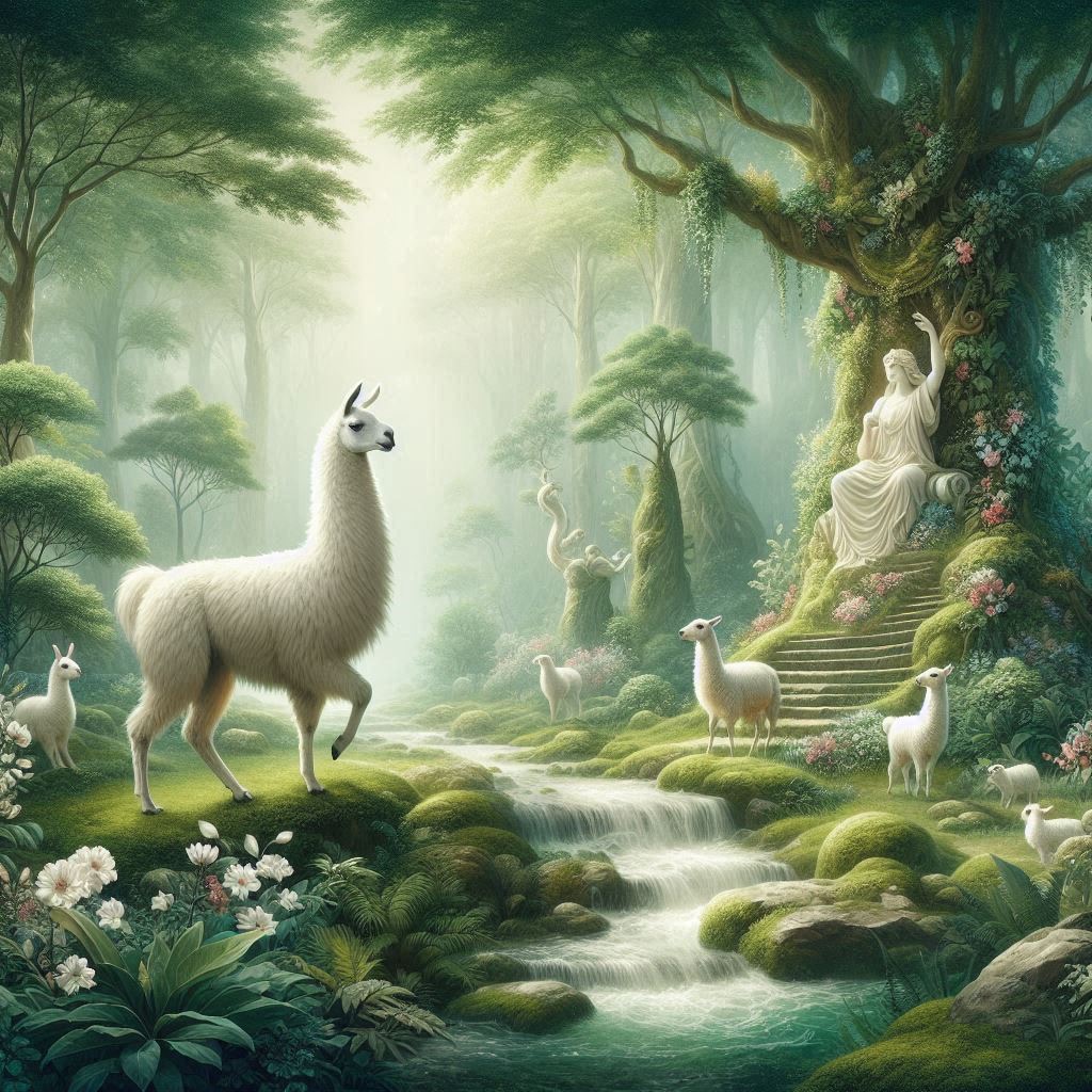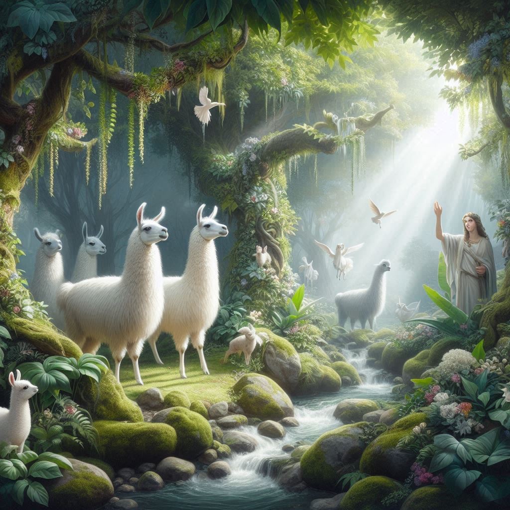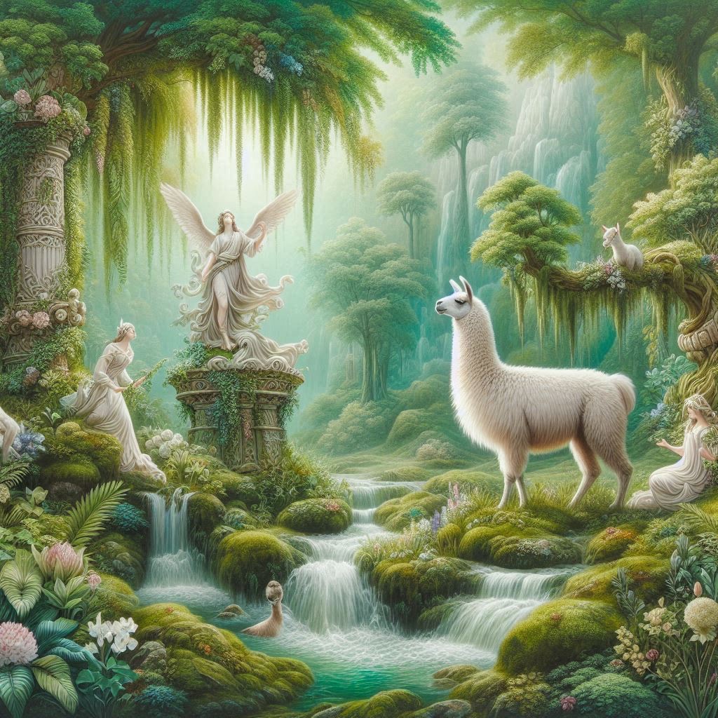 An Arcadian Grove of Divinity scene showcasing llama among lush flora, sacred springs, and elusive woodland nymphs. Infuse soft white and glowing green tones for a serene, pastoral tableau of mythic grace
