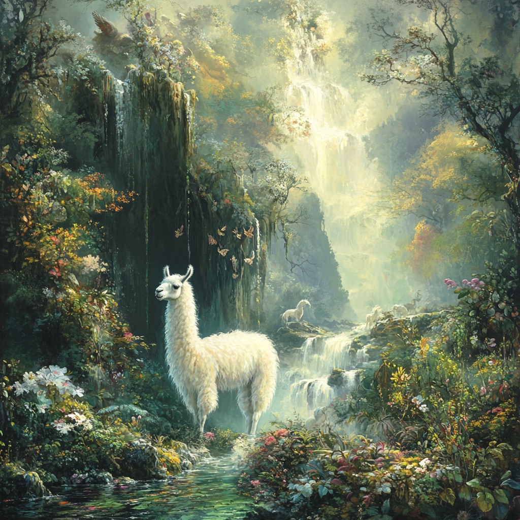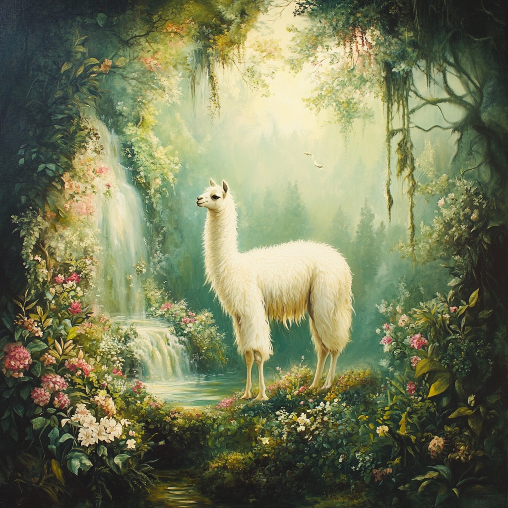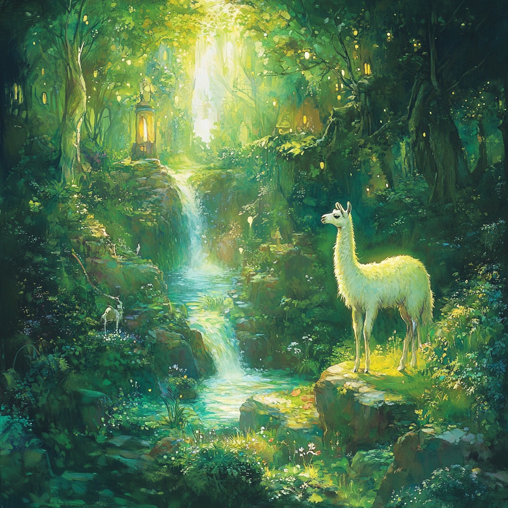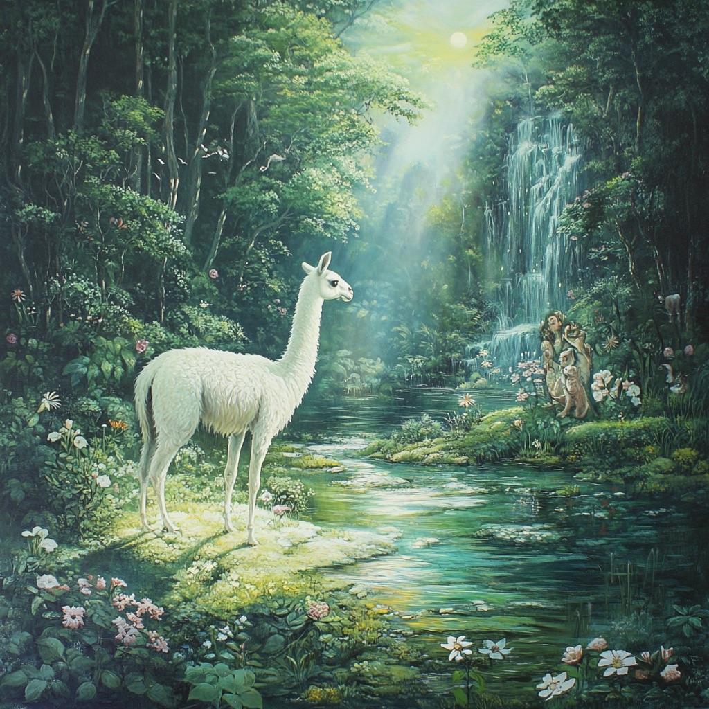 An Arcadian Grove of Divinity scene showcasing llama among lush flora, sacred springs, and elusive woodland nymphs. Infuse soft white and glowing green tones for a serene, pastoral tableau of mythic grace