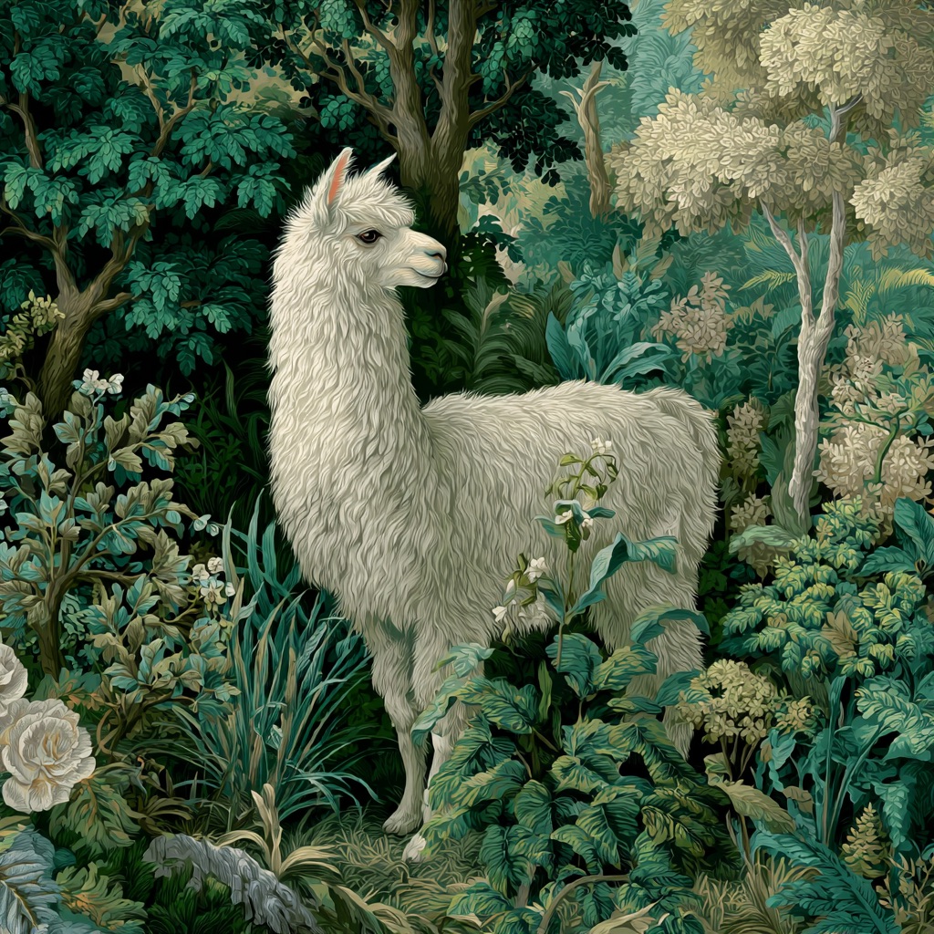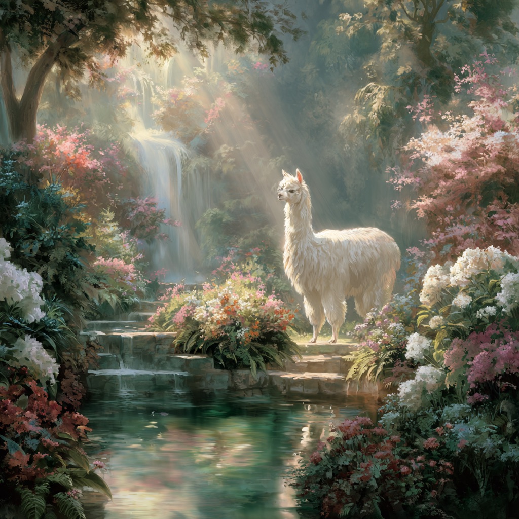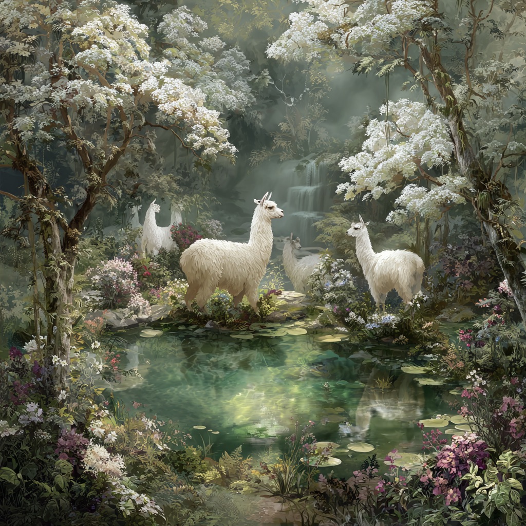 An Arcadian Grove of Divinity scene showcasing llama among lush flora, sacred springs, and elusive woodland nymphs. Infuse soft white and glowing green tones for a serene, pastoral tableau of mythic grace