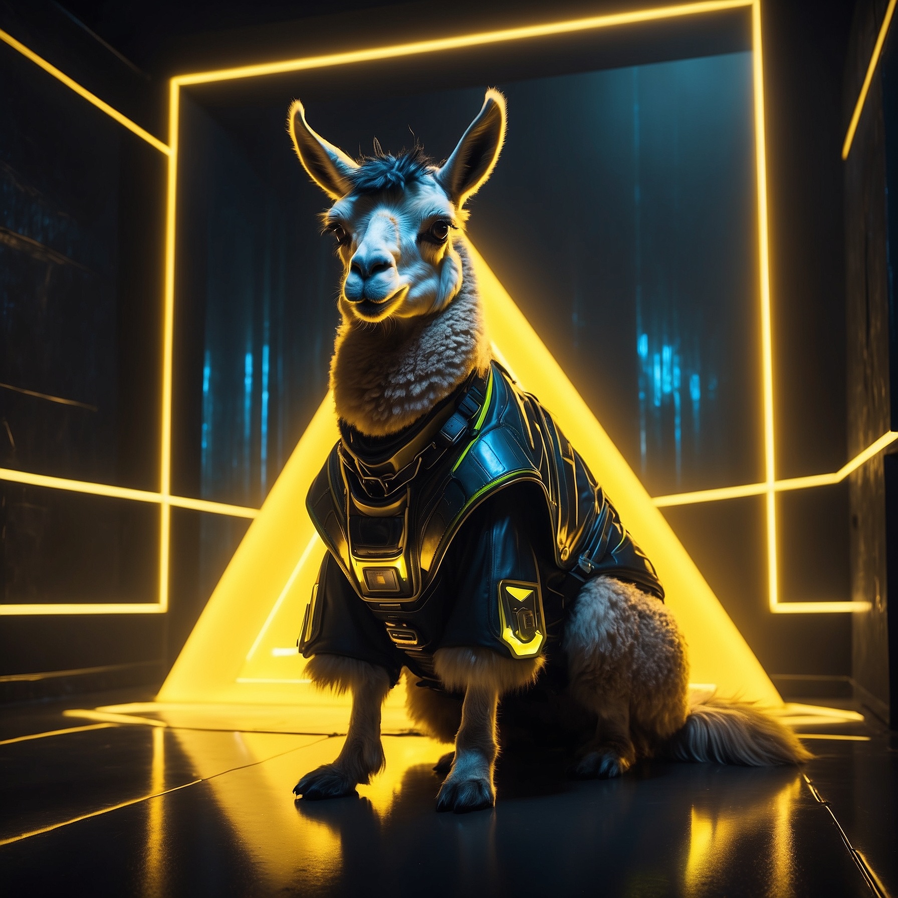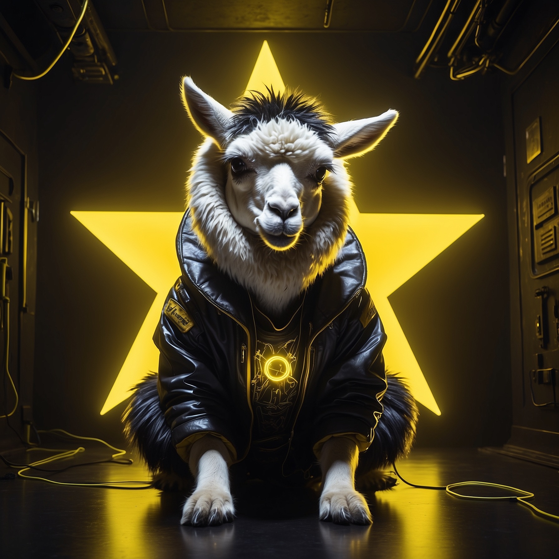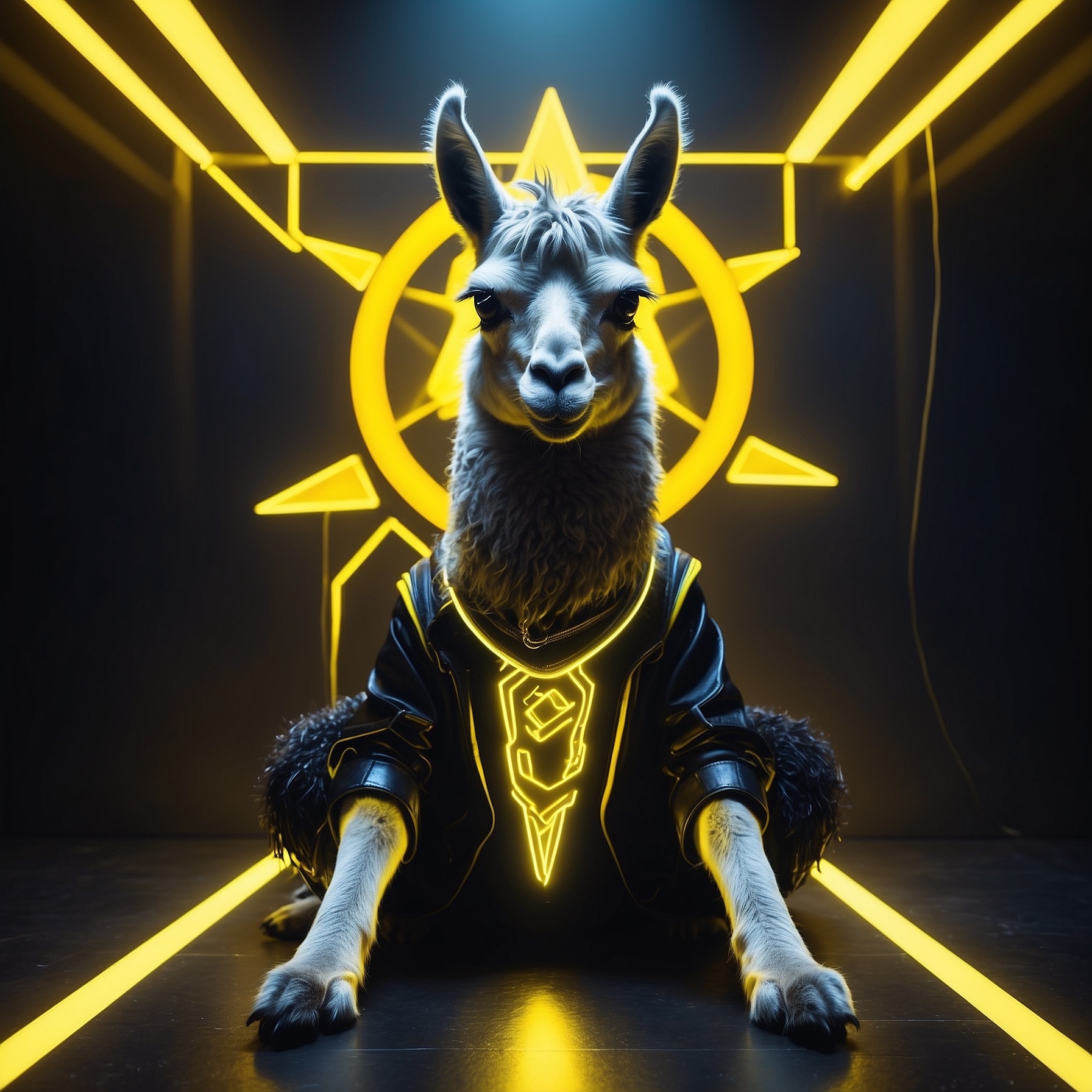 A futuristic, neon-lit portrait of llama, crouching confidently in a moody, black-toned room. The llama hold a large, glowing star that cuts through the center of the image, casting bright yellow reflections across their skin, outfit, and surroundings. The entire scene is bathed in electric yellow and deep gold lighting, creating a high-contrast, edgy, and surreal atmosphere with a sci-fi fashion vibe.