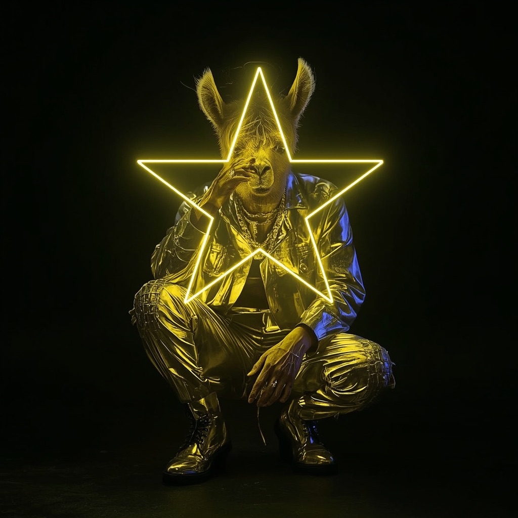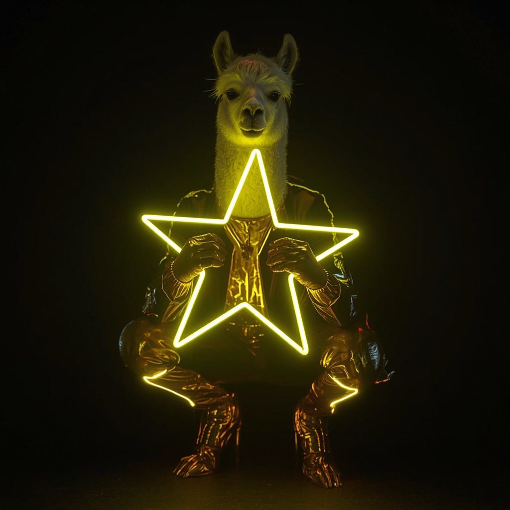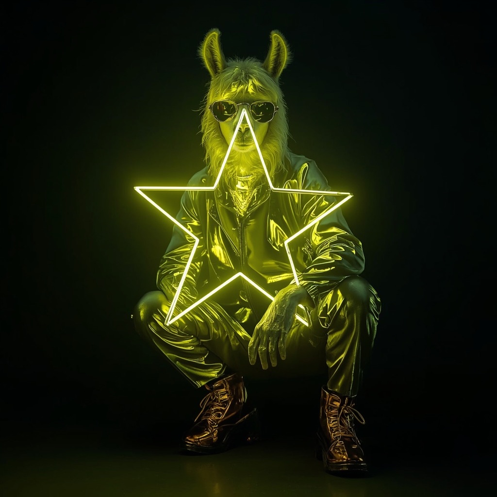 A futuristic, neon-lit portrait of llama, crouching confidently in a moody, black-toned room. The llama hold a large, glowing star that cuts through the center of the image, casting bright yellow reflections across their skin, outfit, and surroundings. The entire scene is bathed in electric yellow and deep gold lighting, creating a high-contrast, edgy, and surreal atmosphere with a sci-fi fashion vibe.