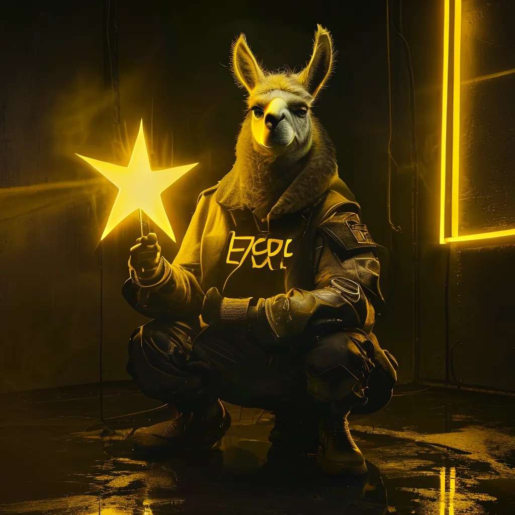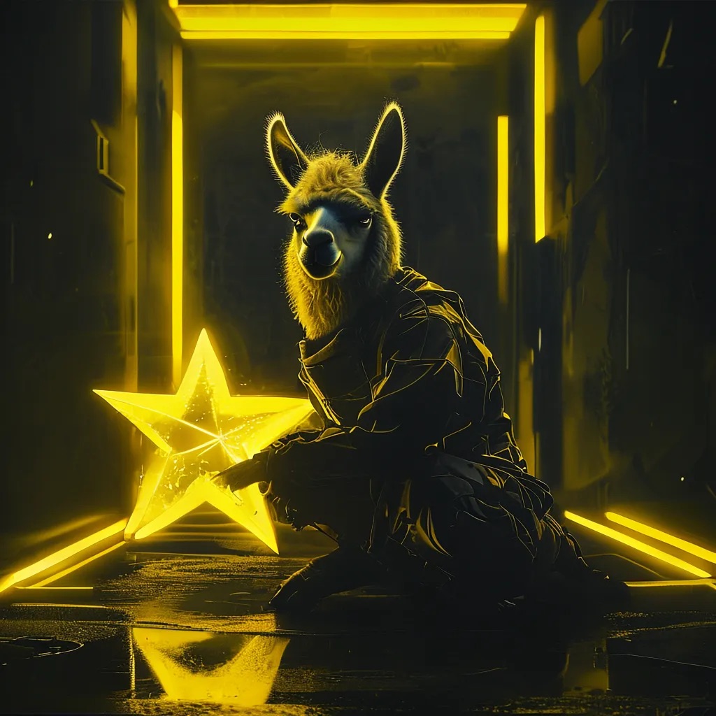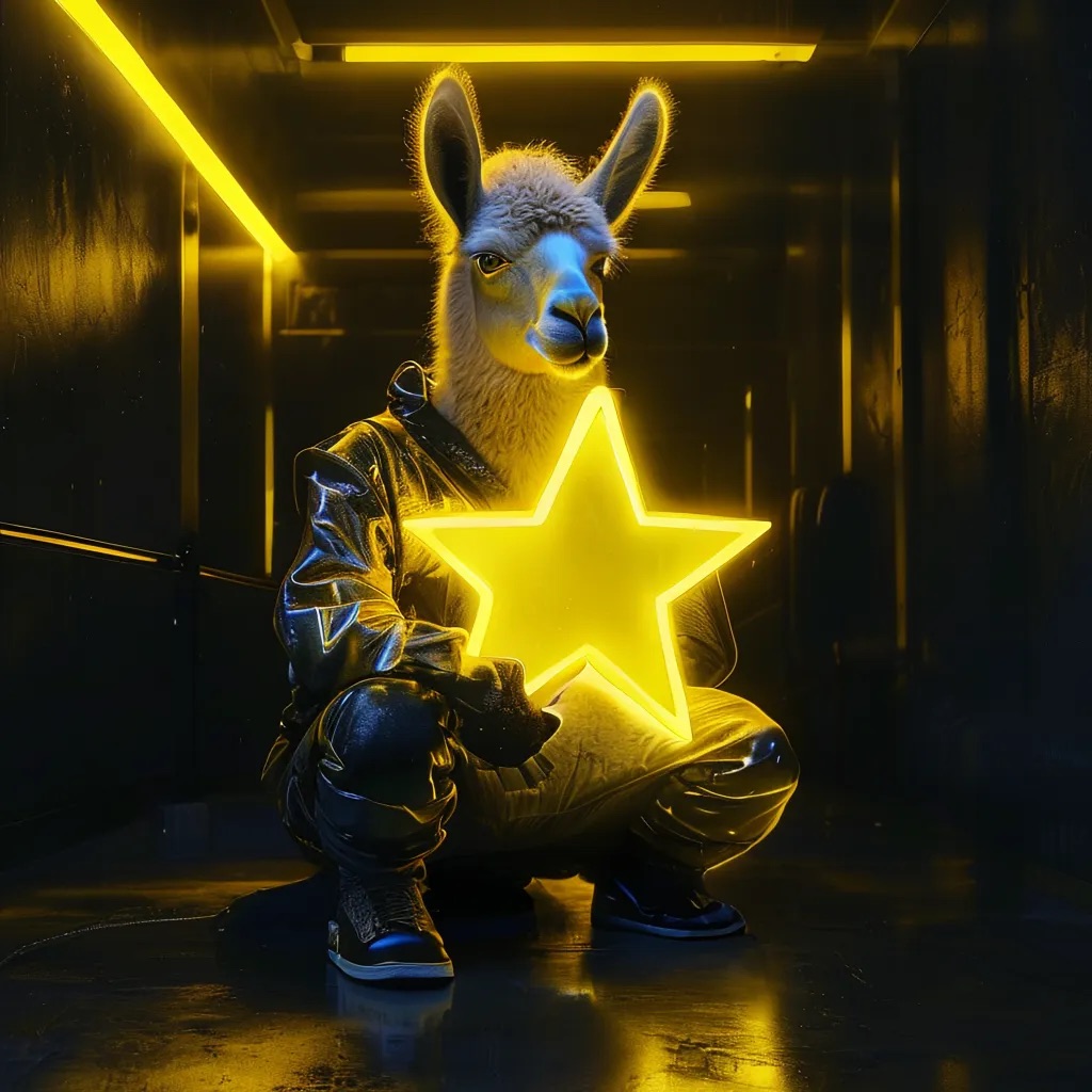 A futuristic, neon-lit portrait of llama, crouching confidently in a moody, black-toned room. The llama hold a large, glowing star that cuts through the center of the image, casting bright yellow reflections across their skin, outfit, and surroundings. The entire scene is bathed in electric yellow and deep gold lighting, creating a high-contrast, edgy, and surreal atmosphere with a sci-fi fashion vibe.