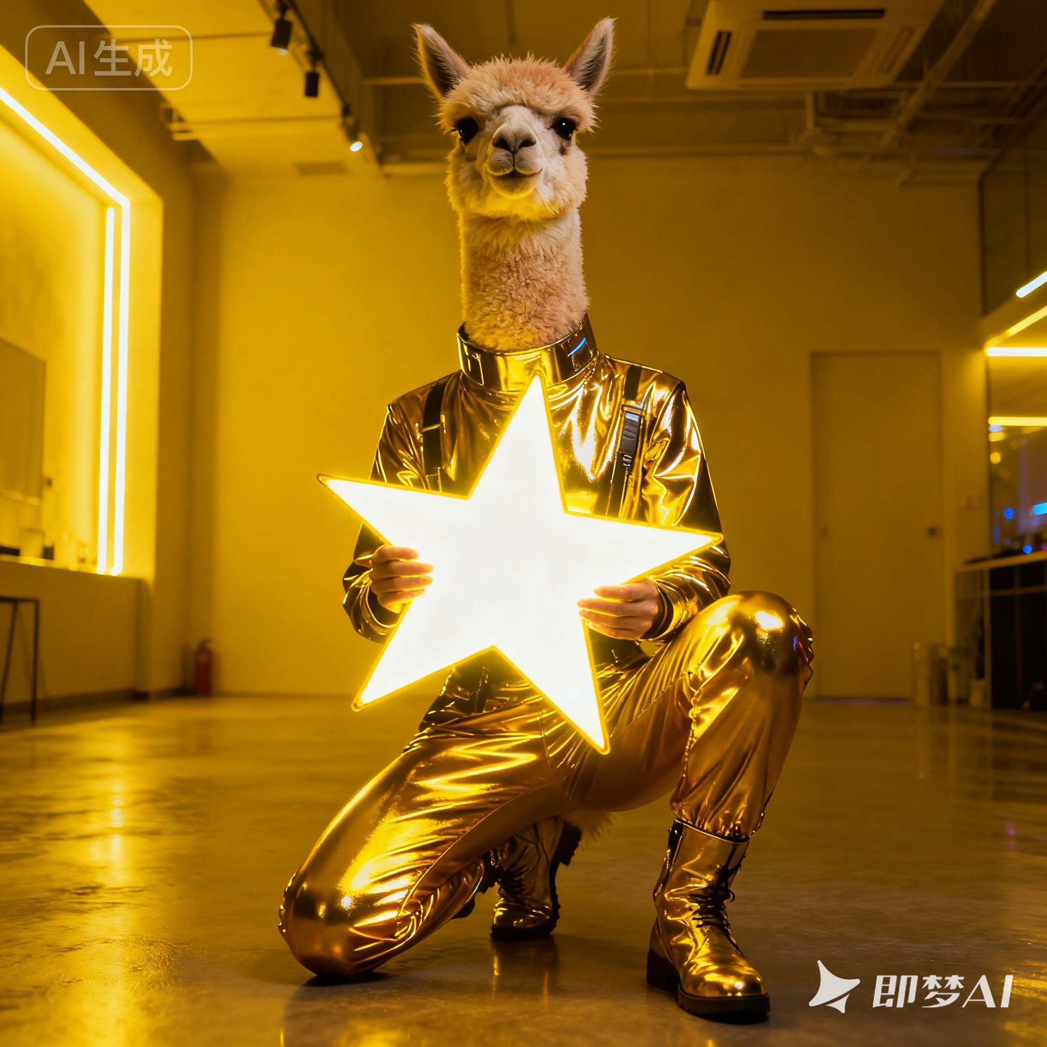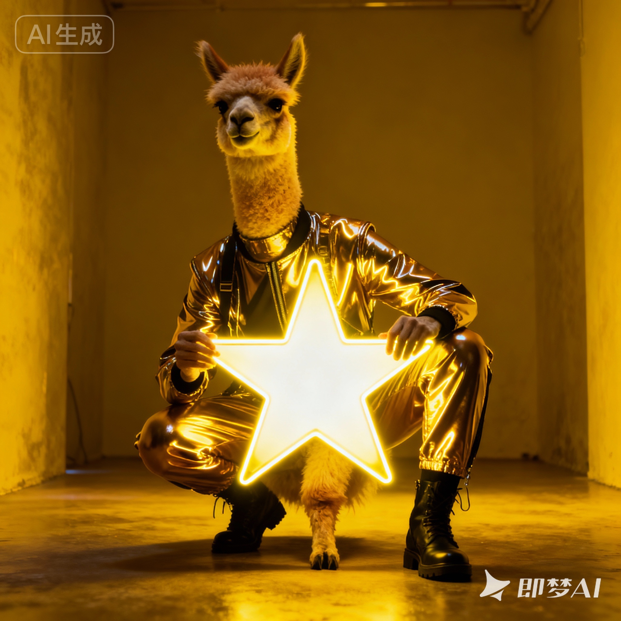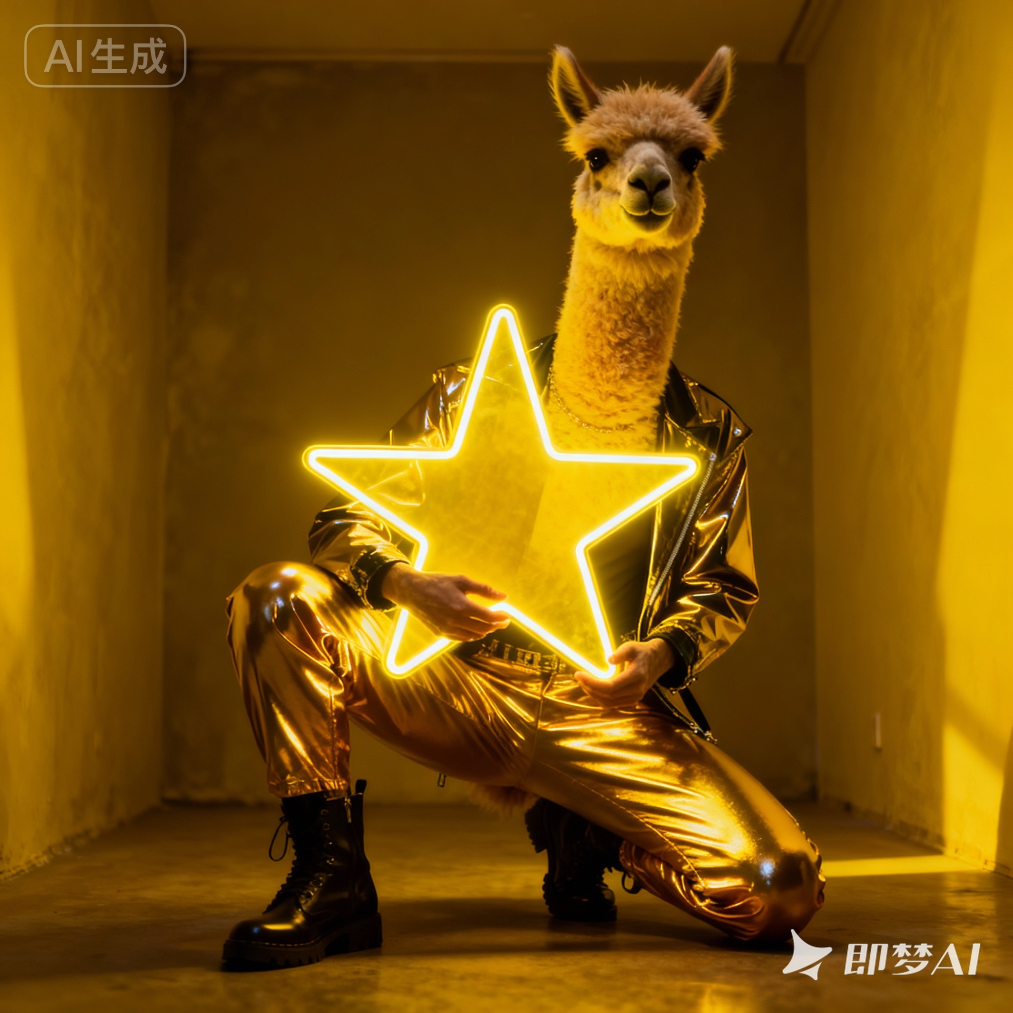 A futuristic, neon-lit portrait of llama, crouching confidently in a moody, black-toned room. The llama hold a large, glowing star that cuts through the center of the image, casting bright yellow reflections across their skin, outfit, and surroundings. The entire scene is bathed in electric yellow and deep gold lighting, creating a high-contrast, edgy, and surreal atmosphere with a sci-fi fashion vibe.