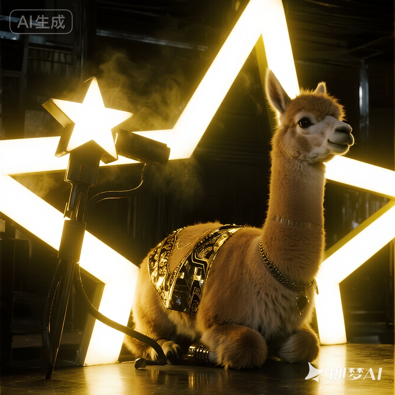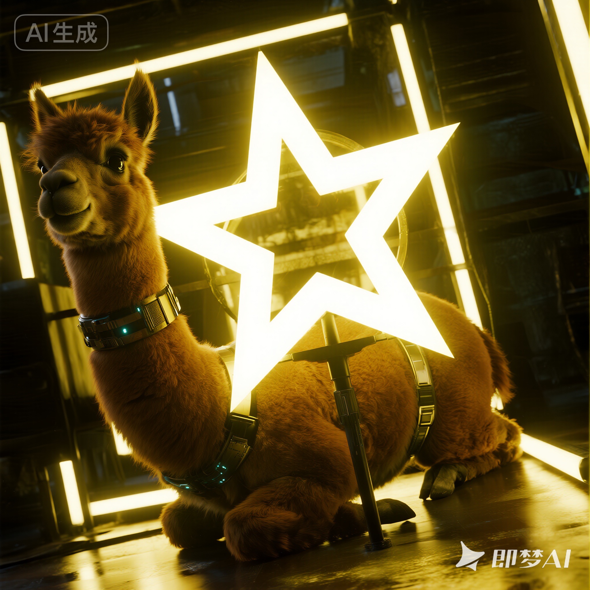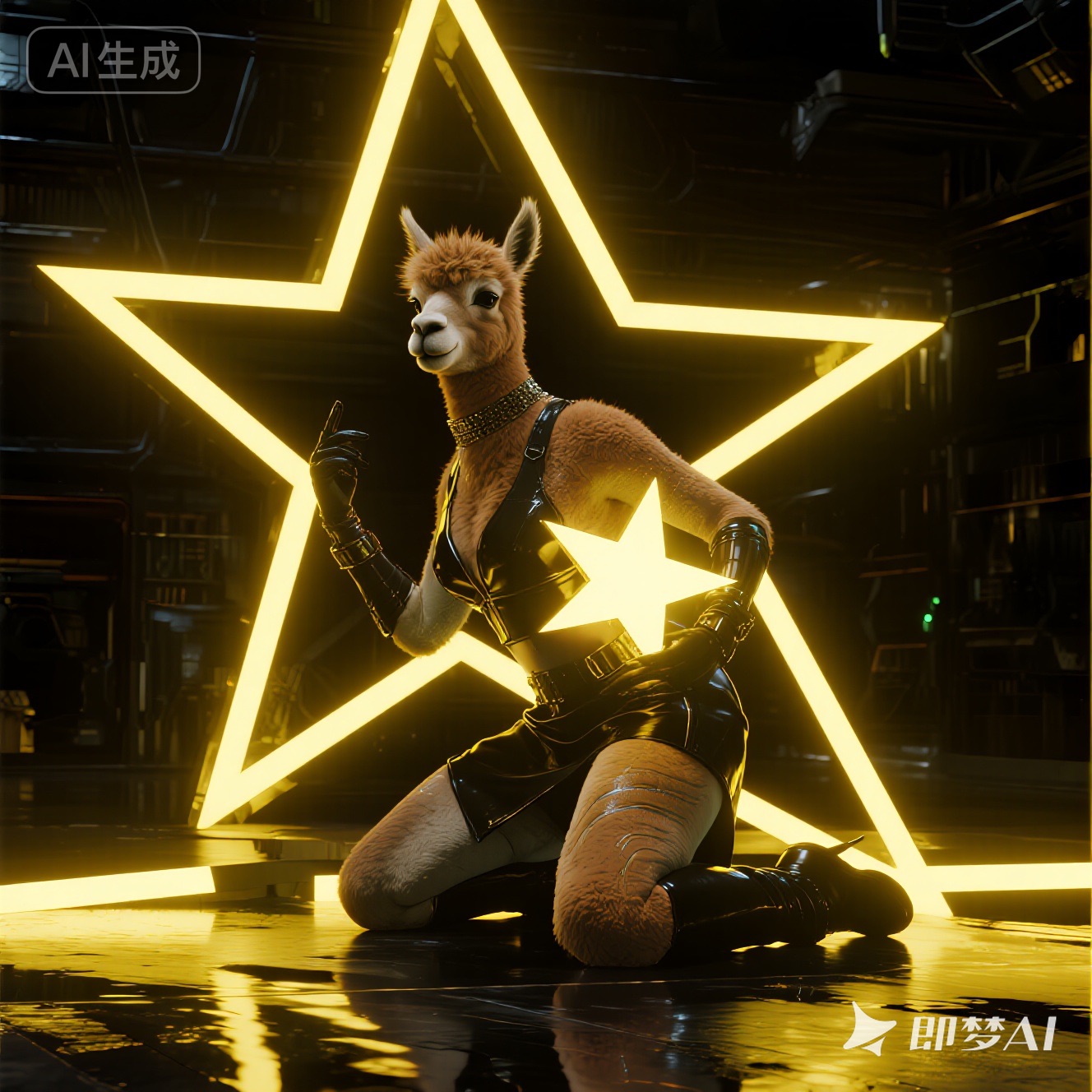 A futuristic, neon-lit portrait of llama, crouching confidently in a moody, black-toned room. The llama hold a large, glowing star that cuts through the center of the image, casting bright yellow reflections across their skin, outfit, and surroundings. The entire scene is bathed in electric yellow and deep gold lighting, creating a high-contrast, edgy, and surreal atmosphere with a sci-fi fashion vibe.