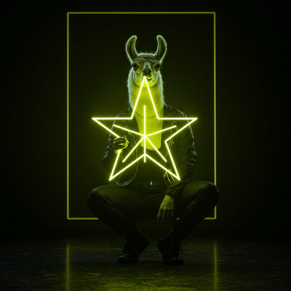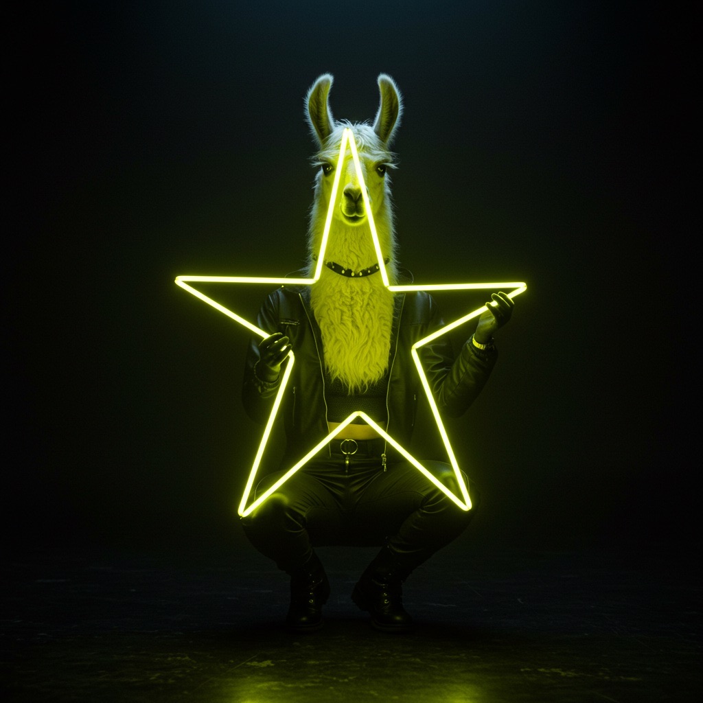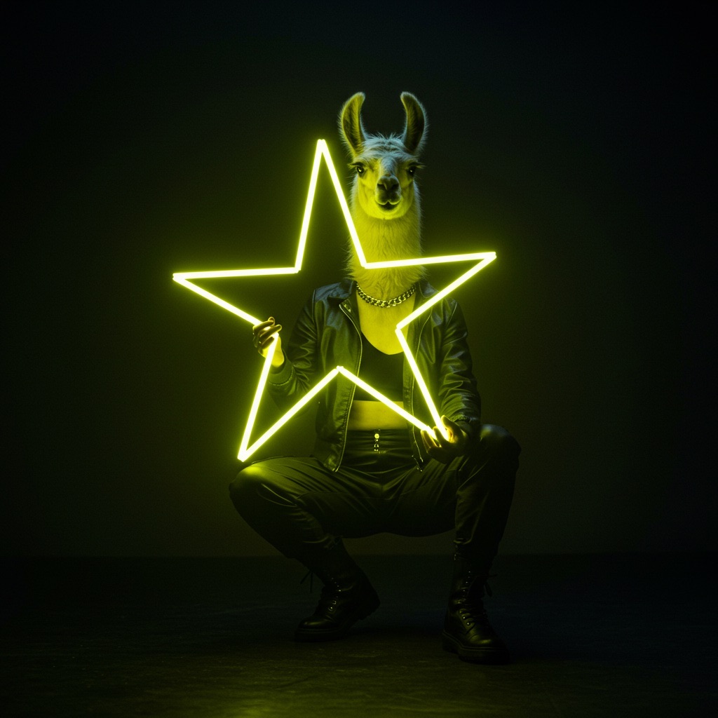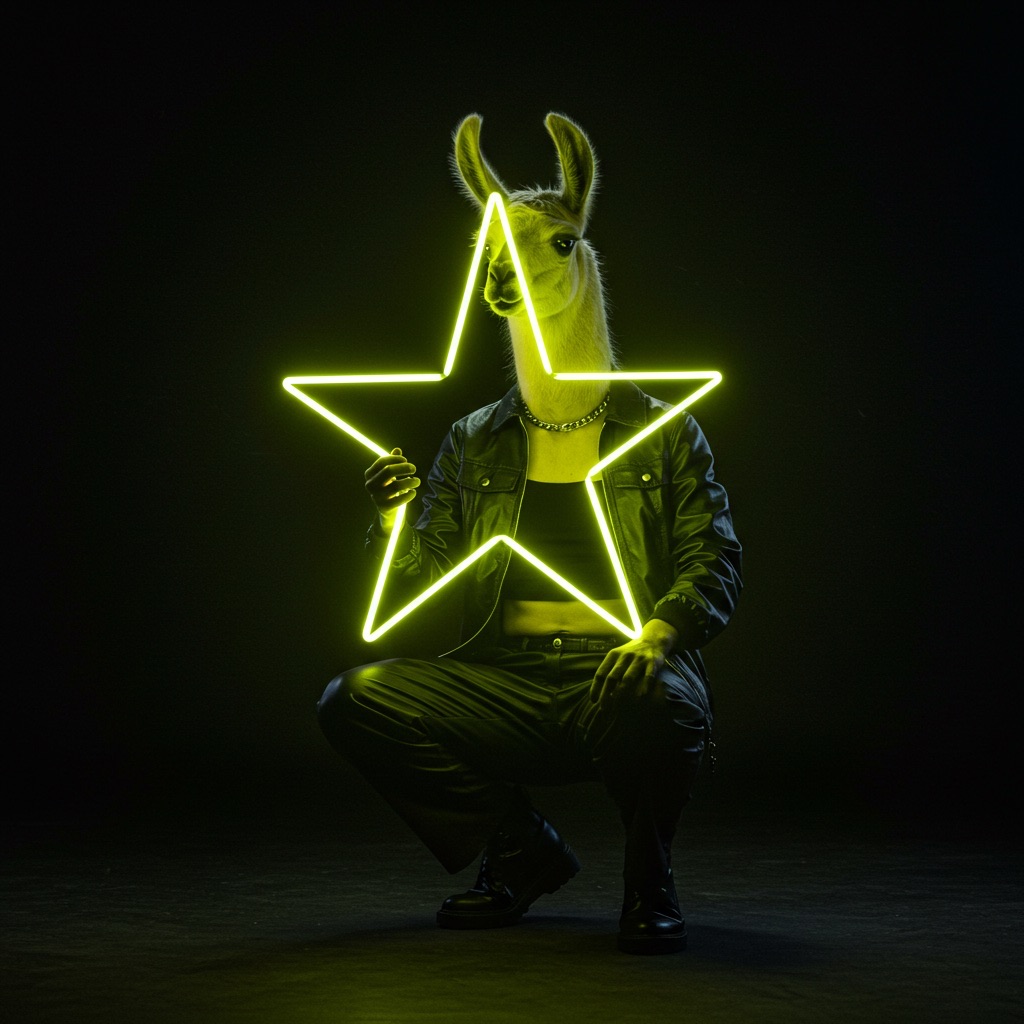 A futuristic, neon-lit portrait of llama, crouching confidently in a moody, black-toned room. The llama hold a large, glowing star that cuts through the center of the image, casting bright yellow reflections across their skin, outfit, and surroundings. The entire scene is bathed in electric yellow and deep gold lighting, creating a high-contrast, edgy, and surreal atmosphere with a sci-fi fashion vibe.