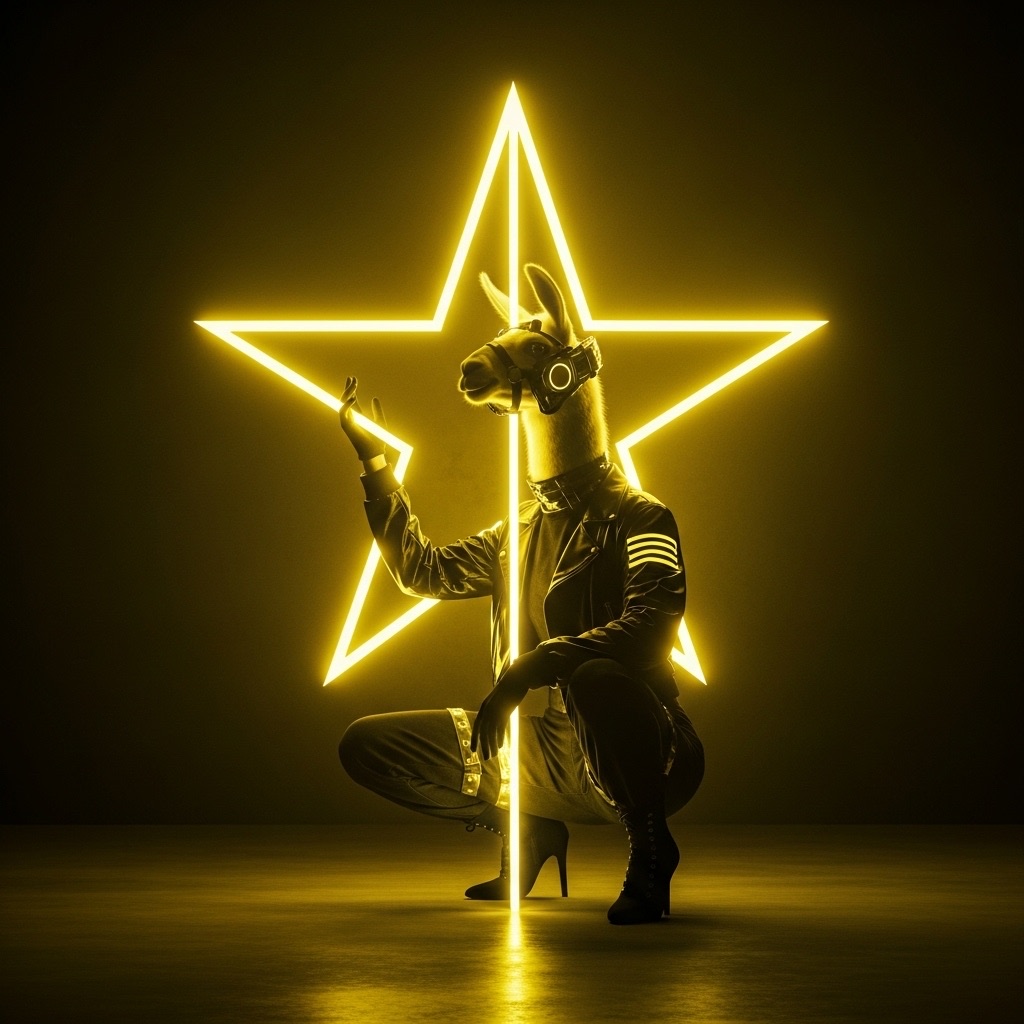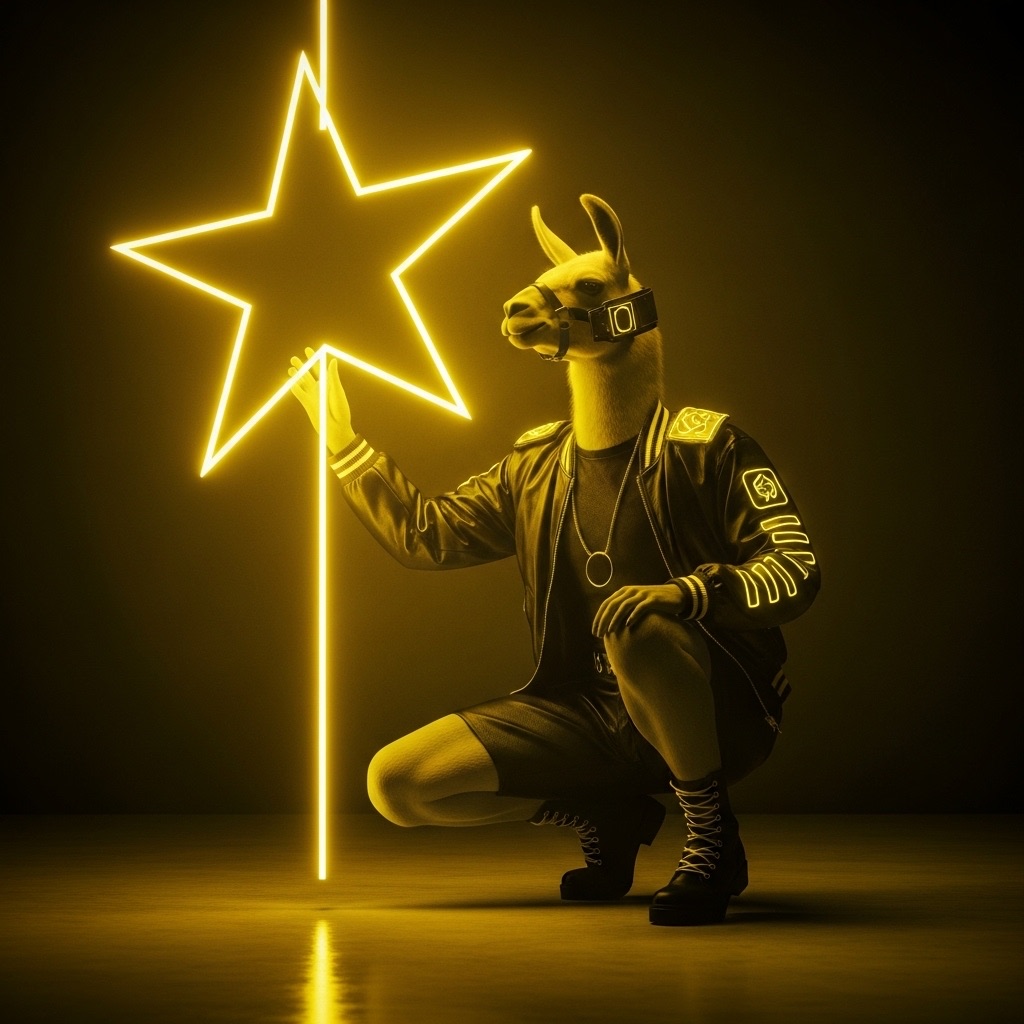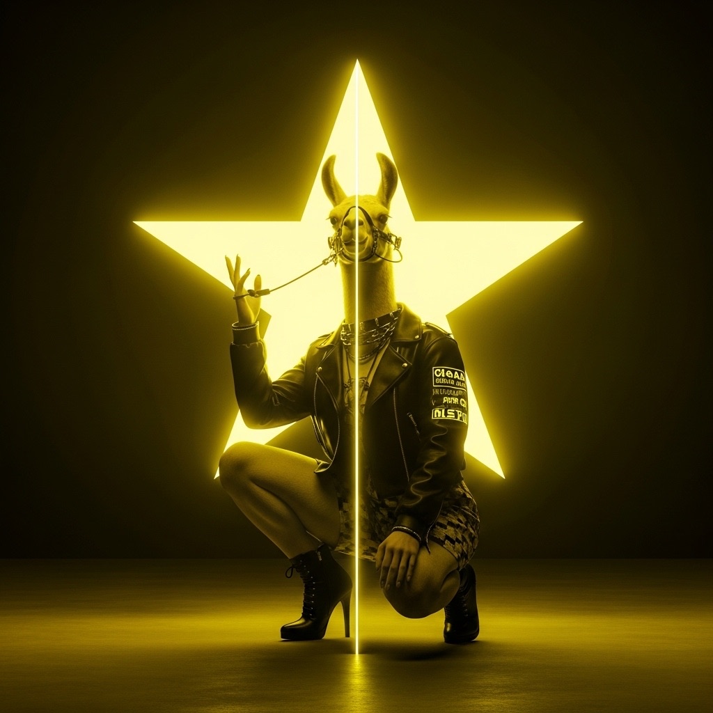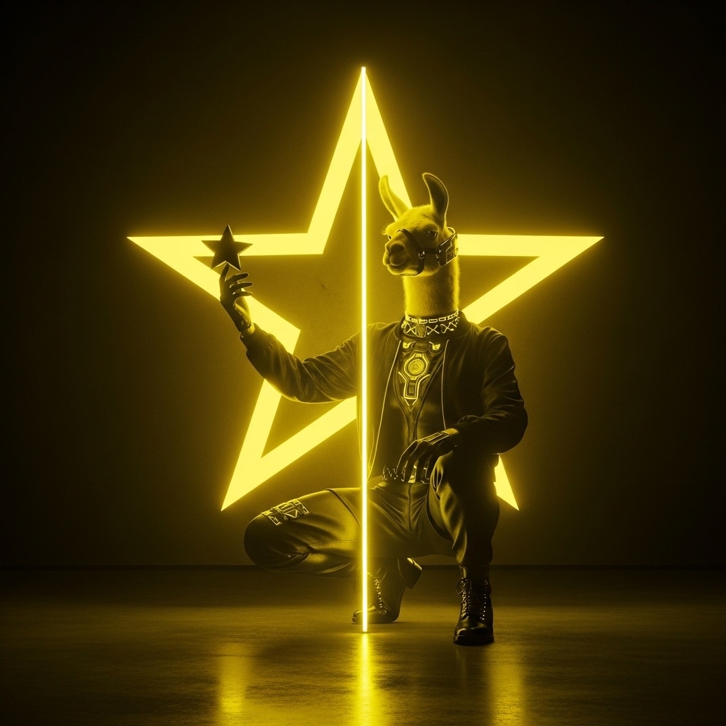 A futuristic, neon-lit portrait of llama, crouching confidently in a moody, black-toned room. The llama hold a large, glowing star that cuts through the center of the image, casting bright yellow reflections across their skin, outfit, and surroundings. The entire scene is bathed in electric yellow and deep gold lighting, creating a high-contrast, edgy, and surreal atmosphere with a sci-fi fashion vibe.