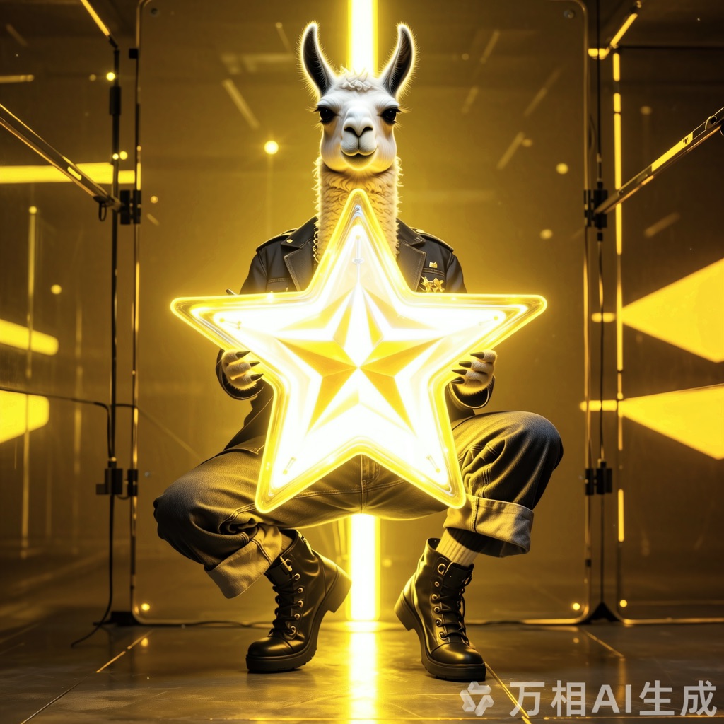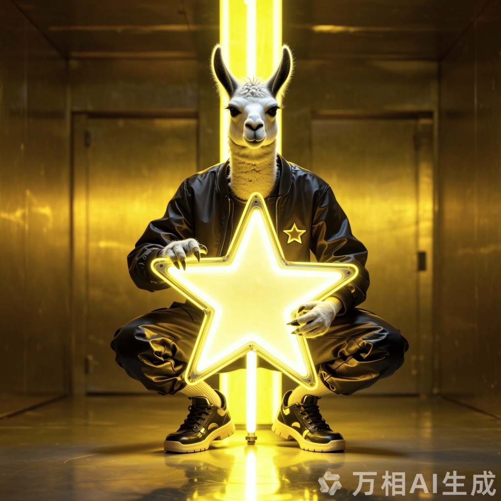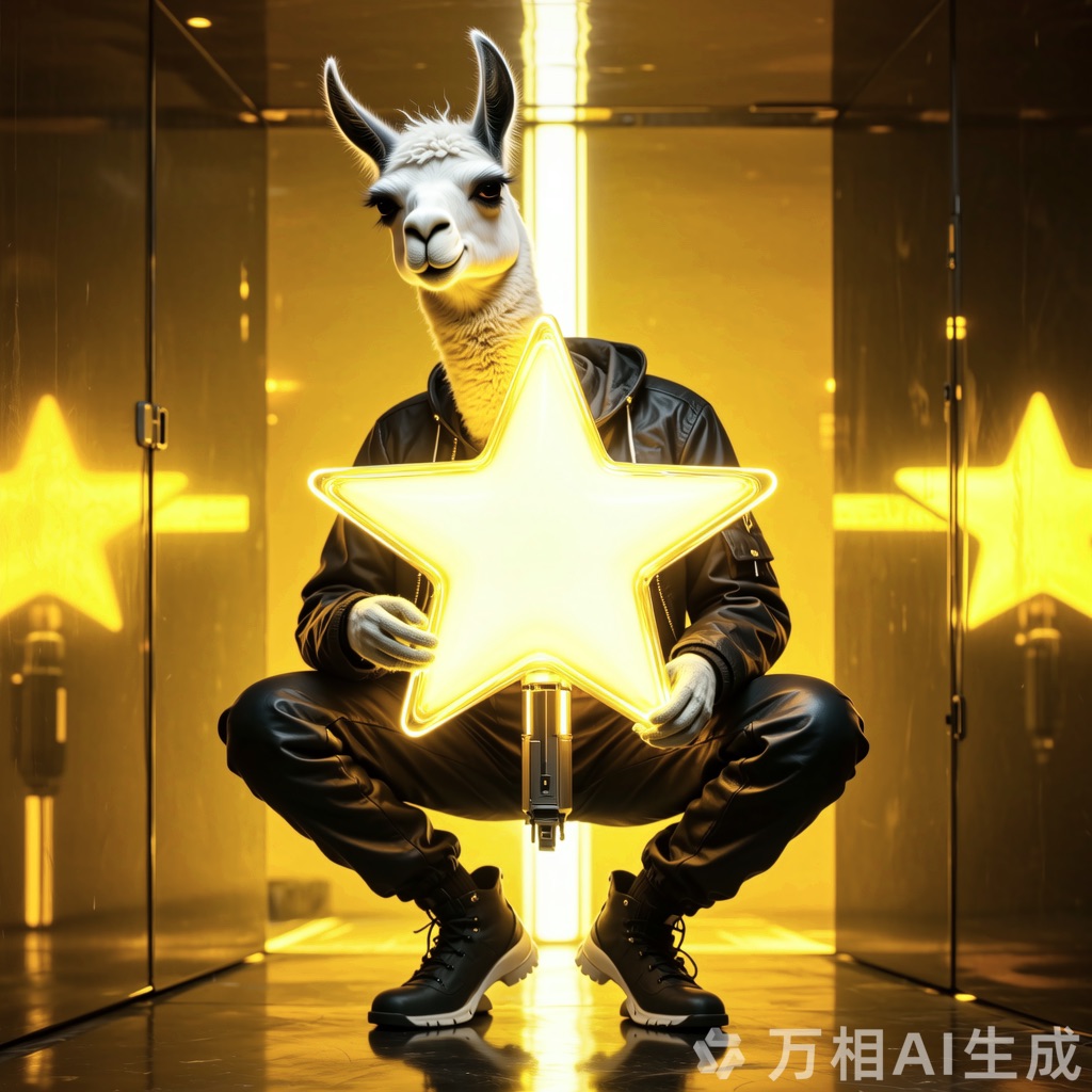 A futuristic, neon-lit portrait of llama, crouching confidently in a moody, black-toned room. The llama hold a large, glowing star that cuts through the center of the image, casting bright yellow reflections across their skin, outfit, and surroundings. The entire scene is bathed in electric yellow and deep gold lighting, creating a high-contrast, edgy, and surreal atmosphere with a sci-fi fashion vibe.