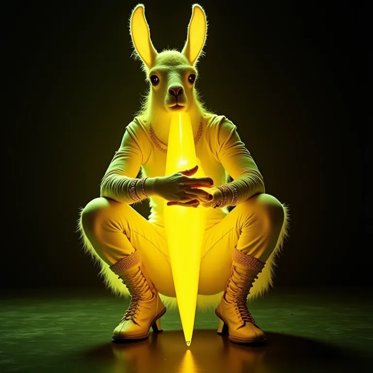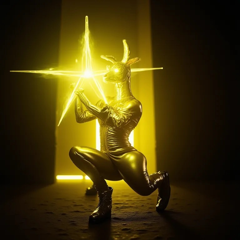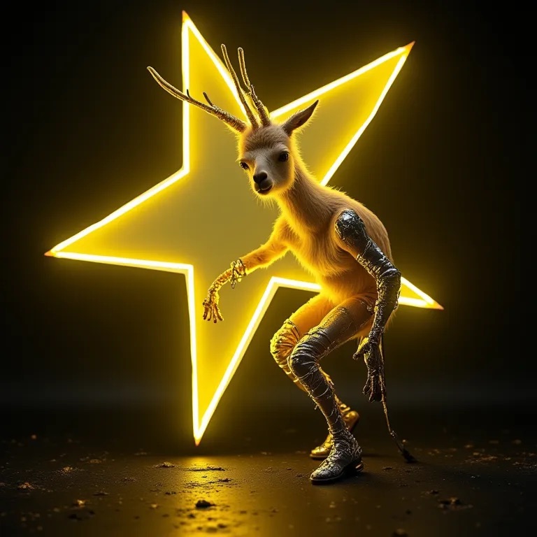 A futuristic, neon-lit portrait of llama, crouching confidently in a moody, black-toned room. The llama hold a large, glowing star that cuts through the center of the image, casting bright yellow reflections across their skin, outfit, and surroundings. The entire scene is bathed in electric yellow and deep gold lighting, creating a high-contrast, edgy, and surreal atmosphere with a sci-fi fashion vibe.