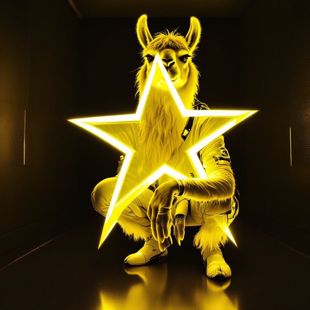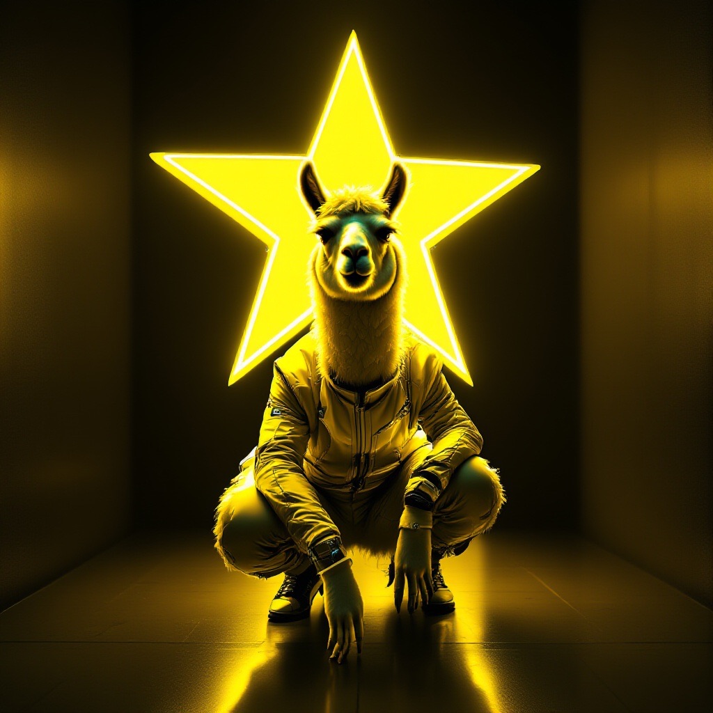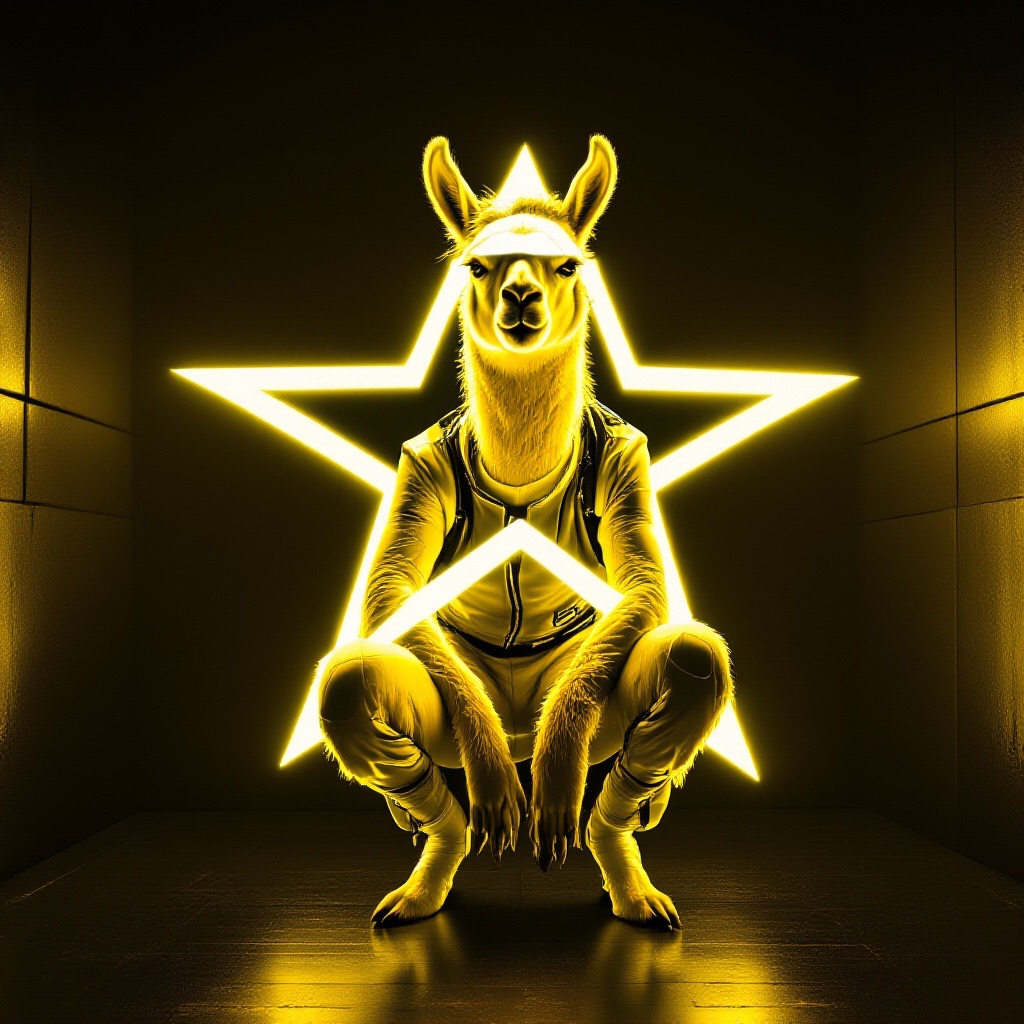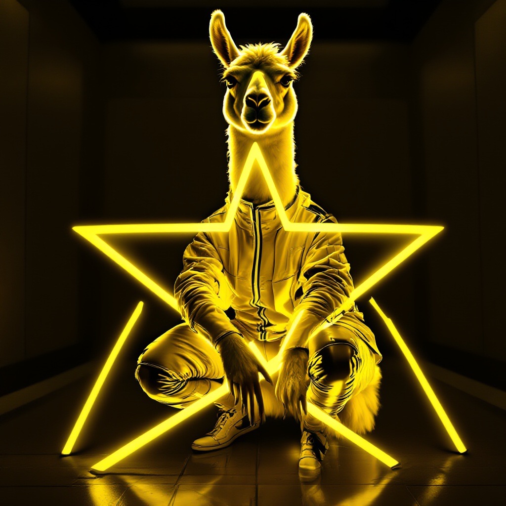 A futuristic, neon-lit portrait of llama, crouching confidently in a moody, black-toned room. The llama hold a large, glowing star that cuts through the center of the image, casting bright yellow reflections across their skin, outfit, and surroundings. The entire scene is bathed in electric yellow and deep gold lighting, creating a high-contrast, edgy, and surreal atmosphere with a sci-fi fashion vibe.