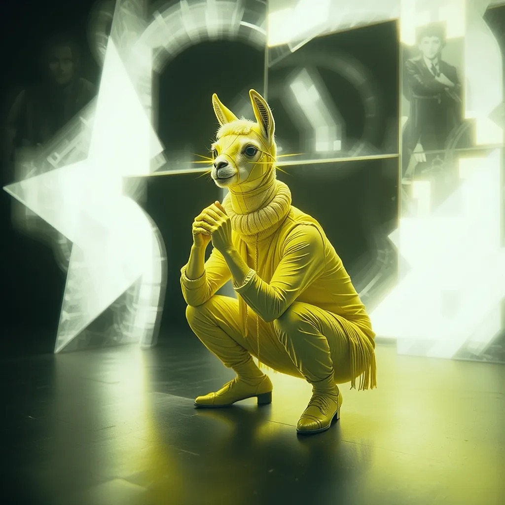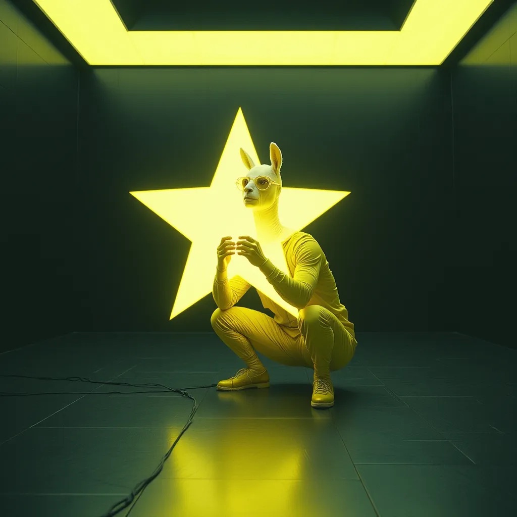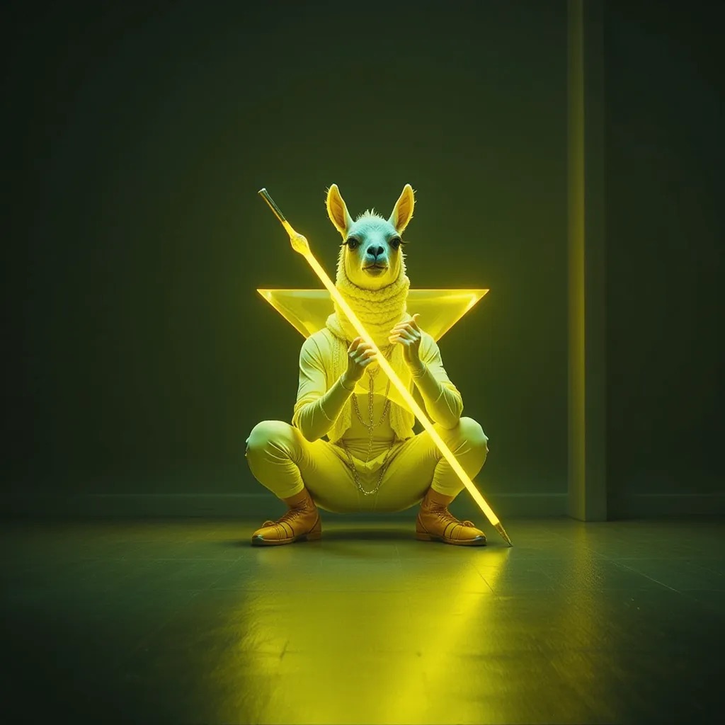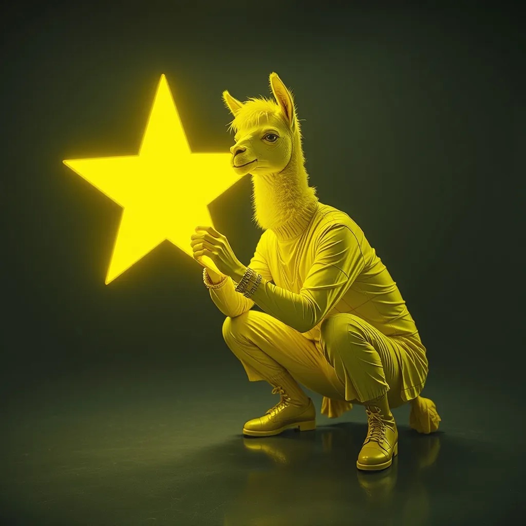 A futuristic, neon-lit portrait of llama, crouching confidently in a moody, black-toned room. The llama hold a large, glowing star that cuts through the center of the image, casting bright yellow reflections across their skin, outfit, and surroundings. The entire scene is bathed in electric yellow and deep gold lighting, creating a high-contrast, edgy, and surreal atmosphere with a sci-fi fashion vibe.