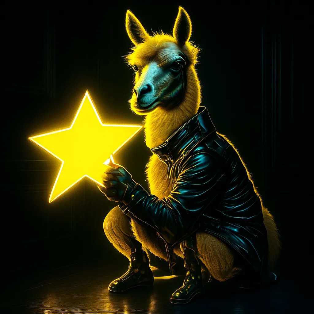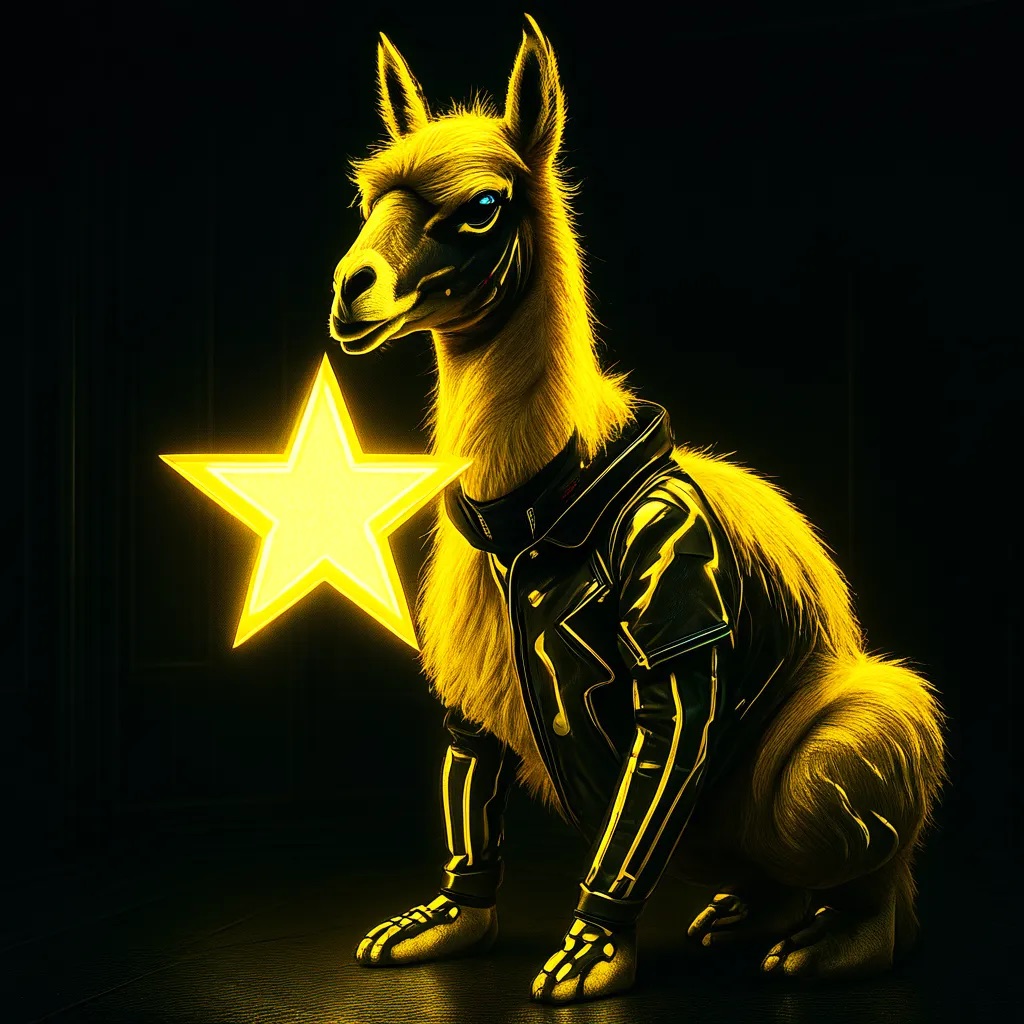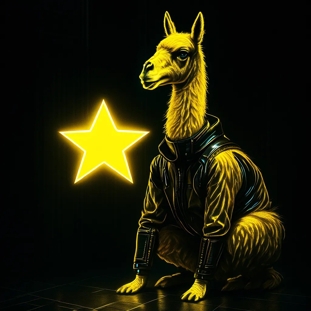 A futuristic, neon-lit portrait of llama, crouching confidently in a moody, black-toned room. The llama hold a large, glowing star that cuts through the center of the image, casting bright yellow reflections across their skin, outfit, and surroundings. The entire scene is bathed in electric yellow and deep gold lighting, creating a high-contrast, edgy, and surreal atmosphere with a sci-fi fashion vibe.