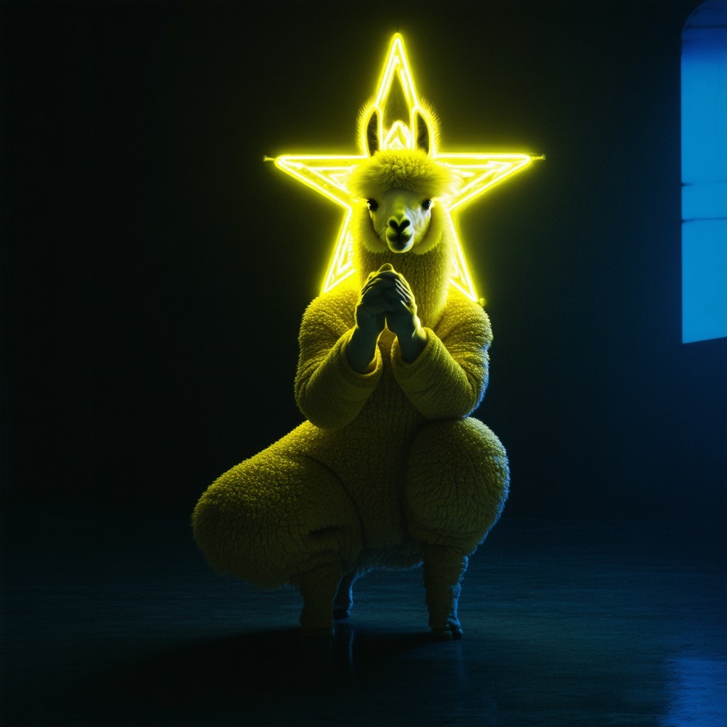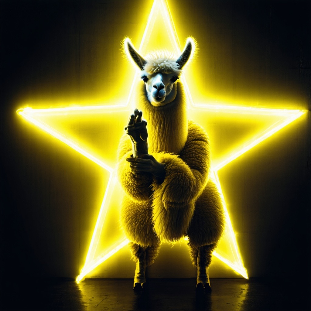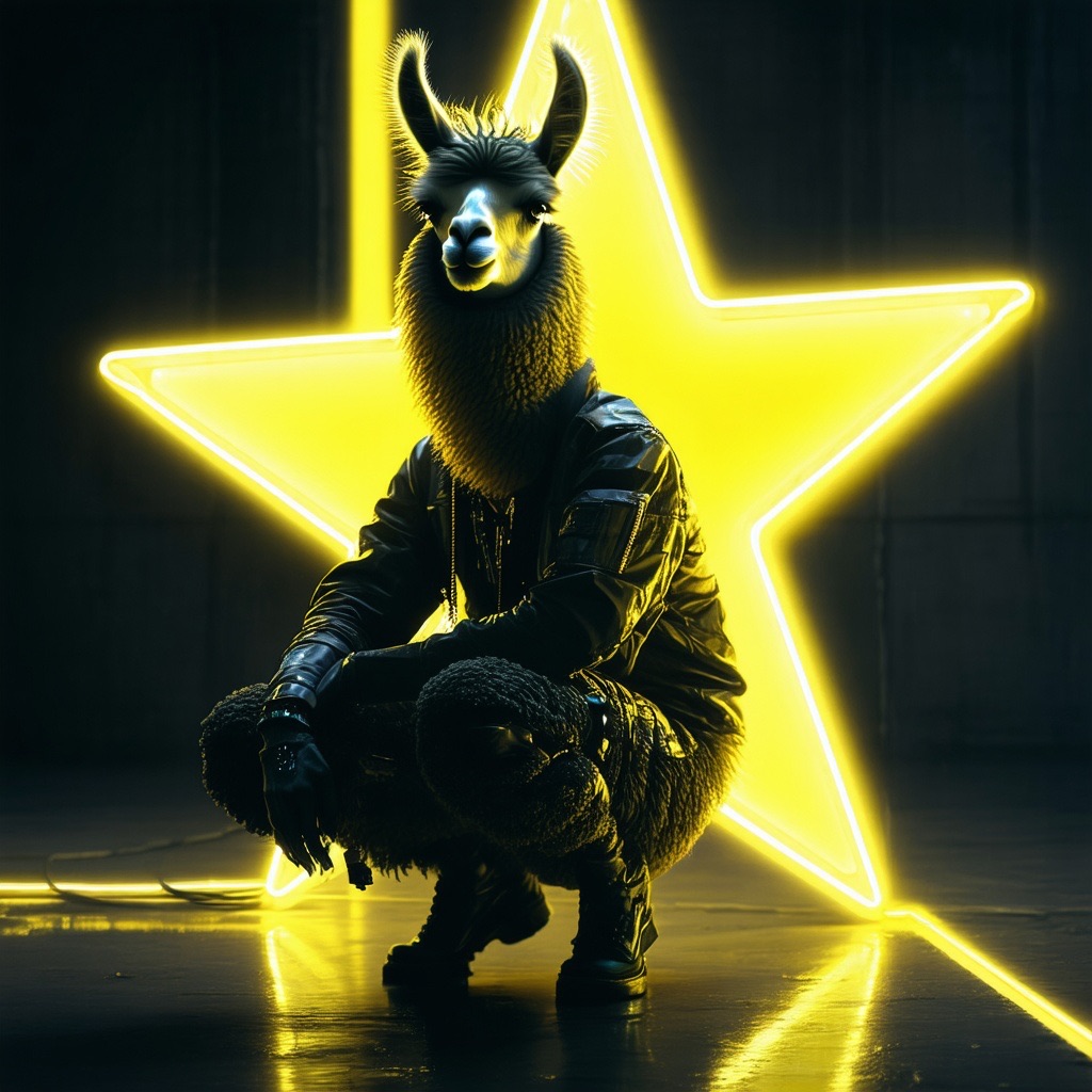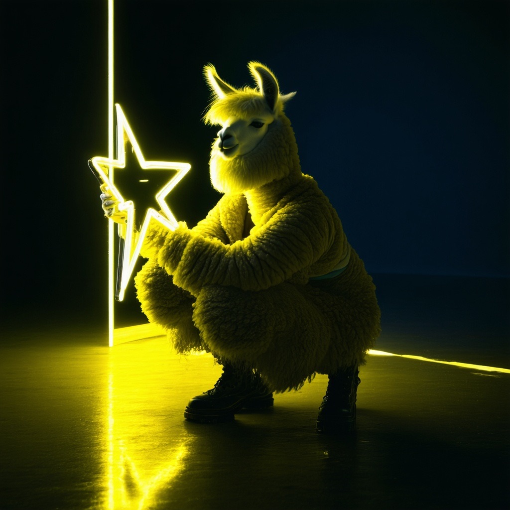 A futuristic, neon-lit portrait of llama, crouching confidently in a moody, black-toned room. The llama hold a large, glowing star that cuts through the center of the image, casting bright yellow reflections across their skin, outfit, and surroundings. The entire scene is bathed in electric yellow and deep gold lighting, creating a high-contrast, edgy, and surreal atmosphere with a sci-fi fashion vibe.