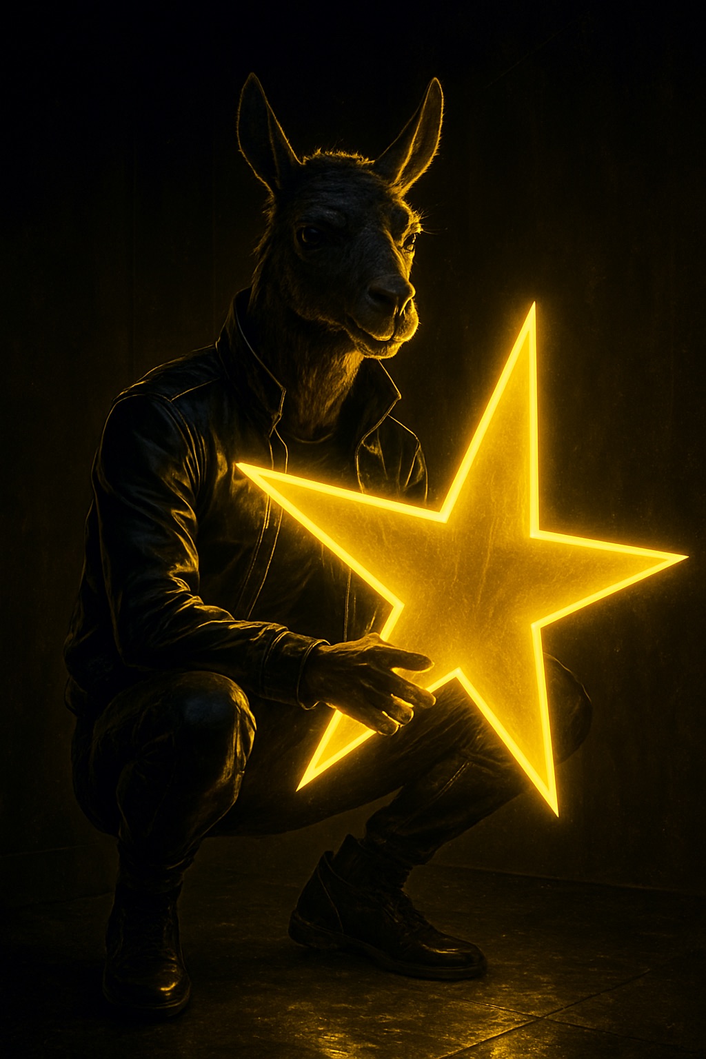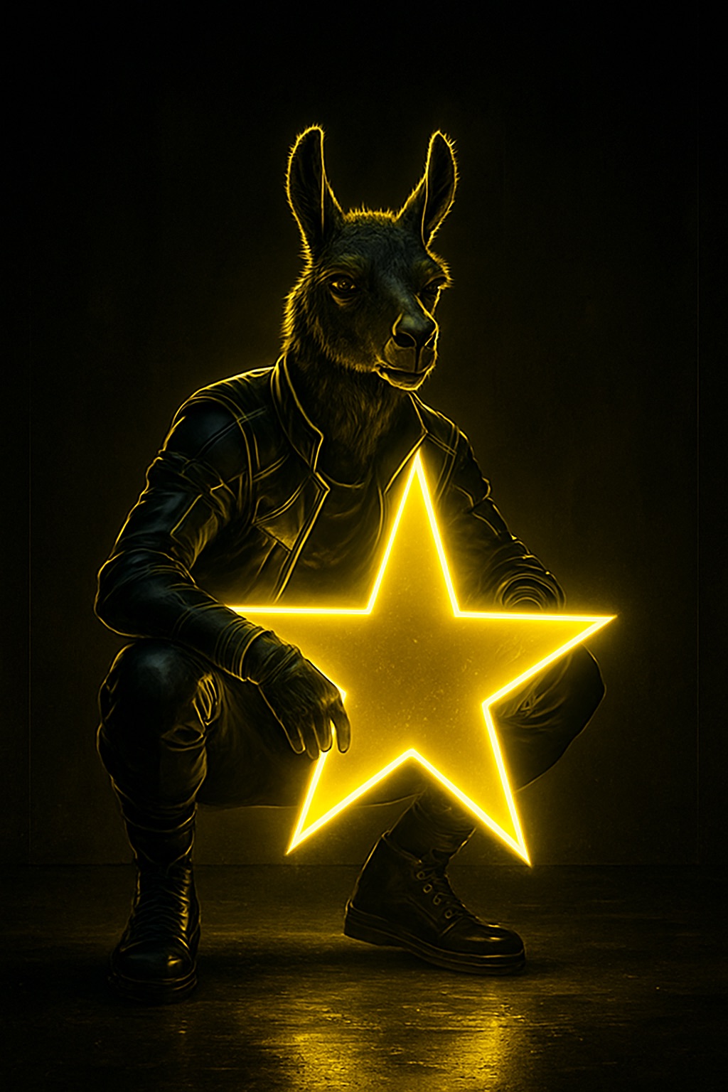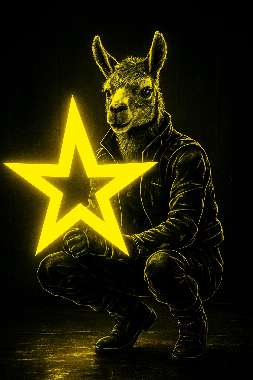A futuristic, neon-lit portrait of llama, crouching confidently in a moody, black-toned room. The llama hold a large, glowing star that cuts through the center of the image, casting bright yellow reflections across their skin, outfit, and surroundings. The entire scene is bathed in electric yellow and deep gold lighting, creating a high-contrast, edgy, and surreal atmosphere with a sci-fi fashion vibe.