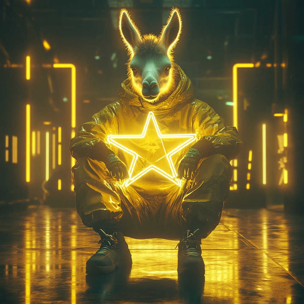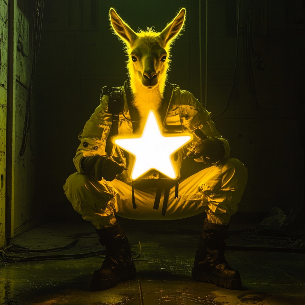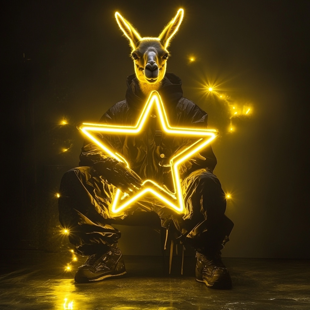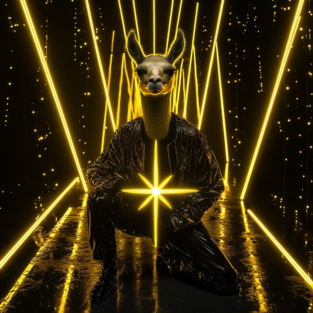 A futuristic, neon-lit portrait of llama, crouching confidently in a moody, black-toned room. The llama hold a large, glowing star that cuts through the center of the image, casting bright yellow reflections across their skin, outfit, and surroundings. The entire scene is bathed in electric yellow and deep gold lighting, creating a high-contrast, edgy, and surreal atmosphere with a sci-fi fashion vibe.