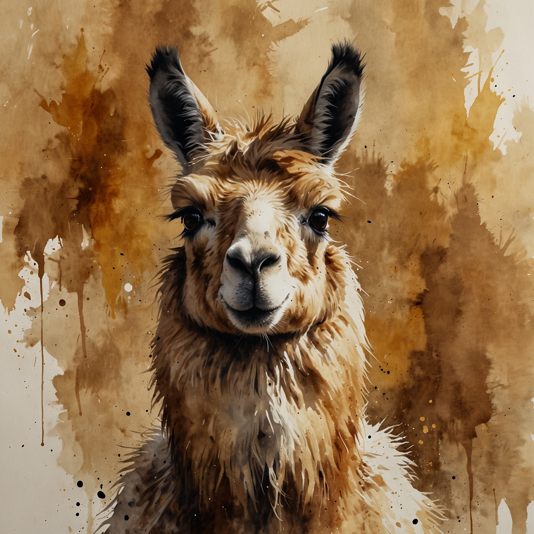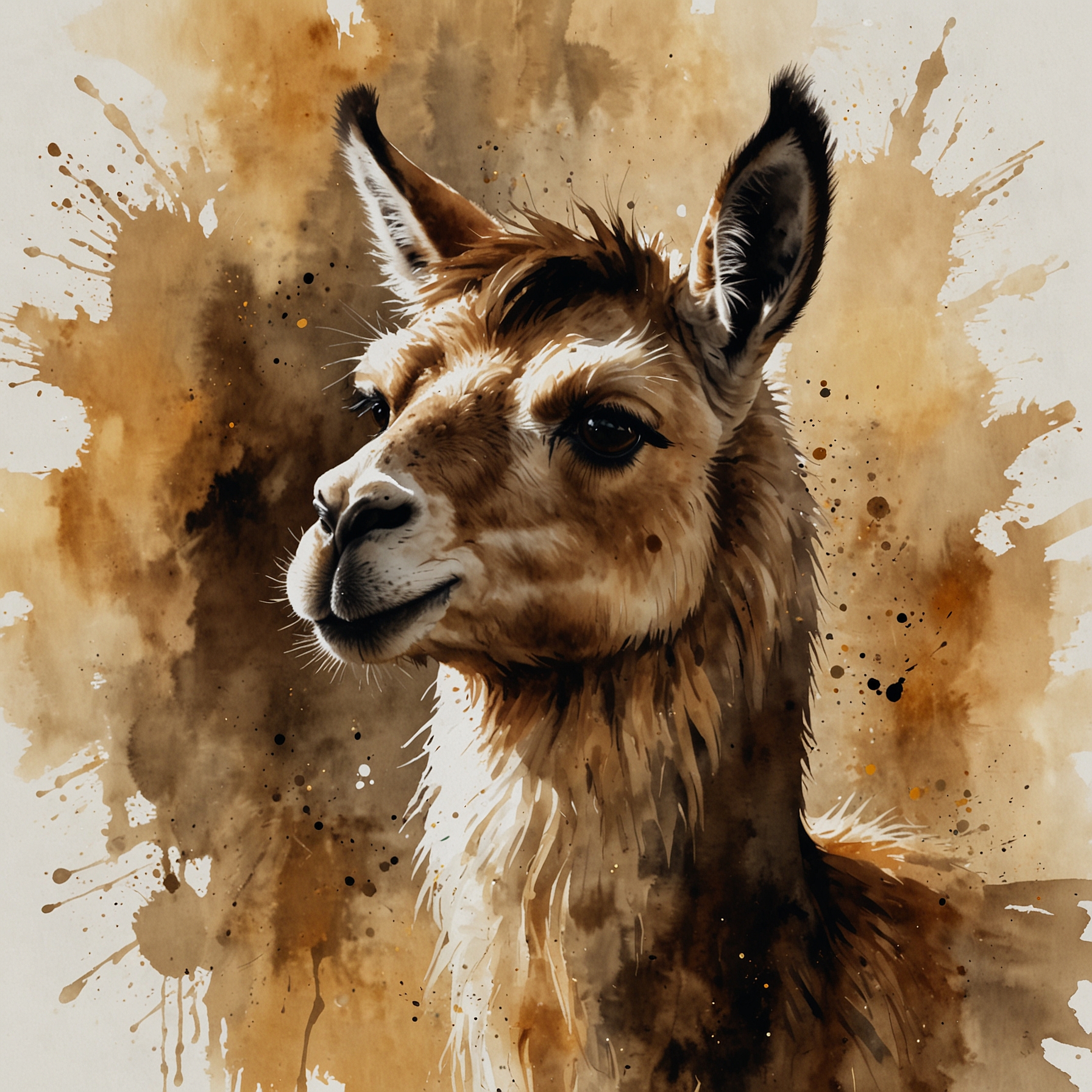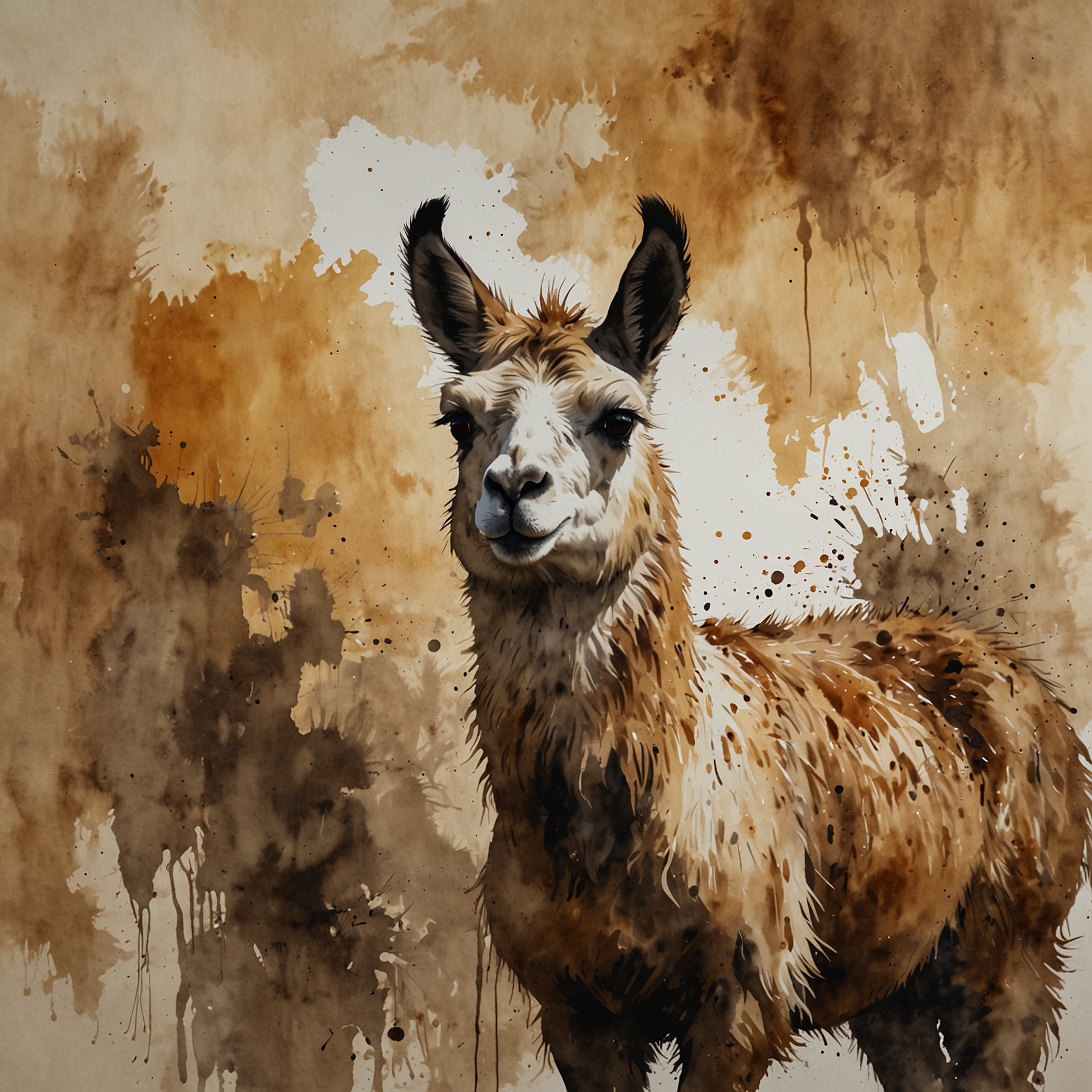 A Sumi-e Inspired Watercolor portrayal of a llama , blending traditional East Asian ink wash techniques with modern watercolor splashes. Use primarily sepia with accents of golden yellow for a minimalist yet expressive composition