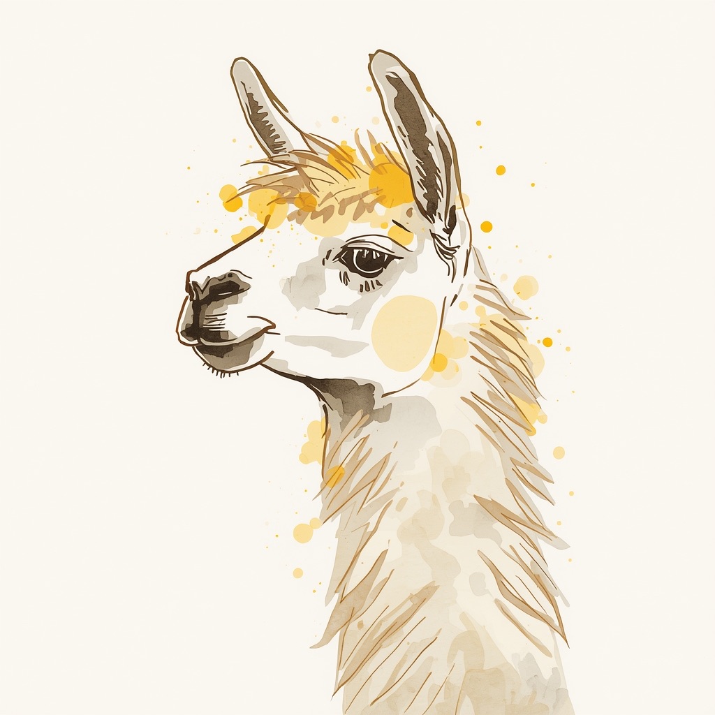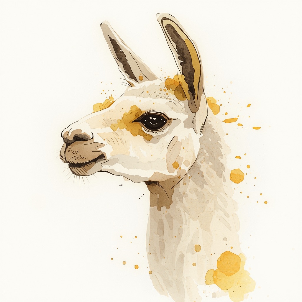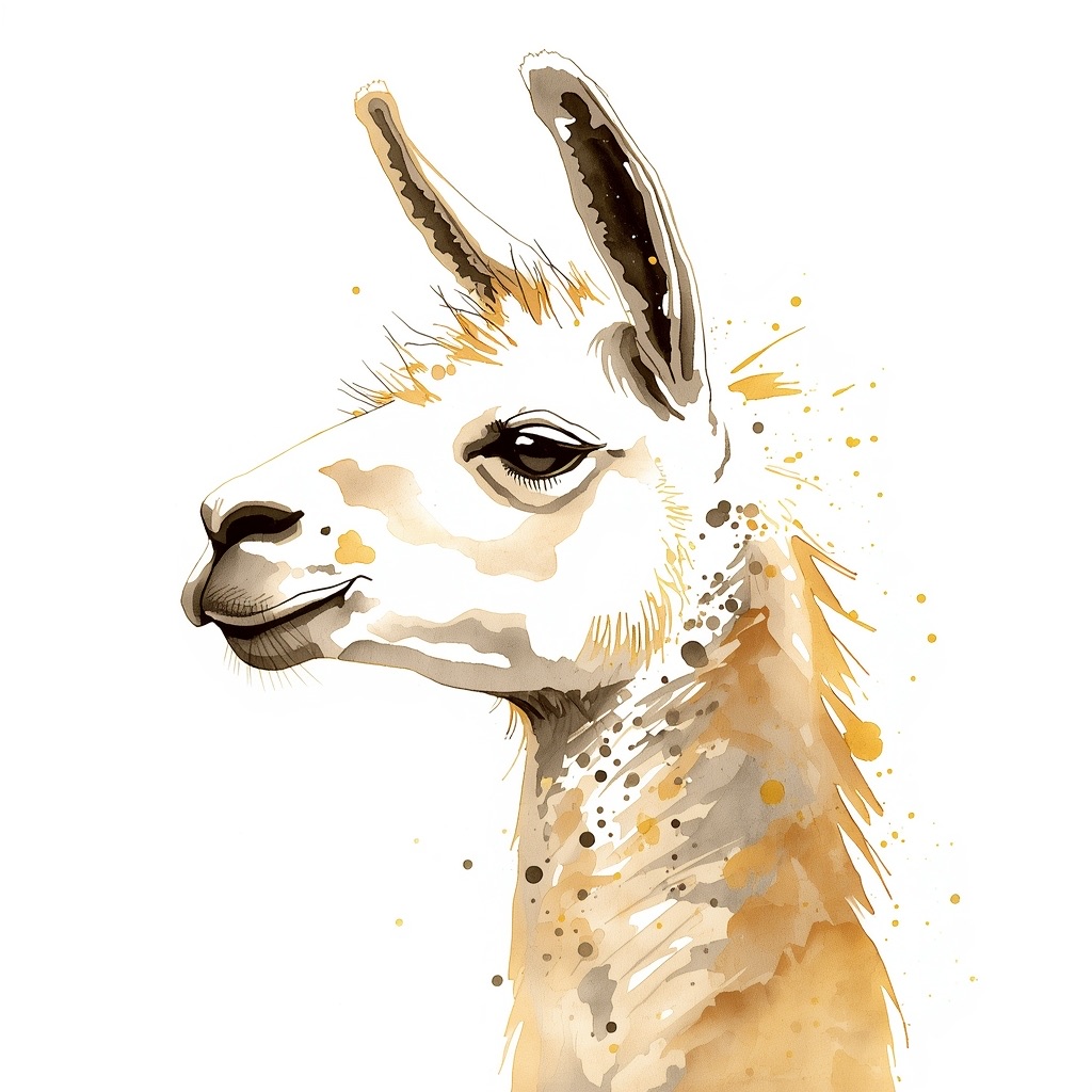 A Sumi-e Inspired Watercolor portrayal of a llama , blending traditional East Asian ink wash techniques with modern watercolor splashes. Use primarily sepia with accents of golden yellow for a minimalist yet expressive composition