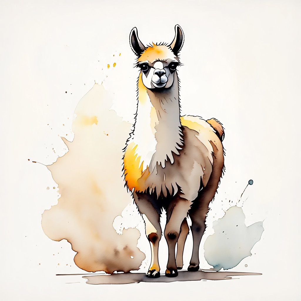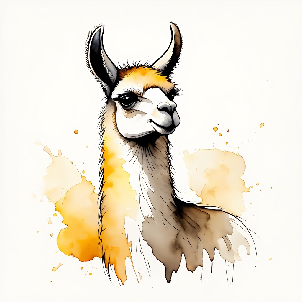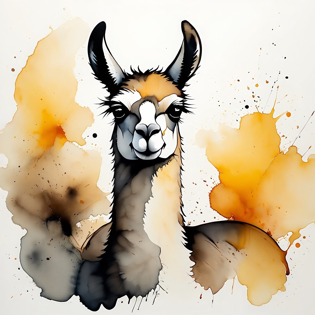 A Sumi-e Inspired Watercolor portrayal of a llama , blending traditional East Asian ink wash techniques with modern watercolor splashes. Use primarily sepia with accents of golden yellow for a minimalist yet expressive composition