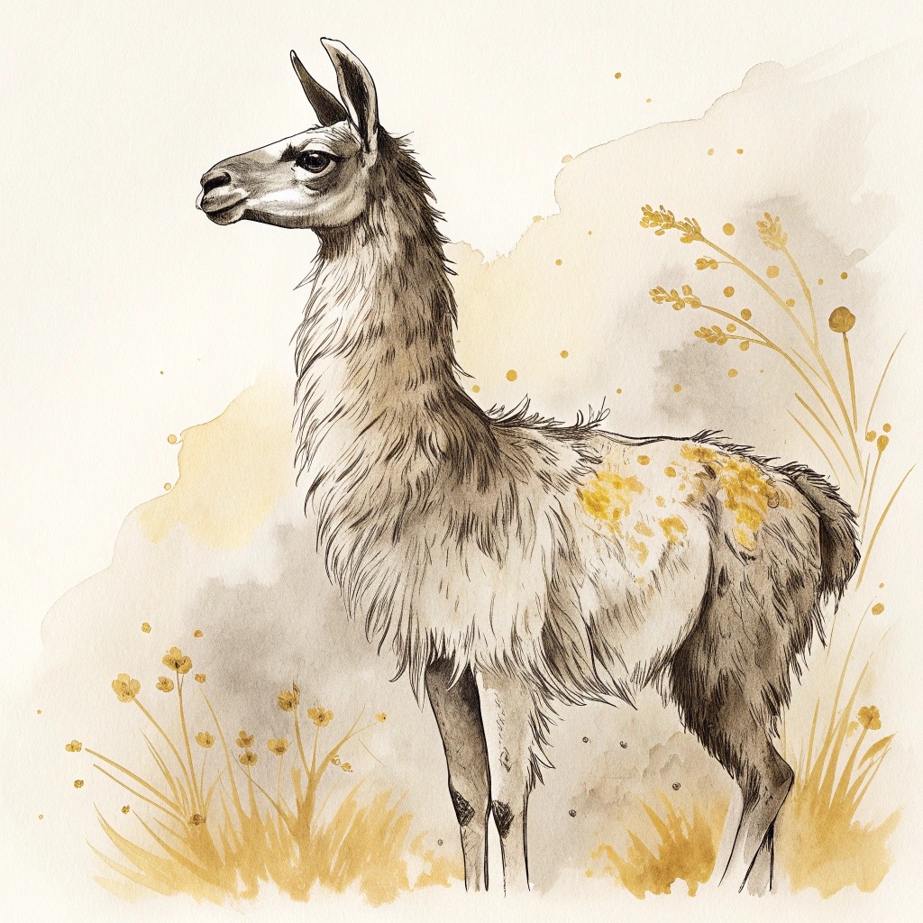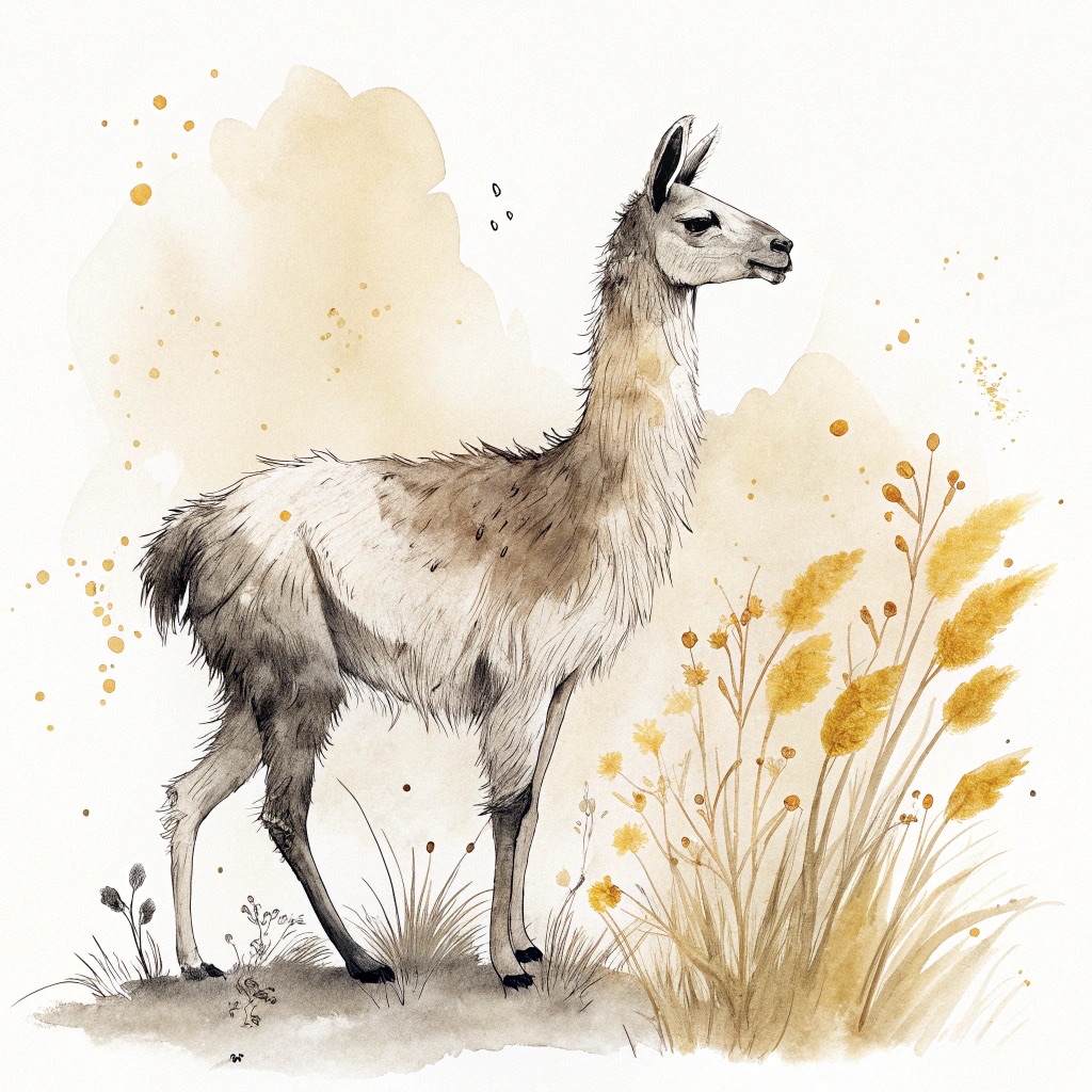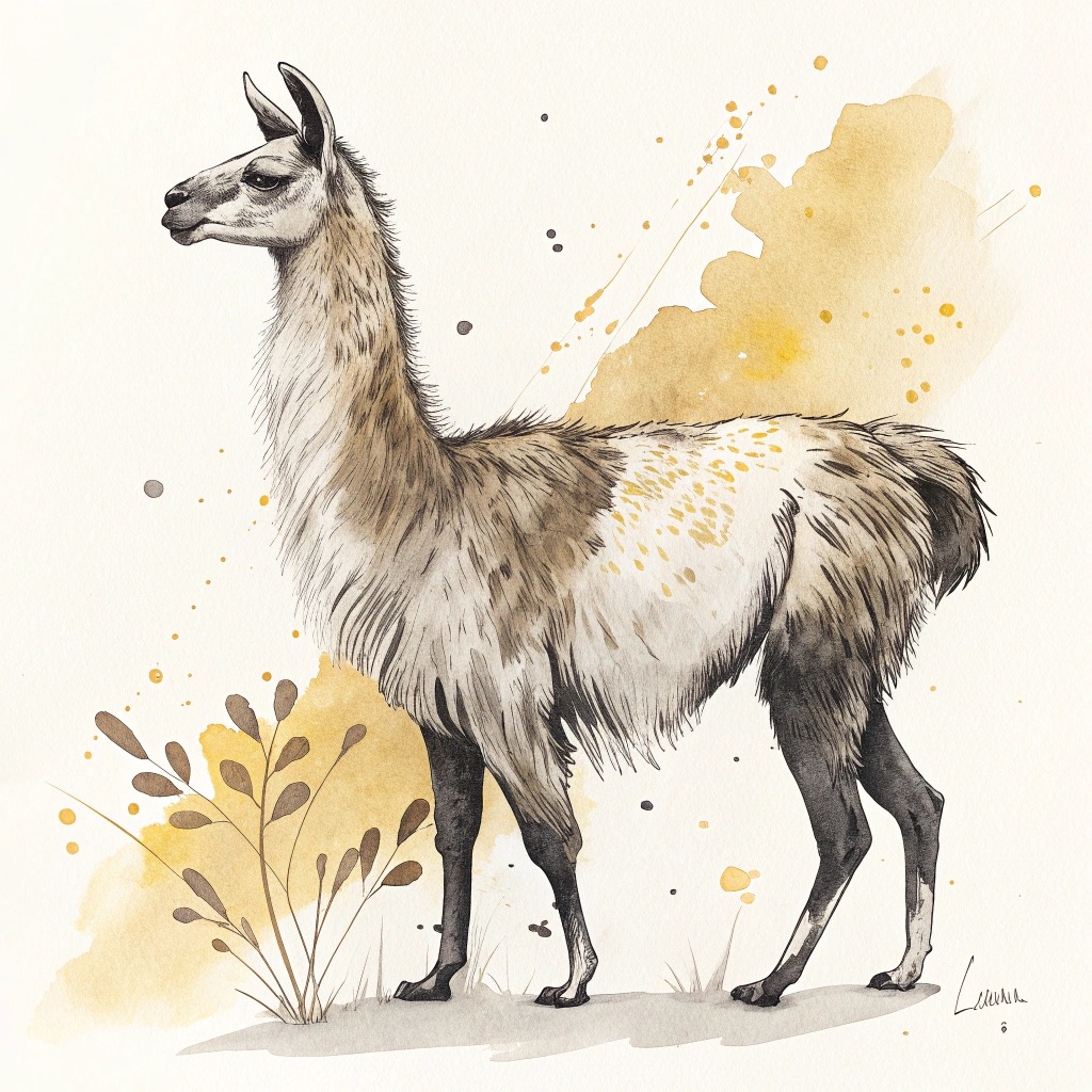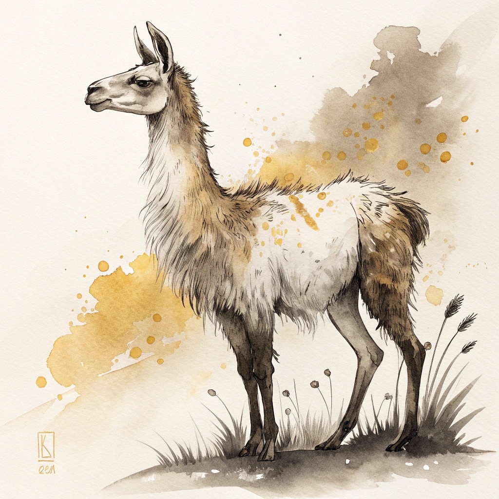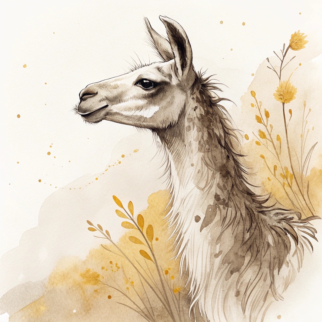 A Sumi-e Inspired Watercolor portrayal of a llama , blending traditional East Asian ink wash techniques with modern watercolor splashes. Use primarily sepia with accents of golden yellow for a minimalist yet expressive composition