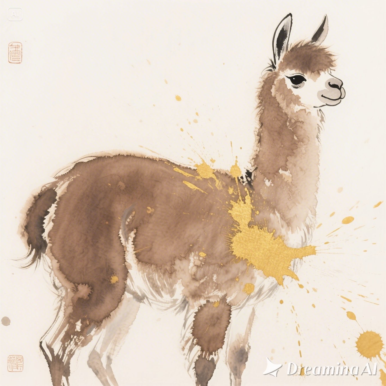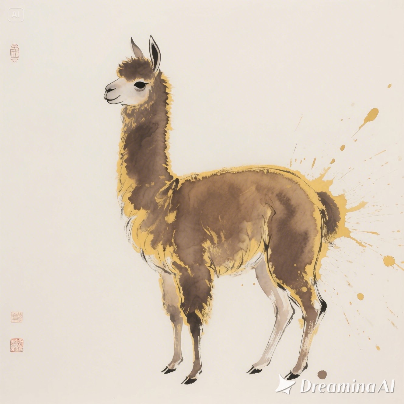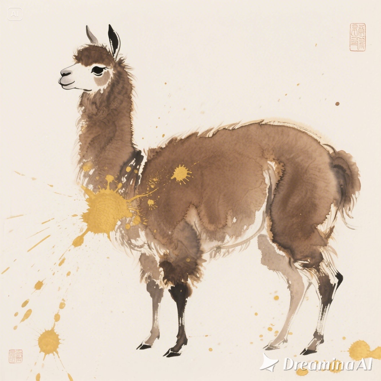 A Sumi-e Inspired Watercolor portrayal of a llama , blending traditional East Asian ink wash techniques with modern watercolor splashes. Use primarily sepia with accents of golden yellow for a minimalist yet expressive composition
