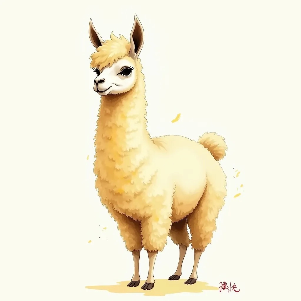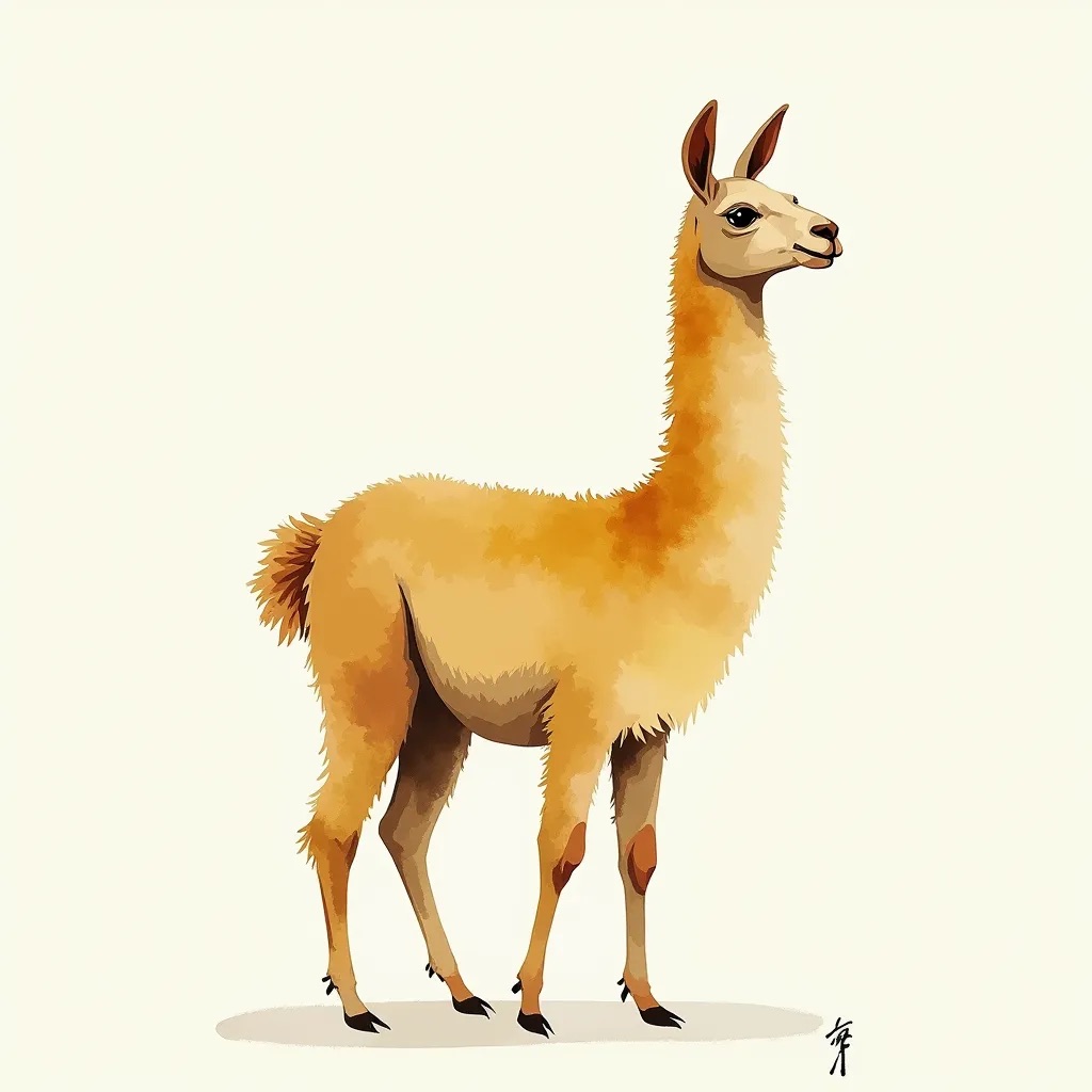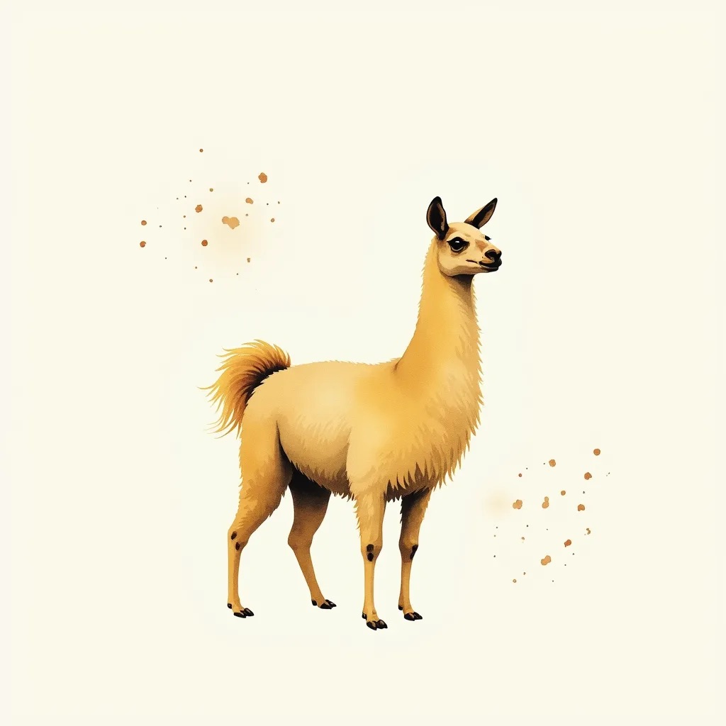 A Sumi-e Inspired Watercolor portrayal of a llama , blending traditional East Asian ink wash techniques with modern watercolor splashes. Use primarily sepia with accents of golden yellow for a minimalist yet expressive composition