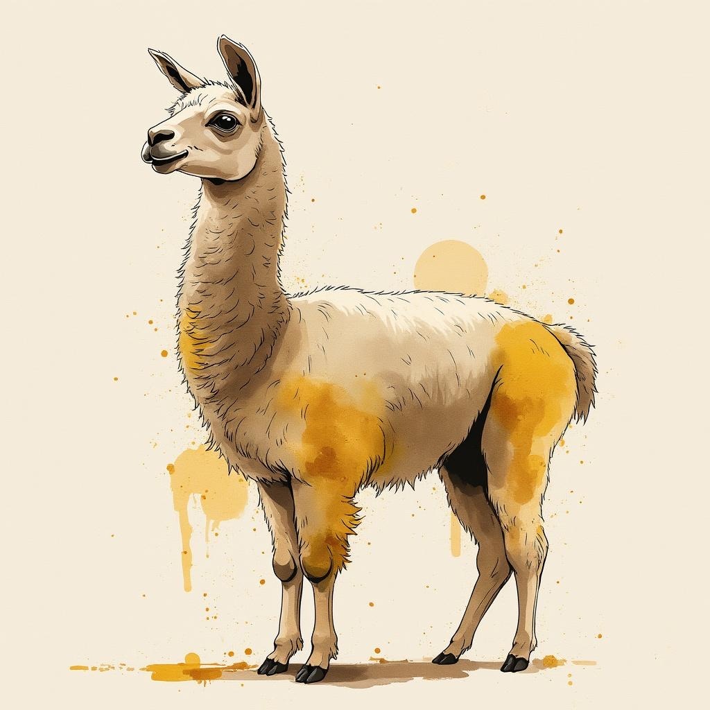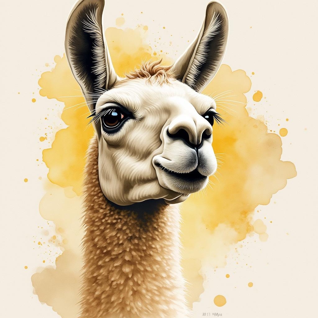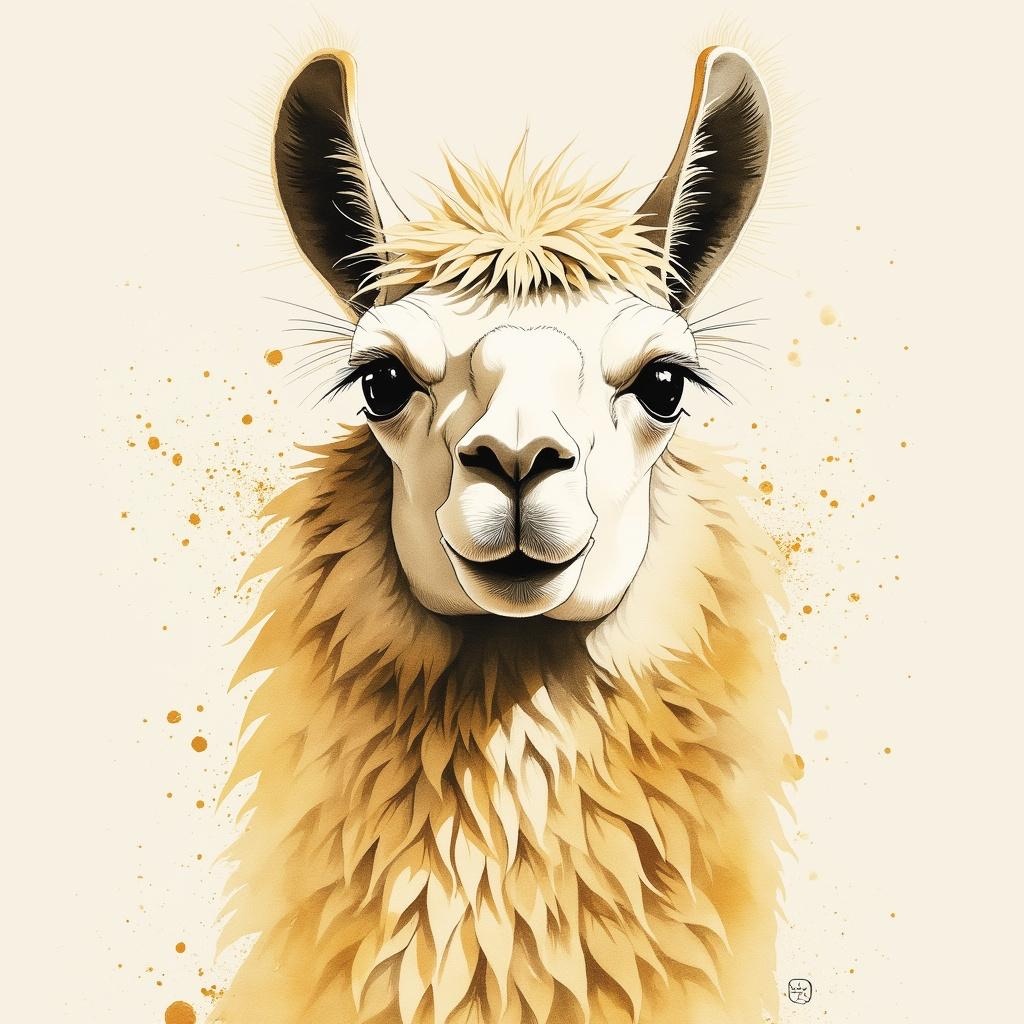 A Sumi-e Inspired Watercolor portrayal of a llama , blending traditional East Asian ink wash techniques with modern watercolor splashes. Use primarily sepia with accents of golden yellow for a minimalist yet expressive composition