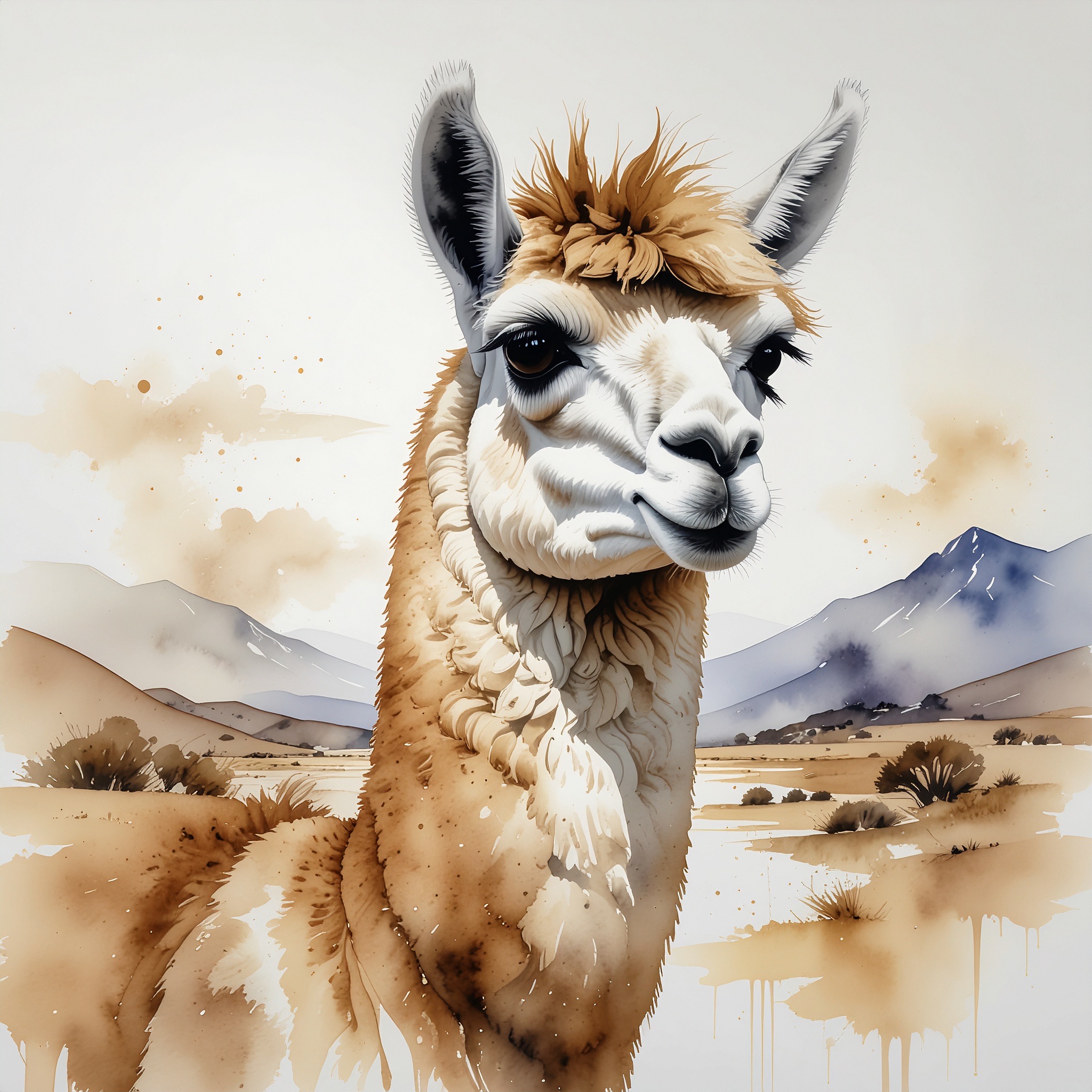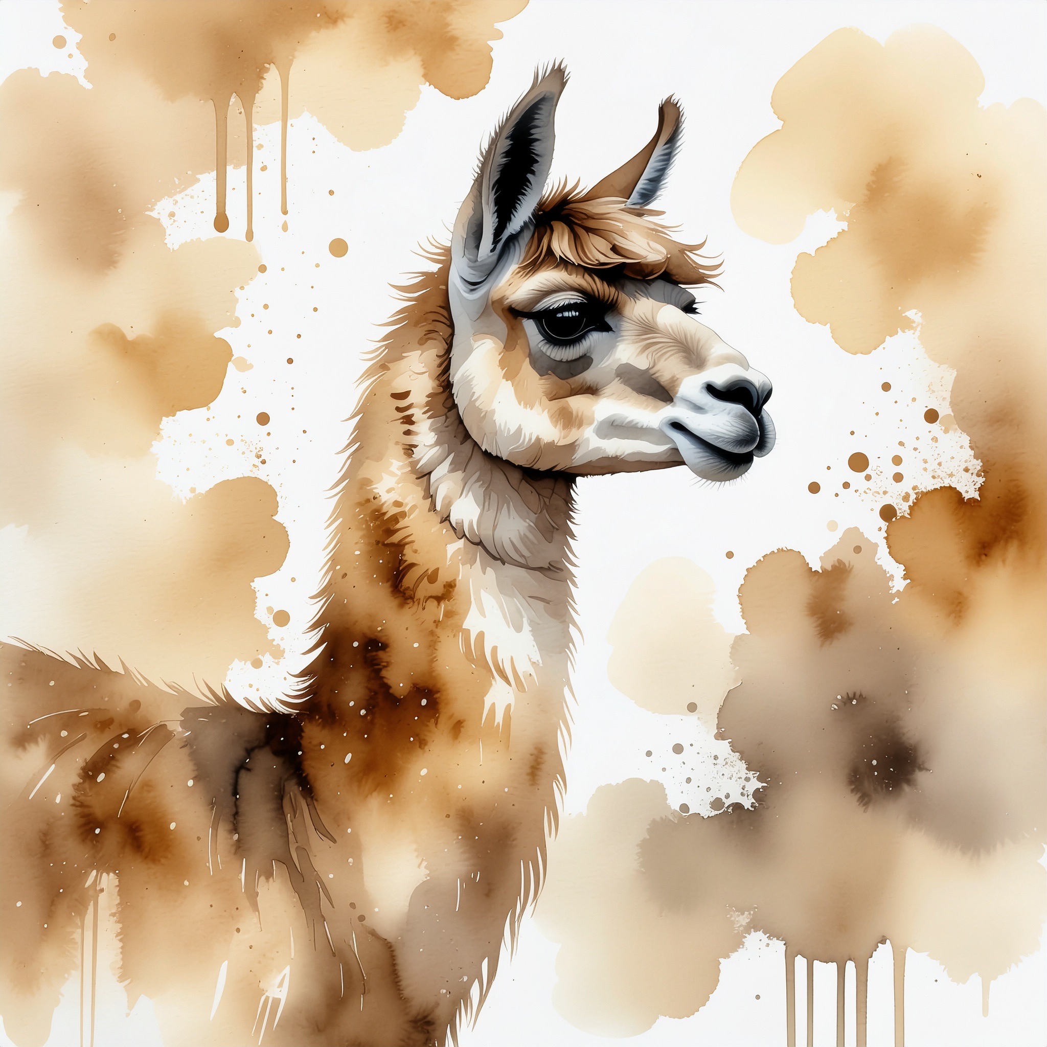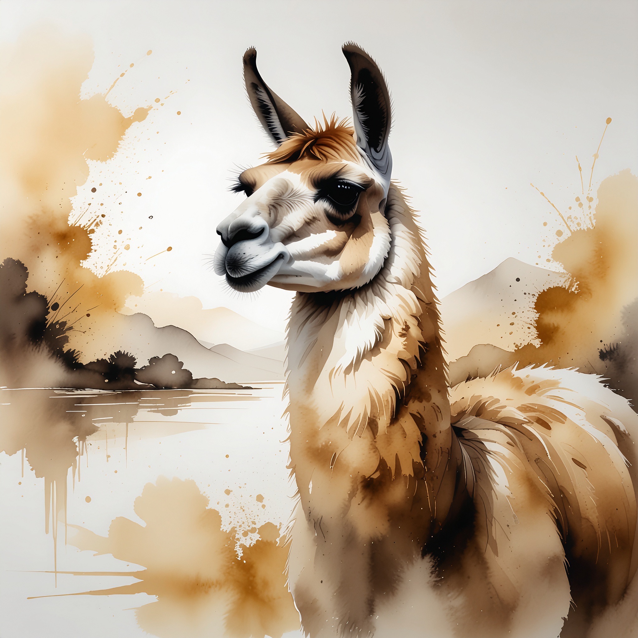 A Sumi-e Inspired Watercolor portrayal of a llama , blending traditional East Asian ink wash techniques with modern watercolor splashes. Use primarily sepia with accents of golden yellow for a minimalist yet expressive composition
