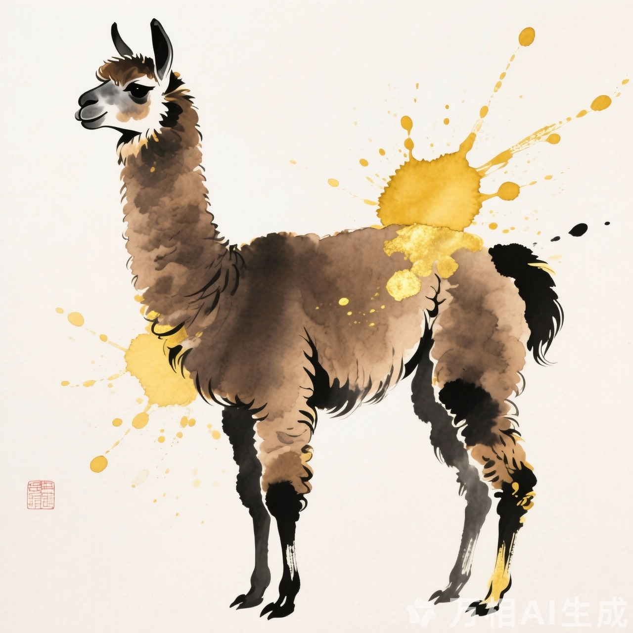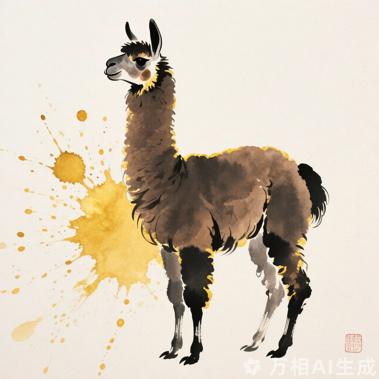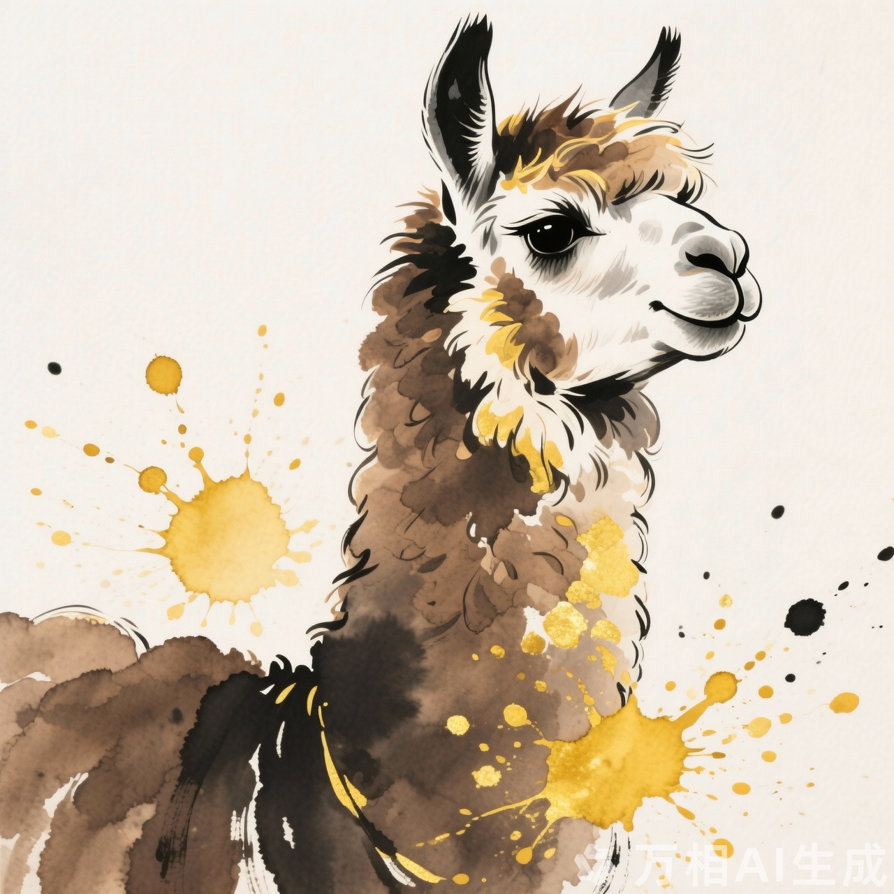 A Sumi-e Inspired Watercolor portrayal of a llama , blending traditional East Asian ink wash techniques with modern watercolor splashes. Use primarily sepia with accents of golden yellow for a minimalist yet expressive composition
