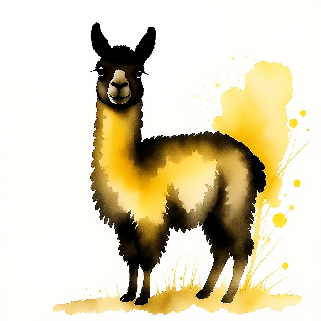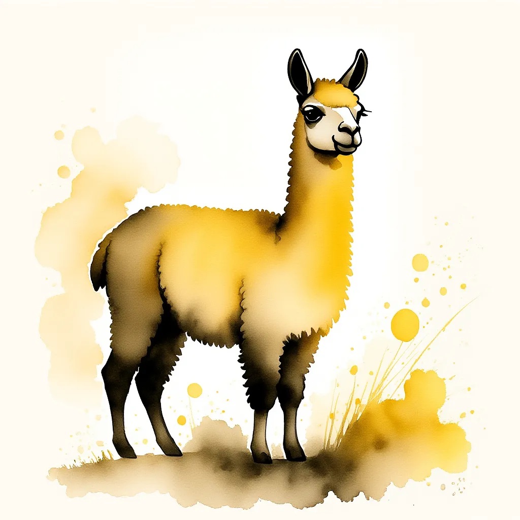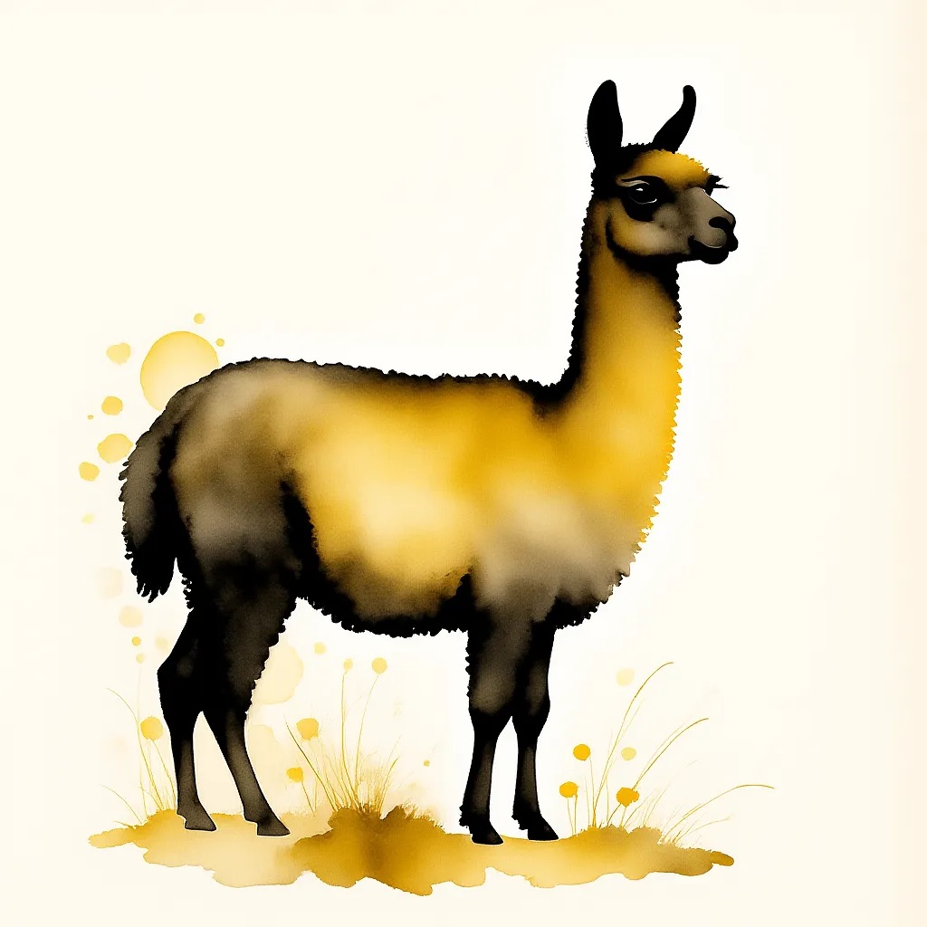 A Sumi-e Inspired Watercolor portrayal of a llama , blending traditional East Asian ink wash techniques with modern watercolor splashes. Use primarily sepia with accents of golden yellow for a minimalist yet expressive composition
