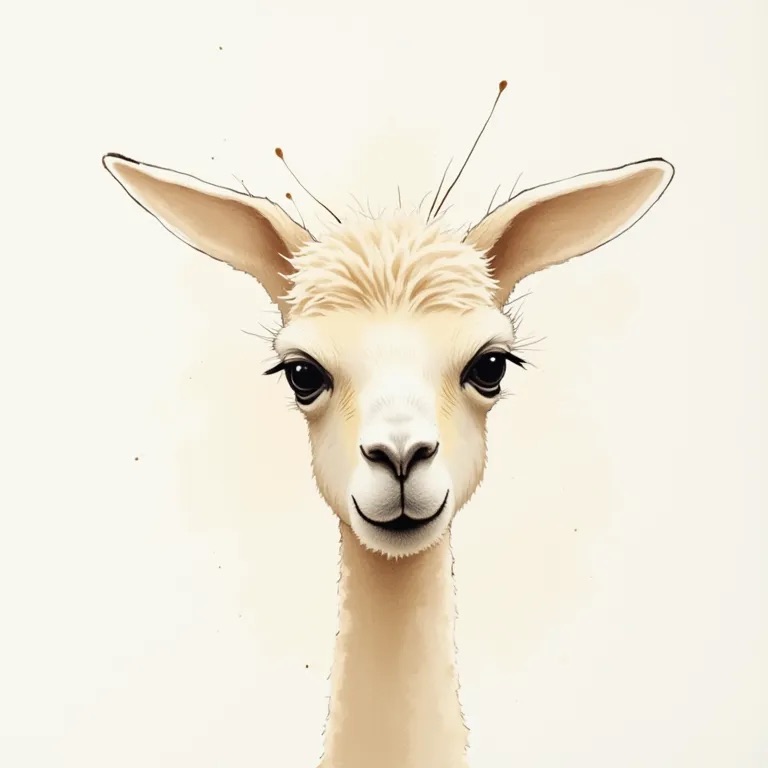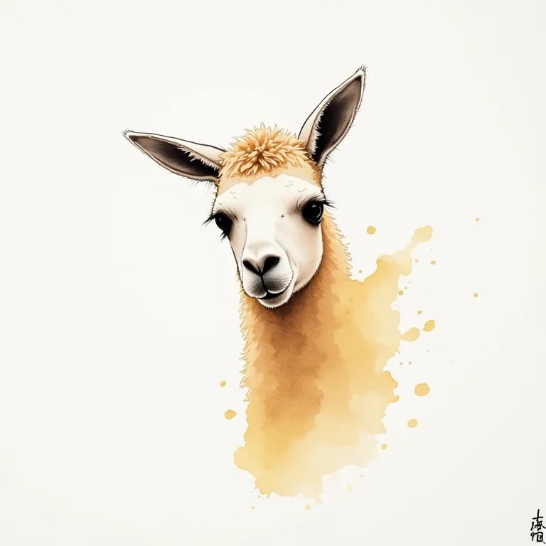 A Sumi-e Inspired Watercolor portrayal of a llama , blending traditional East Asian ink wash techniques with modern watercolor splashes. Use primarily sepia with accents of golden yellow for a minimalist yet expressive composition
