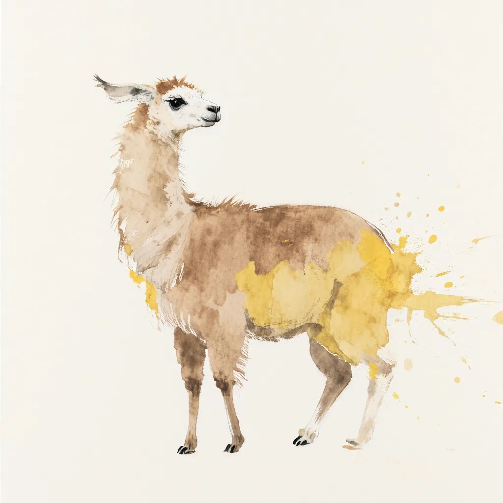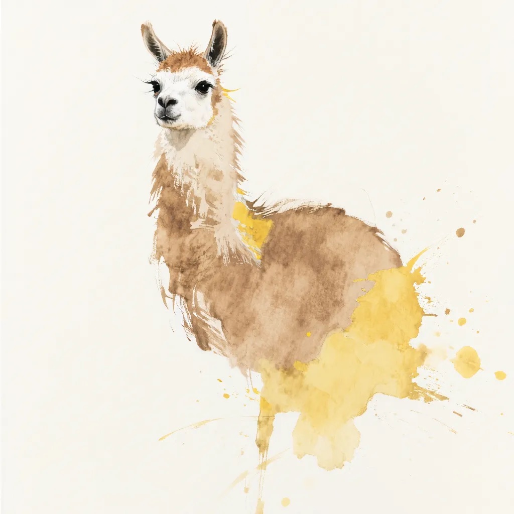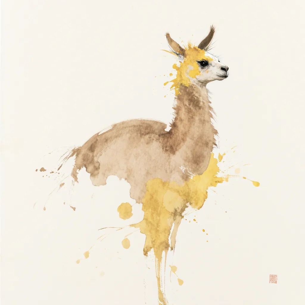 A Sumi-e Inspired Watercolor portrayal of a llama , blending traditional East Asian ink wash techniques with modern watercolor splashes. Use primarily sepia with accents of golden yellow for a minimalist yet expressive composition