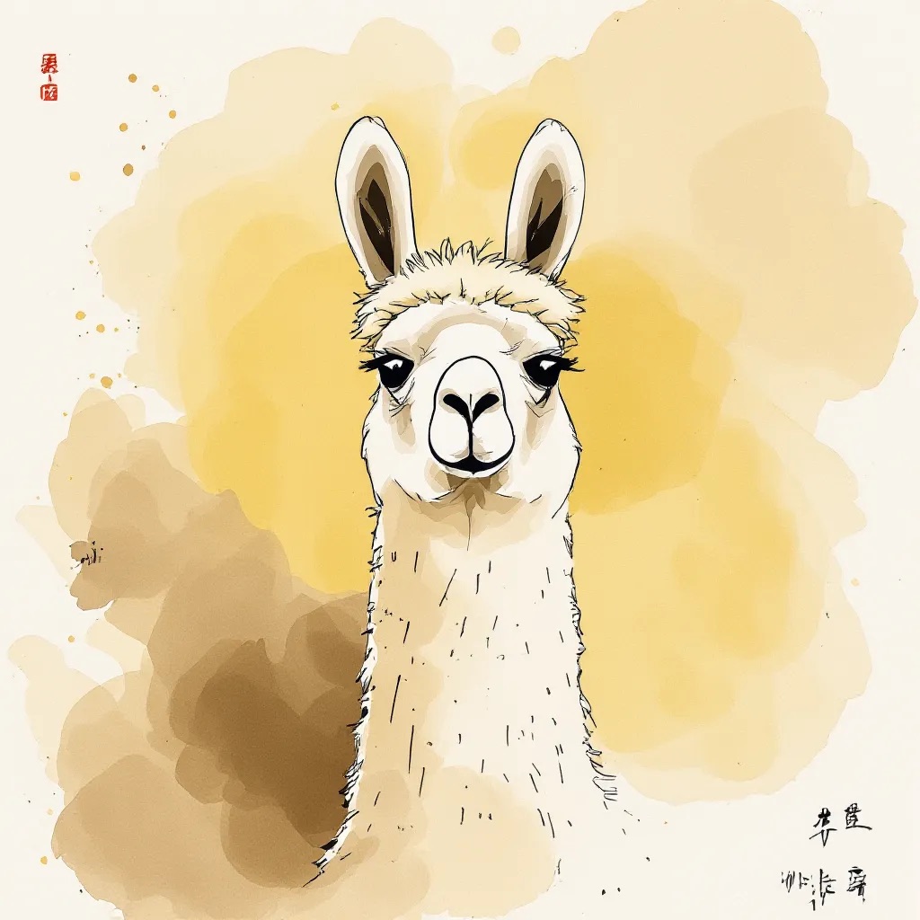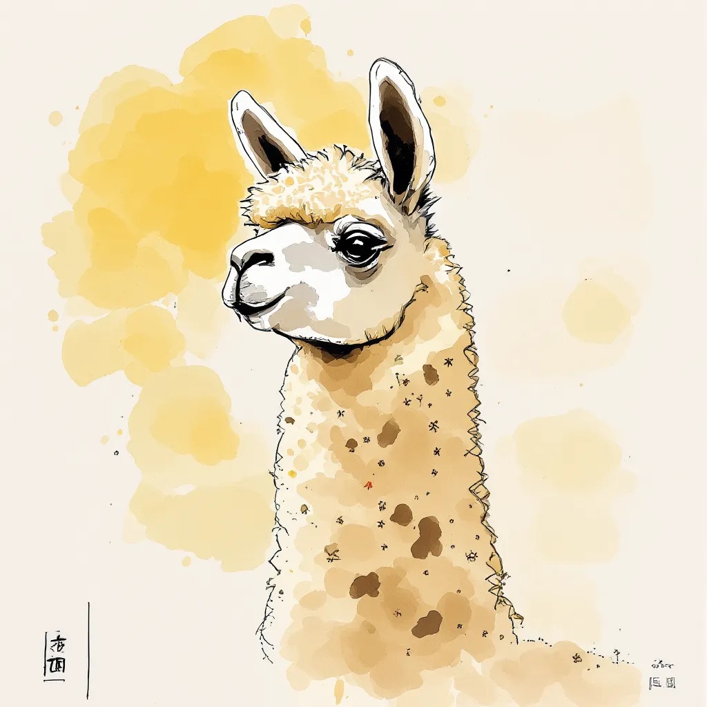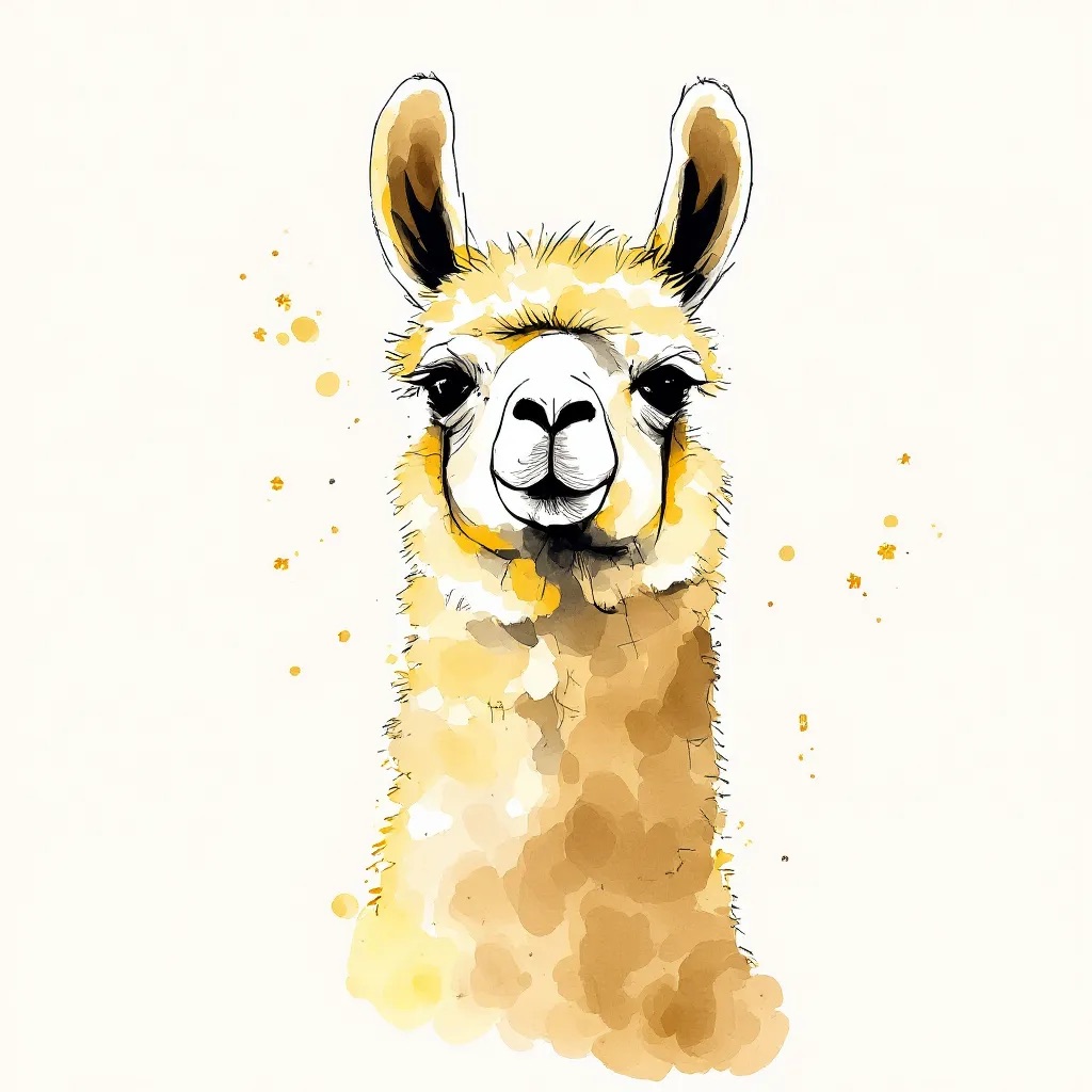 A Sumi-e Inspired Watercolor portrayal of a llama , blending traditional East Asian ink wash techniques with modern watercolor splashes. Use primarily sepia with accents of golden yellow for a minimalist yet expressive composition
