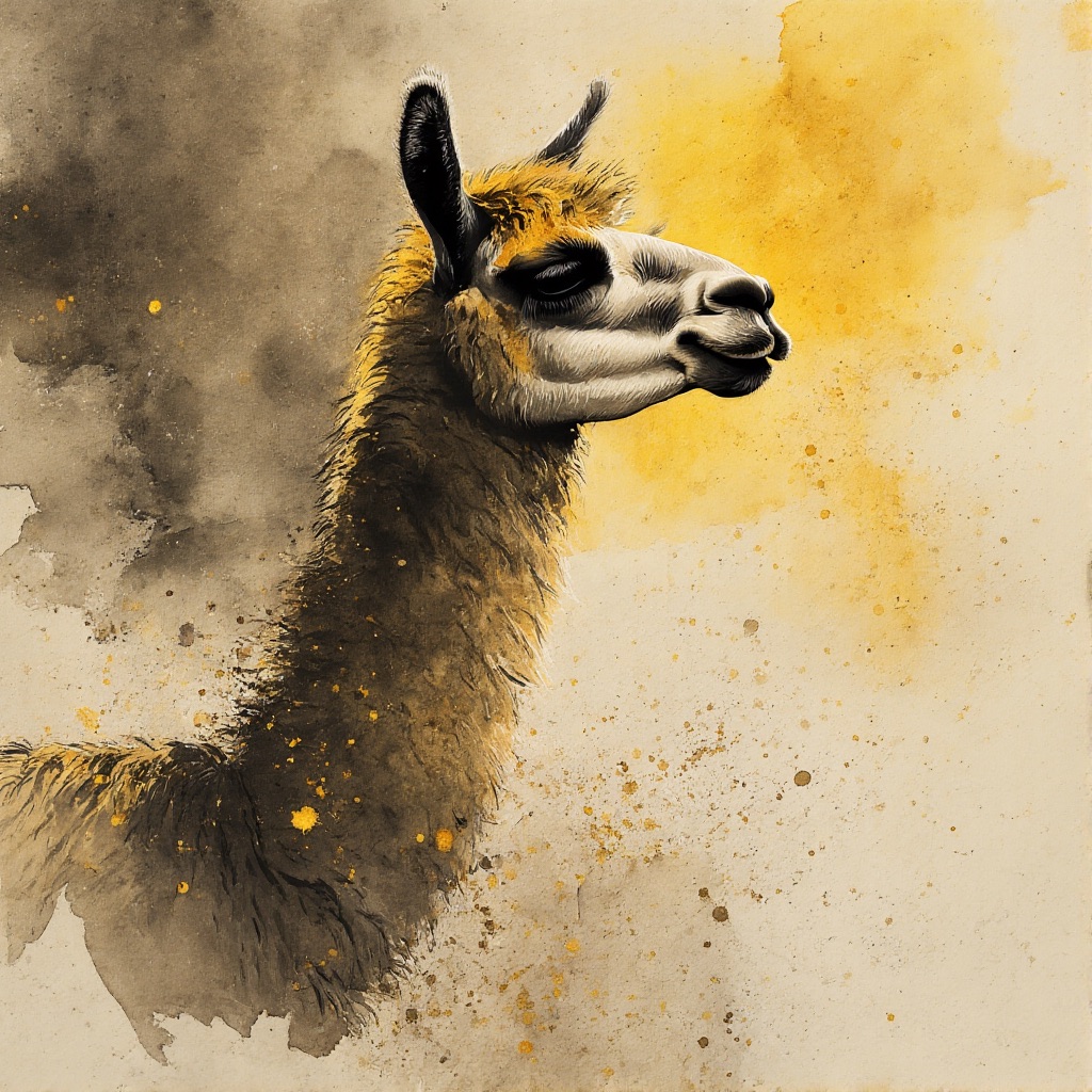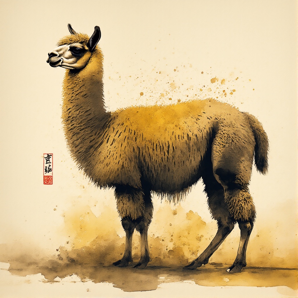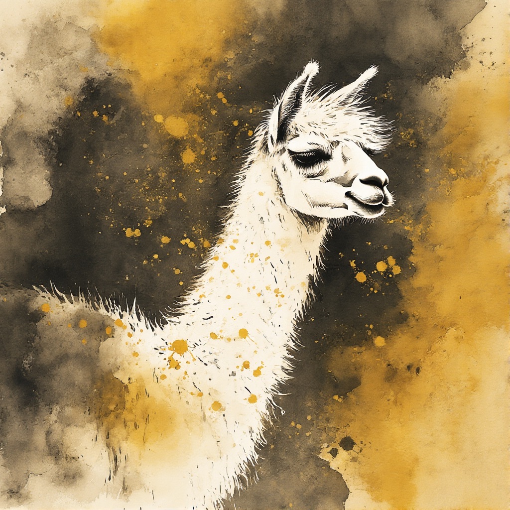 A Sumi-e Inspired Watercolor portrayal of a llama , blending traditional East Asian ink wash techniques with modern watercolor splashes. Use primarily sepia with accents of golden yellow for a minimalist yet expressive composition