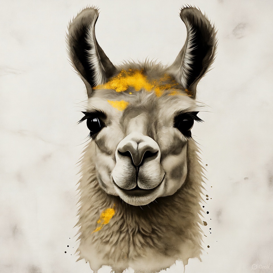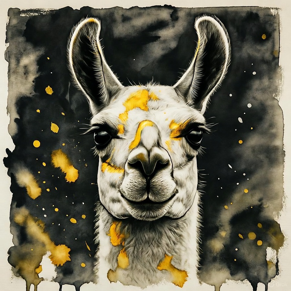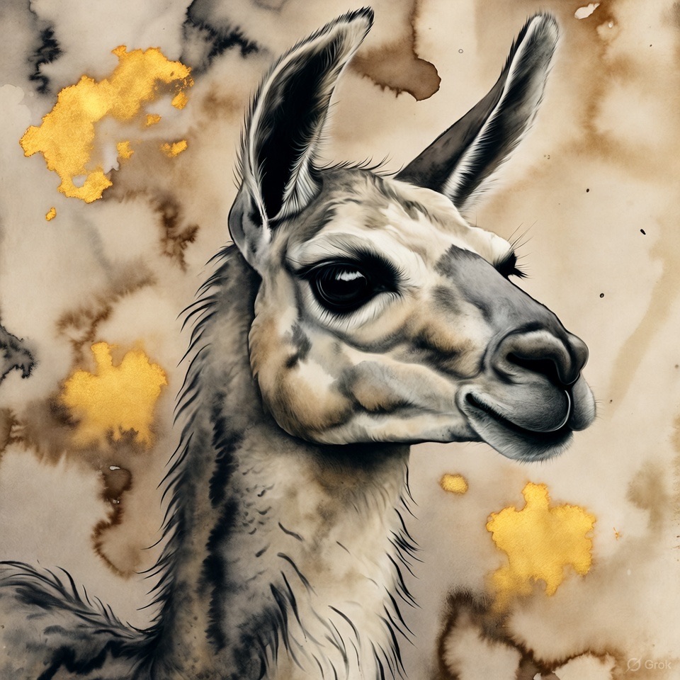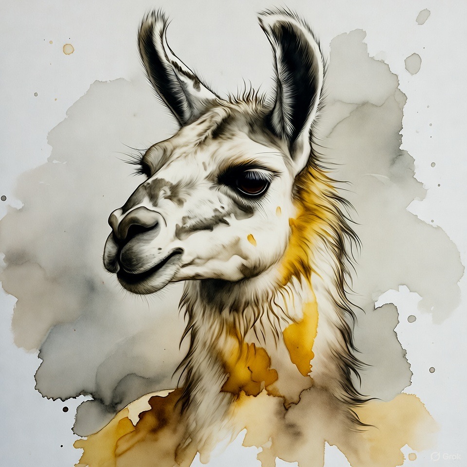 A Sumi-e Inspired Watercolor portrayal of a llama , blending traditional East Asian ink wash techniques with modern watercolor splashes. Use primarily sepia with accents of golden yellow for a minimalist yet expressive composition