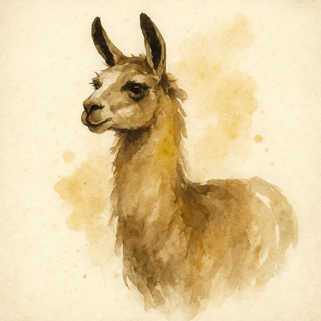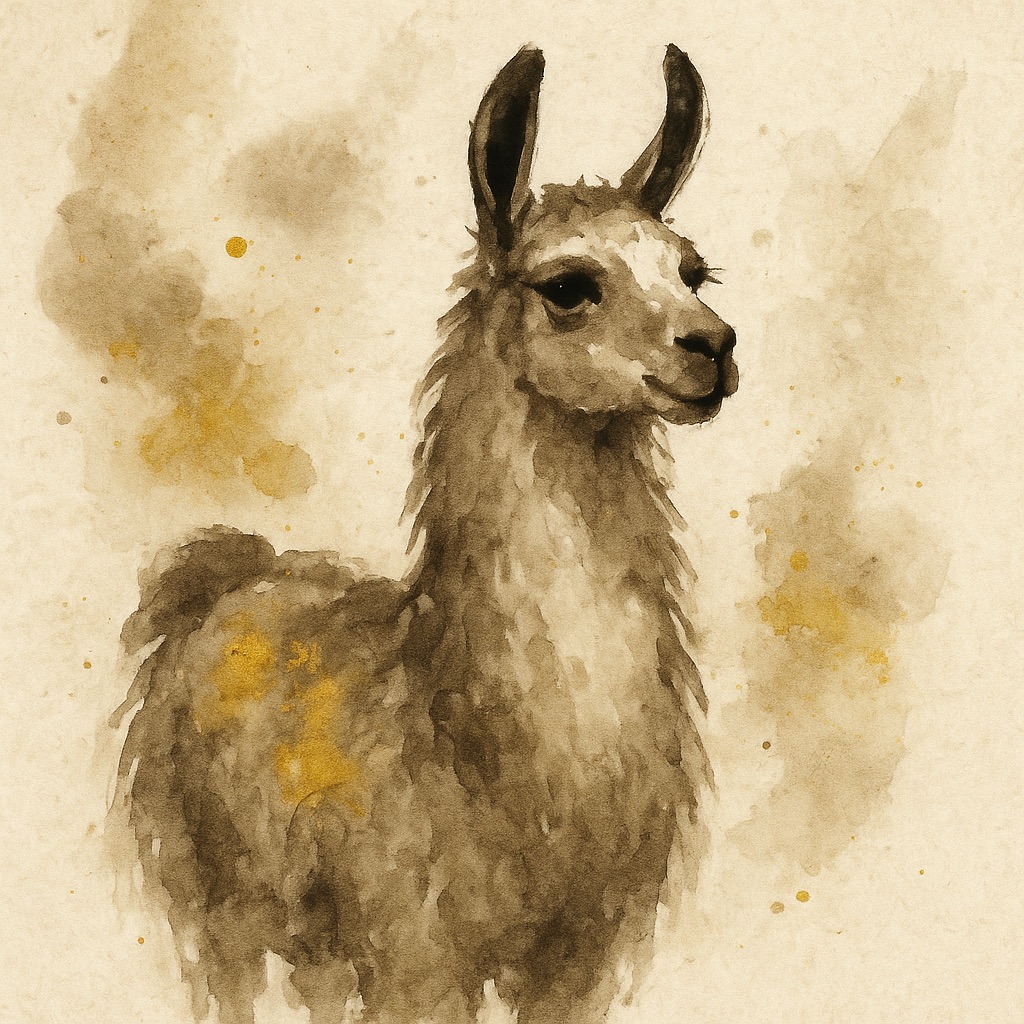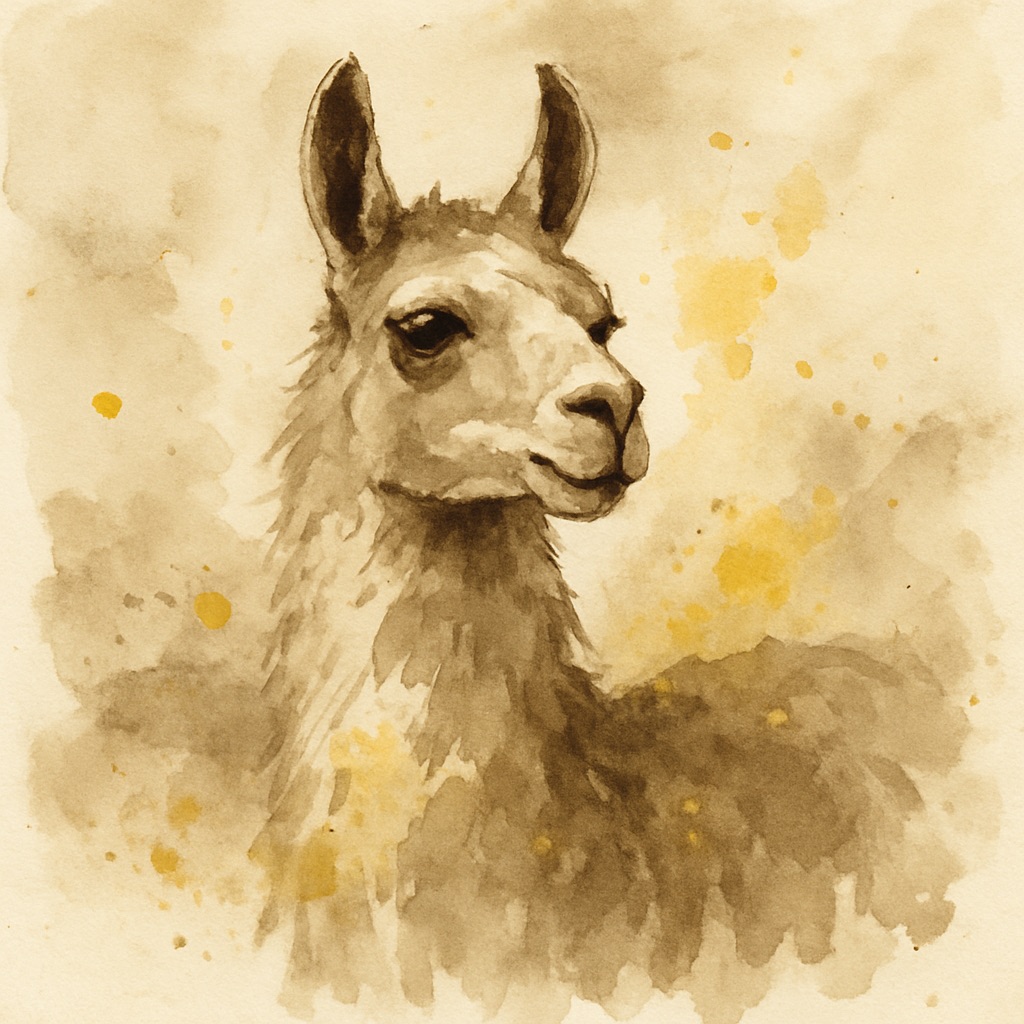 A Sumi-e Inspired Watercolor portrayal of a llama , blending traditional East Asian ink wash techniques with modern watercolor splashes. Use primarily sepia with accents of golden yellow for a minimalist yet expressive composition