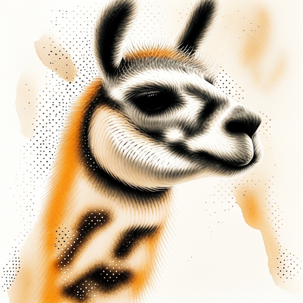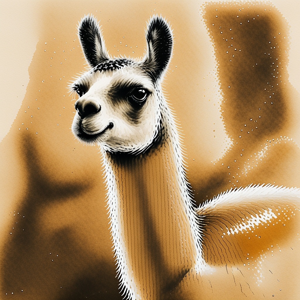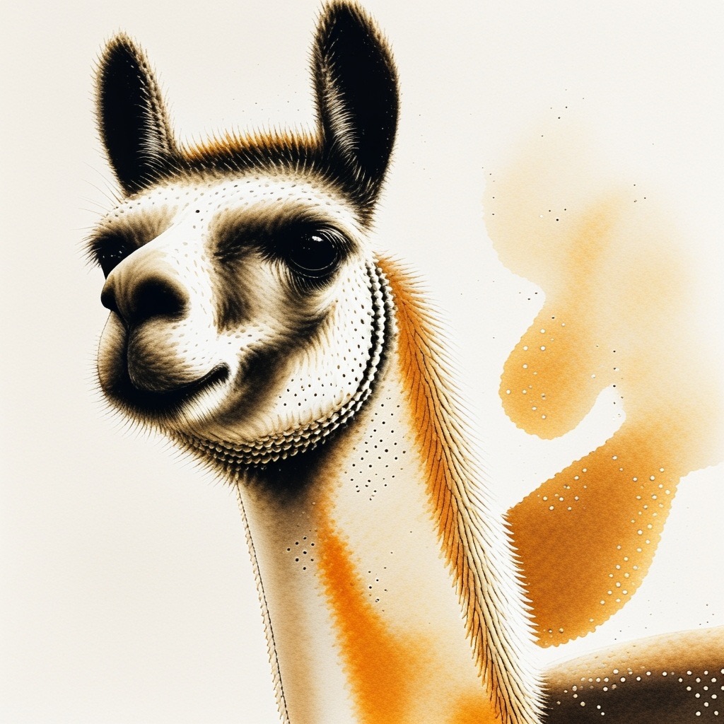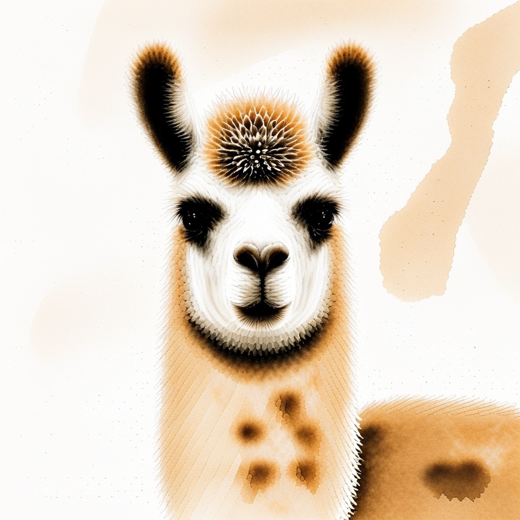 A Sumi-e Inspired Watercolor portrayal of a llama , blending traditional East Asian ink wash techniques with modern watercolor splashes. Use primarily sepia with accents of golden yellow for a minimalist yet expressive composition