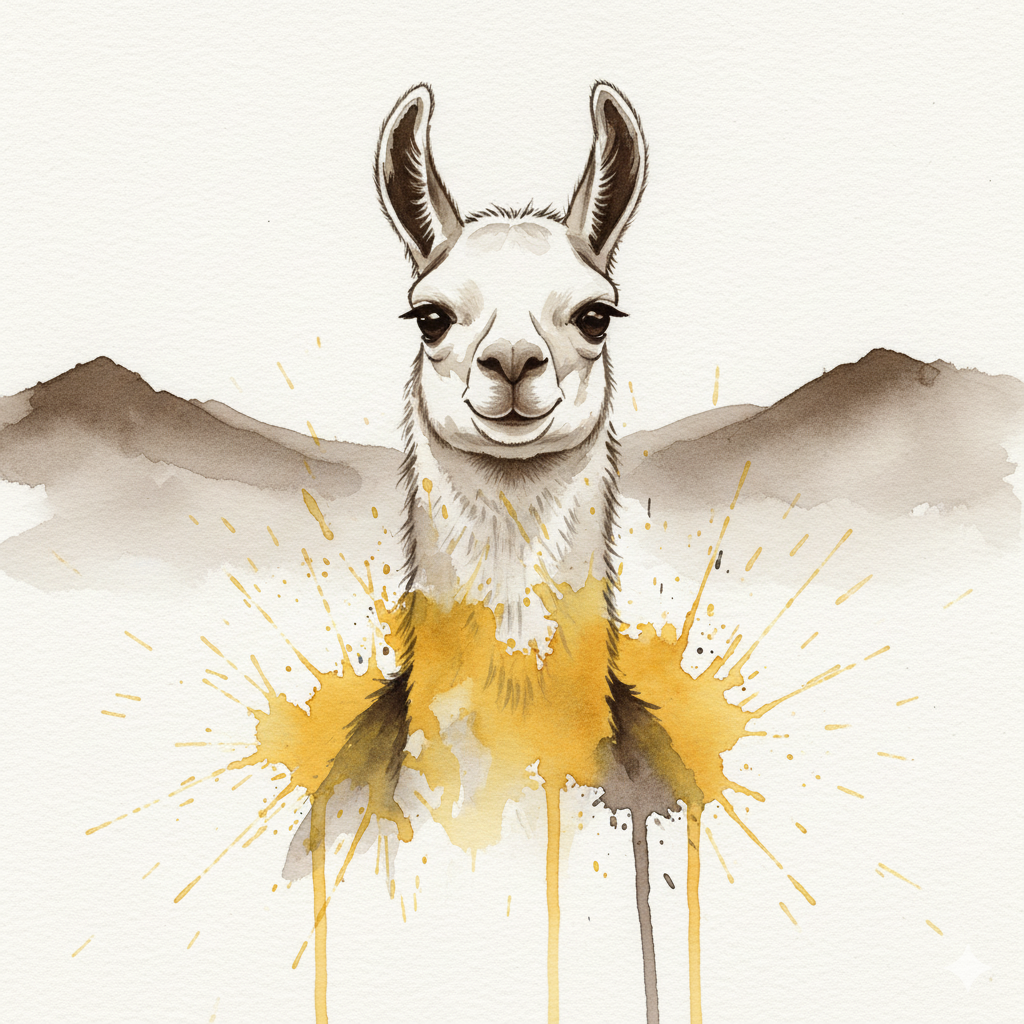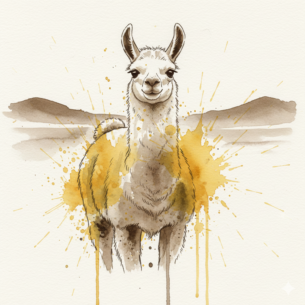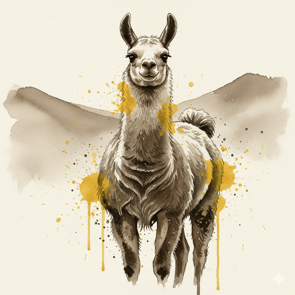 A Sumi-e Inspired Watercolor portrayal of a llama , blending traditional East Asian ink wash techniques with modern watercolor splashes. Use primarily sepia with accents of golden yellow for a minimalist yet expressive composition
