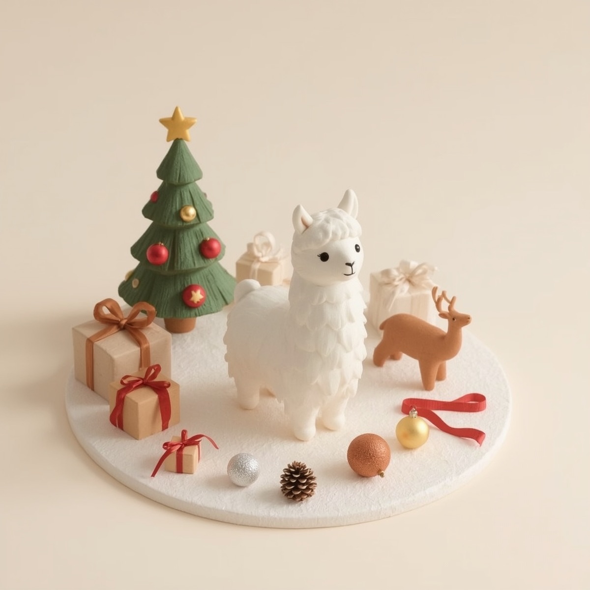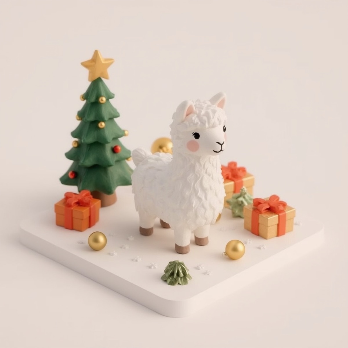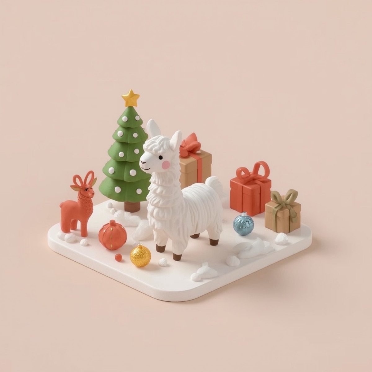 A 2.5D isometric Christmas scene in a clay style. A cute white llama is the main character, with smooth clay material and simple rounded shapes. Christmas decorations around it: a Christmas tree, gift boxes, ornaments, and light snow. Soft lighting, warm and cozy mood.Clean composition, minimal background. C4D, simple shapes, non-realistic, high quality render.