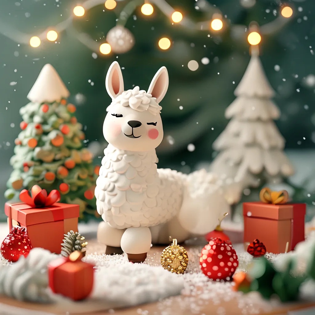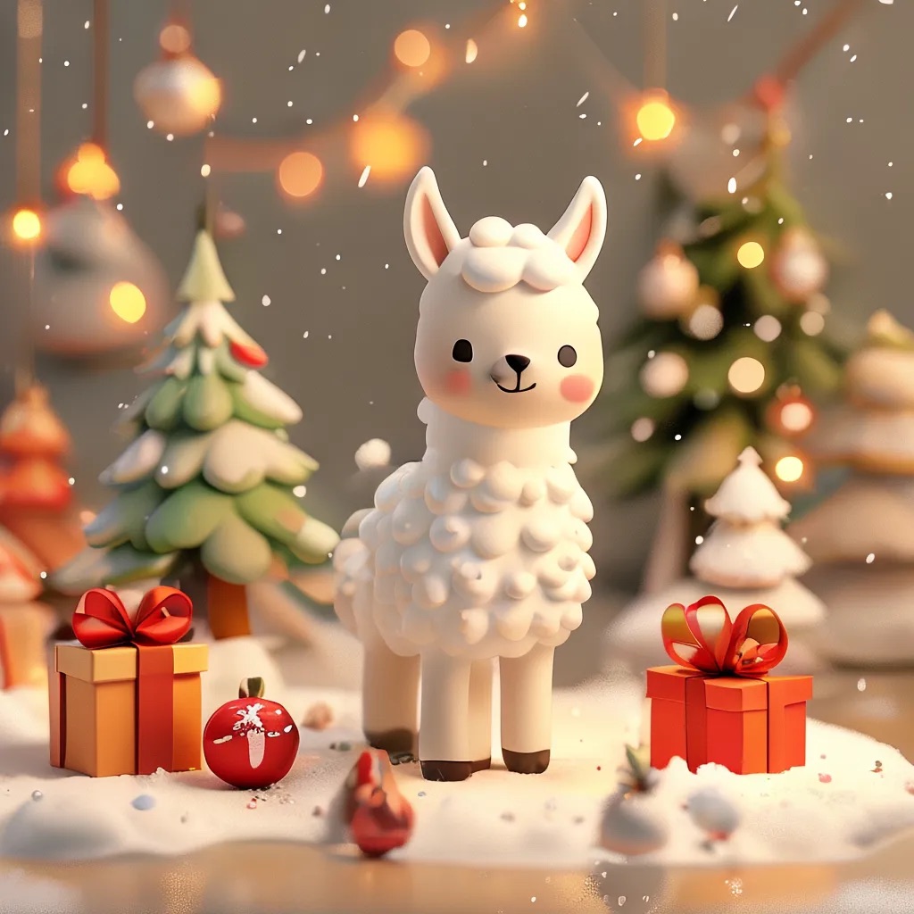 A 2.5D isometric Christmas scene in a clay style. A cute white llama is the main character, with smooth clay material and simple rounded shapes. Christmas decorations around it: a Christmas tree, gift boxes, ornaments, and light snow. Soft lighting, warm and cozy mood.Clean composition, minimal background. C4D, simple shapes, non-realistic, high quality render.