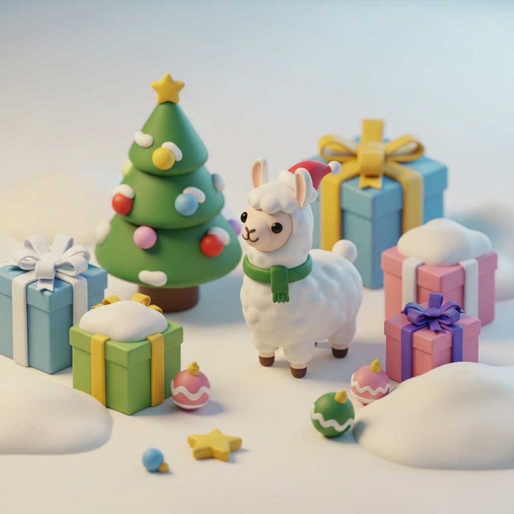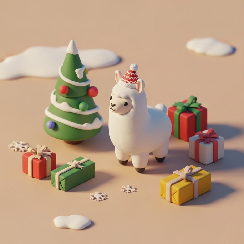 A 2.5D isometric Christmas scene in a clay style. A cute white llama is the main character, with smooth clay material and simple rounded shapes. Christmas decorations around it: a Christmas tree, gift boxes, ornaments, and light snow. Soft lighting, warm and cozy mood.Clean composition, minimal background. C4D, simple shapes, non-realistic, high quality render.