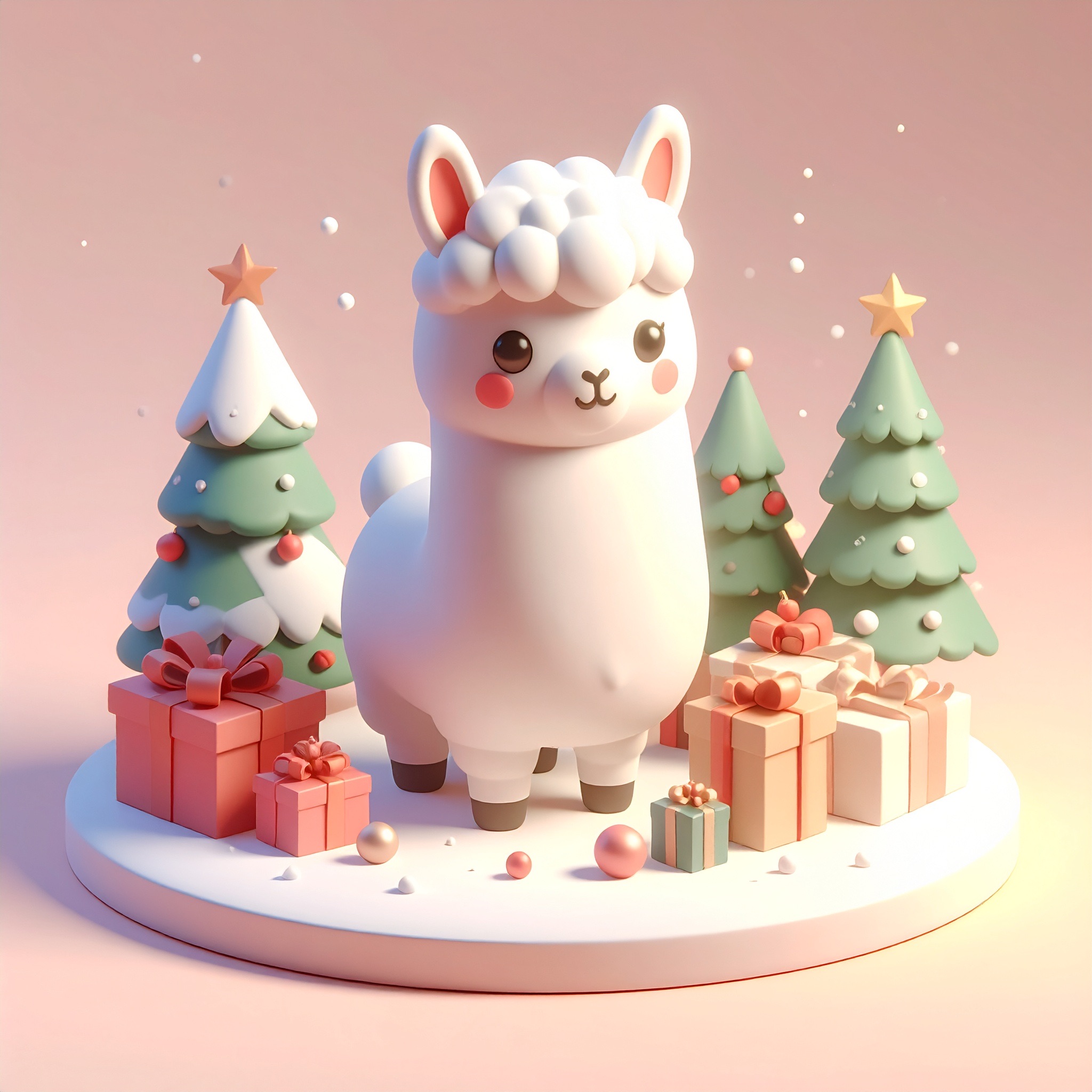 A 2.5D isometric Christmas scene in a clay style. A cute white llama is the main character, with smooth clay material and simple rounded shapes. Christmas decorations around it: a Christmas tree, gift boxes, ornaments, and light snow. Soft lighting, warm and cozy mood.Clean composition, minimal background. C4D, simple shapes, non-realistic, high quality render.