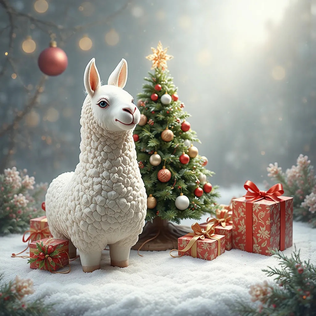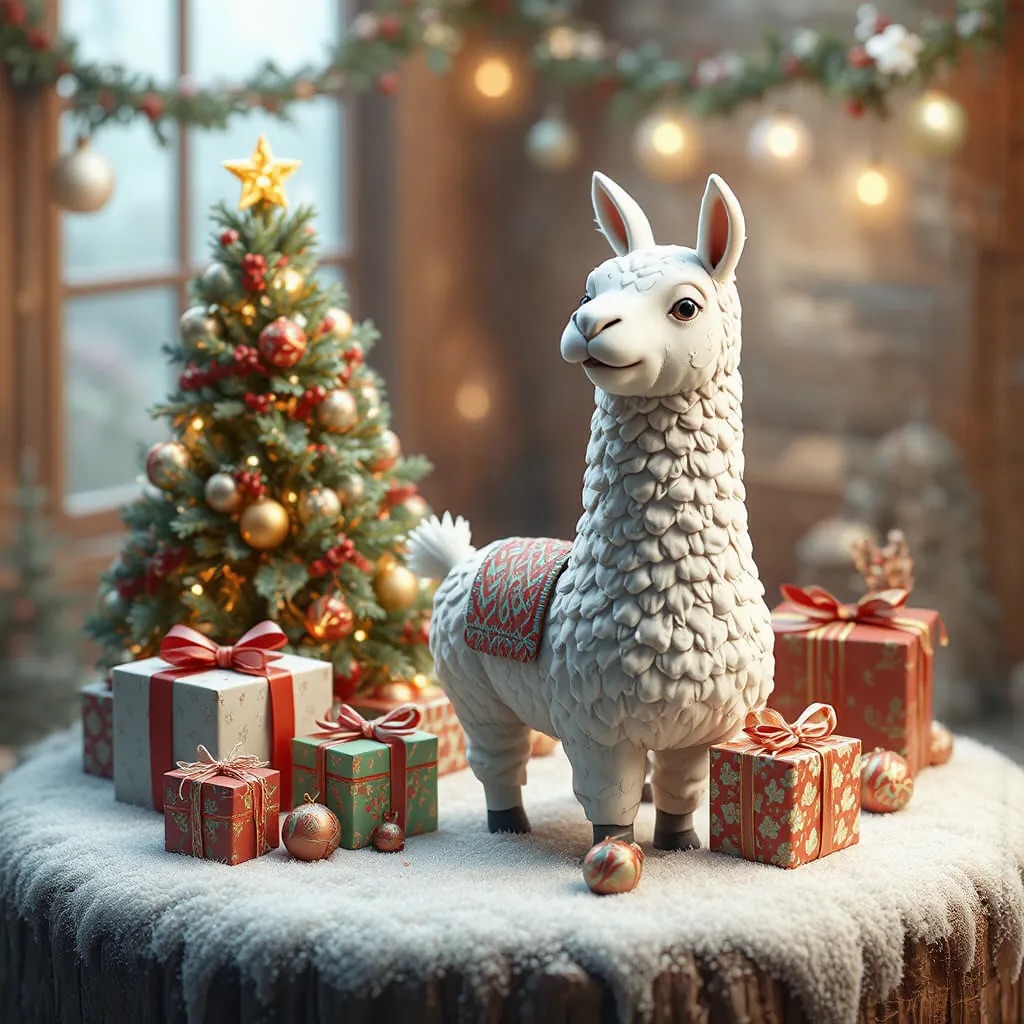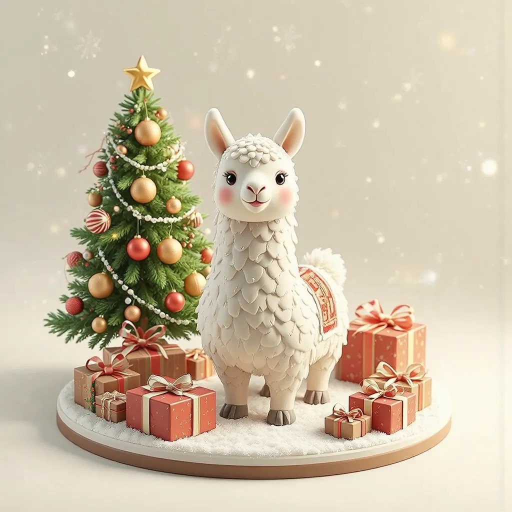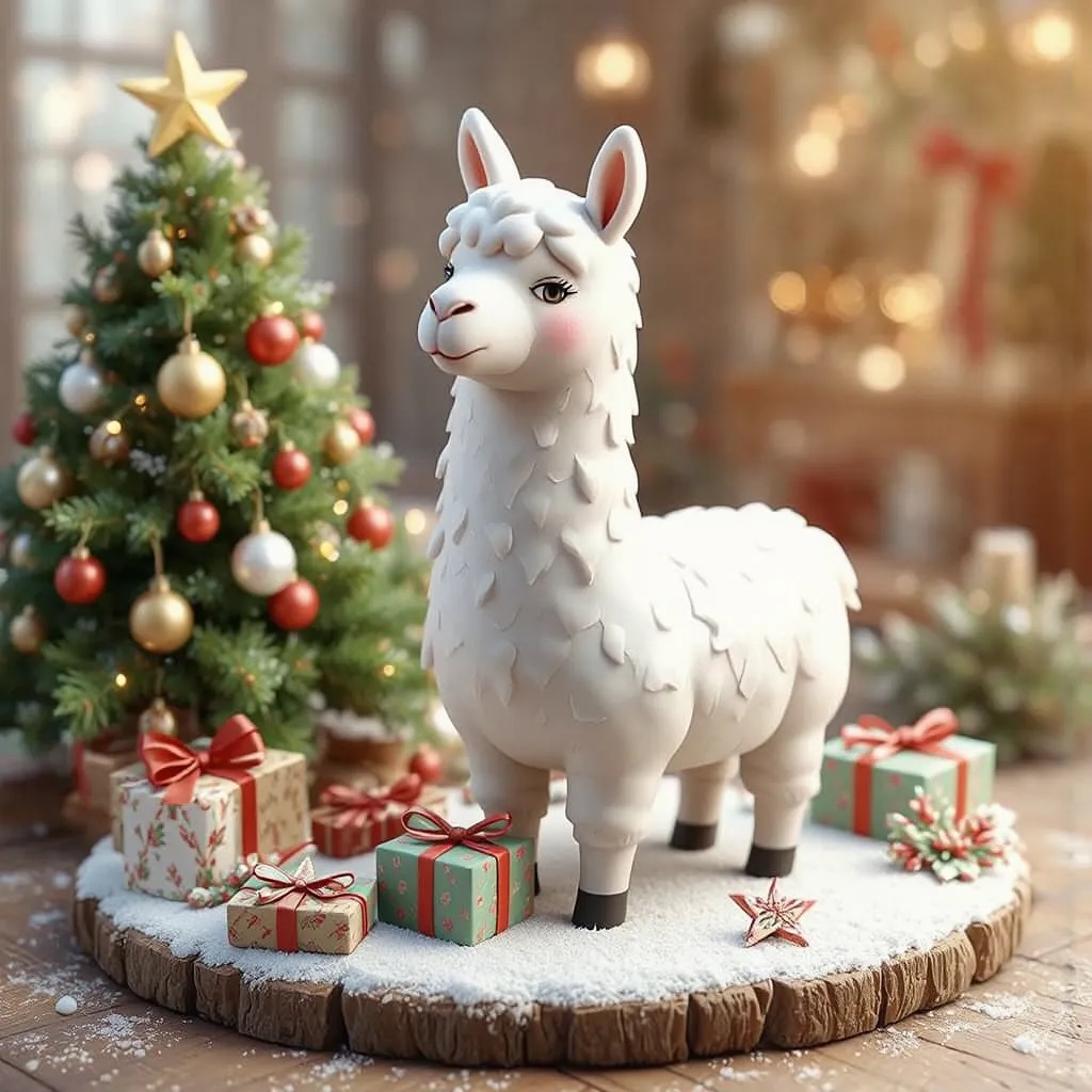 A 2.5D isometric Christmas scene in a clay style. A cute white llama is the main character, with smooth clay material and simple rounded shapes. Christmas decorations around it: a Christmas tree, gift boxes, ornaments, and light snow. Soft lighting, warm and cozy mood.Clean composition, minimal background. C4D, simple shapes, non-realistic, high quality render.