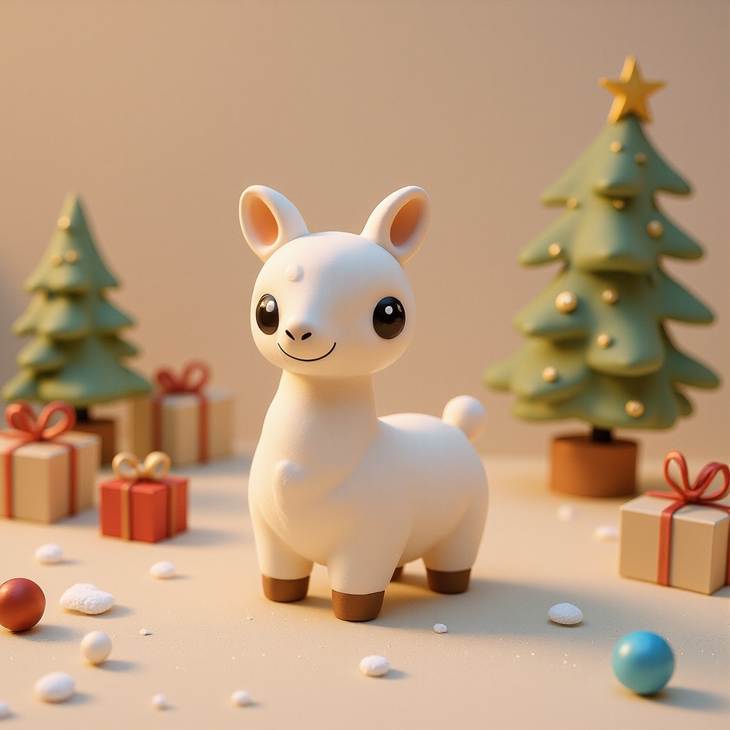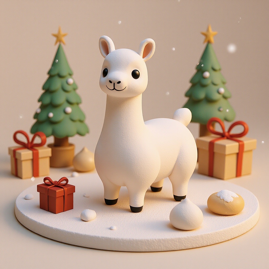 A 2.5D isometric Christmas scene in a clay style. A cute white llama is the main character, with smooth clay material and simple rounded shapes. Christmas decorations around it: a Christmas tree, gift boxes, ornaments, and light snow. Soft lighting, warm and cozy mood.Clean composition, minimal background. C4D, simple shapes, non-realistic, high quality render.